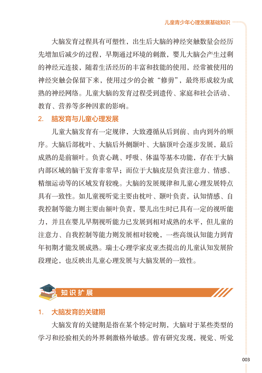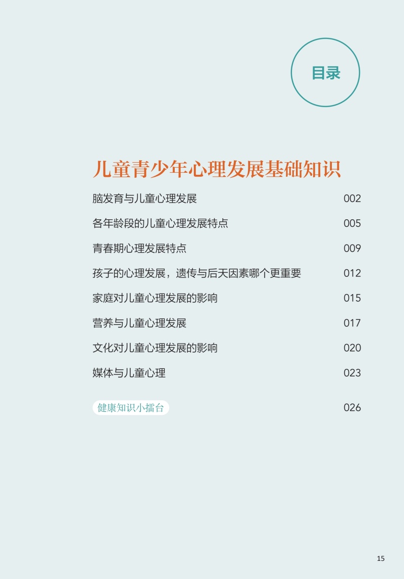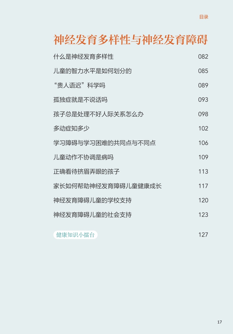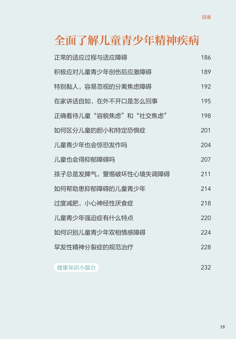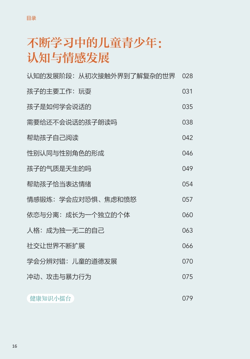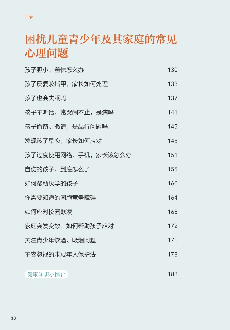 本册核心科普知识共五章。**章为儿童青少年心理发展基础知识,介绍了儿童青少年不同年龄段的心理发展特点、影响因素等;**章从孩子是如何学会说话的、性别认同与性别角色的形成、依恋与分离、人格等方面介绍了儿童青少年的认知与情感发展;第三章为神经发育多样性与神经发育障碍,介绍了孤独症谱系障碍、多动症、抽动障碍、学习障碍、神经发育障碍等相关知识;第四章为困扰儿童青少年及其家庭的常见心理问题,包括孩子厌学、自伤、过度使用网络,同胞竞争、校园欺凌/霸凌、家庭突发变故等;第五章为儿童青少年精神疾病介绍,如神经性厌食、双相情感障碍、早发性精神分裂症等。