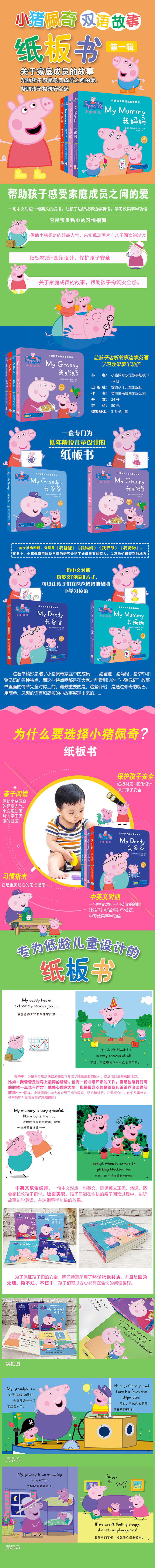 小猪佩奇双语故事纸板书(套装4册) 帮助孩子感受家庭成员之间的爱,帮助孩子构筑安全感。中英文对照,让孩子边听故事边学英语。