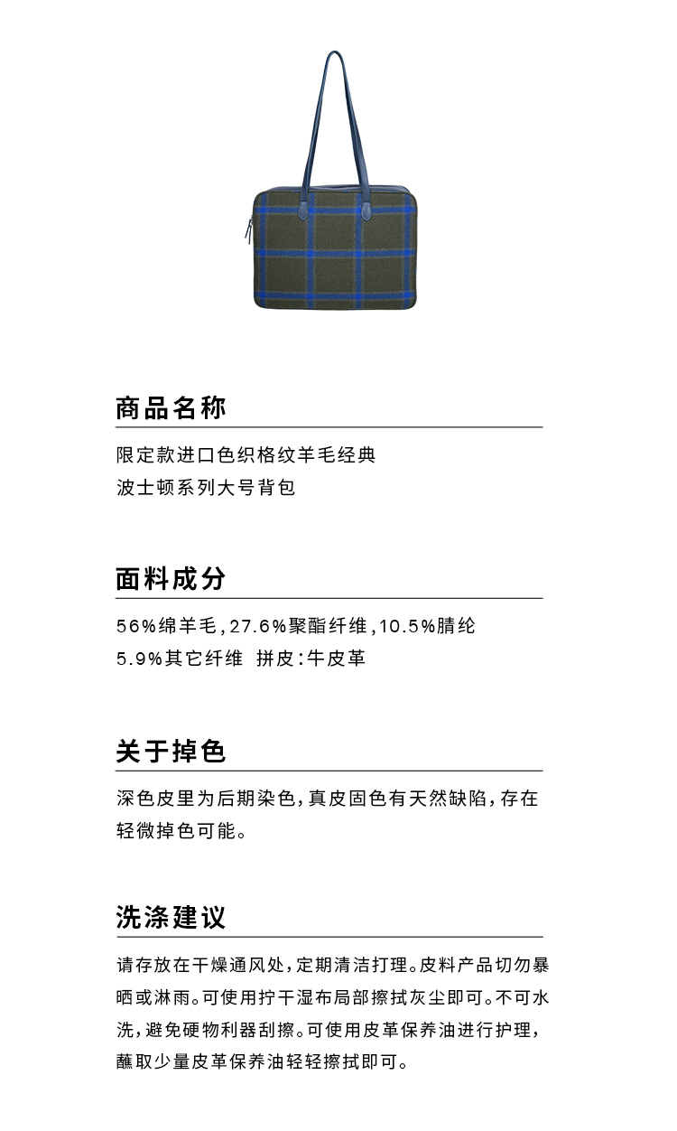 HIDEMI【麦子同款】限定款进口色织格纹羊毛经典波士顿系列大号背包