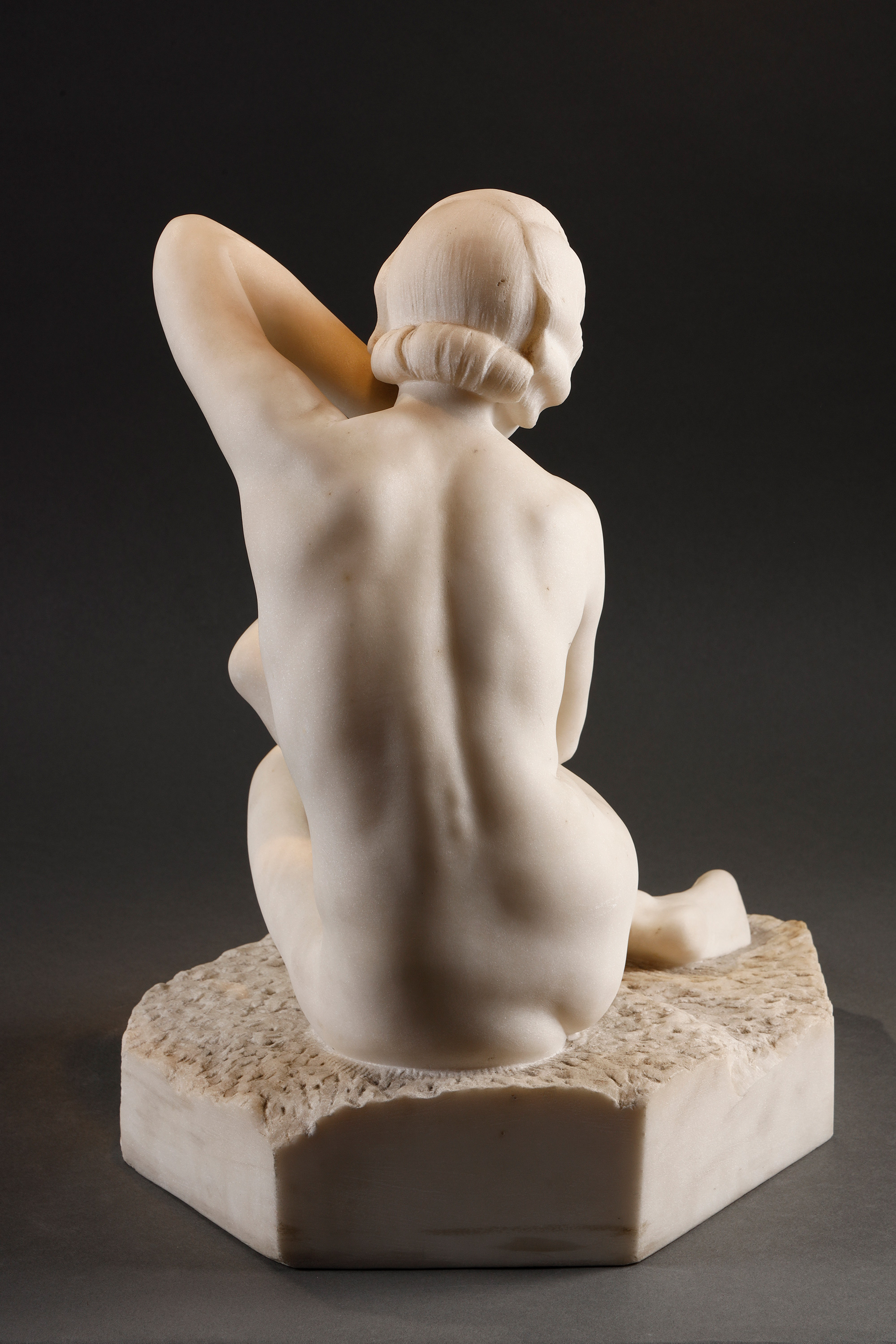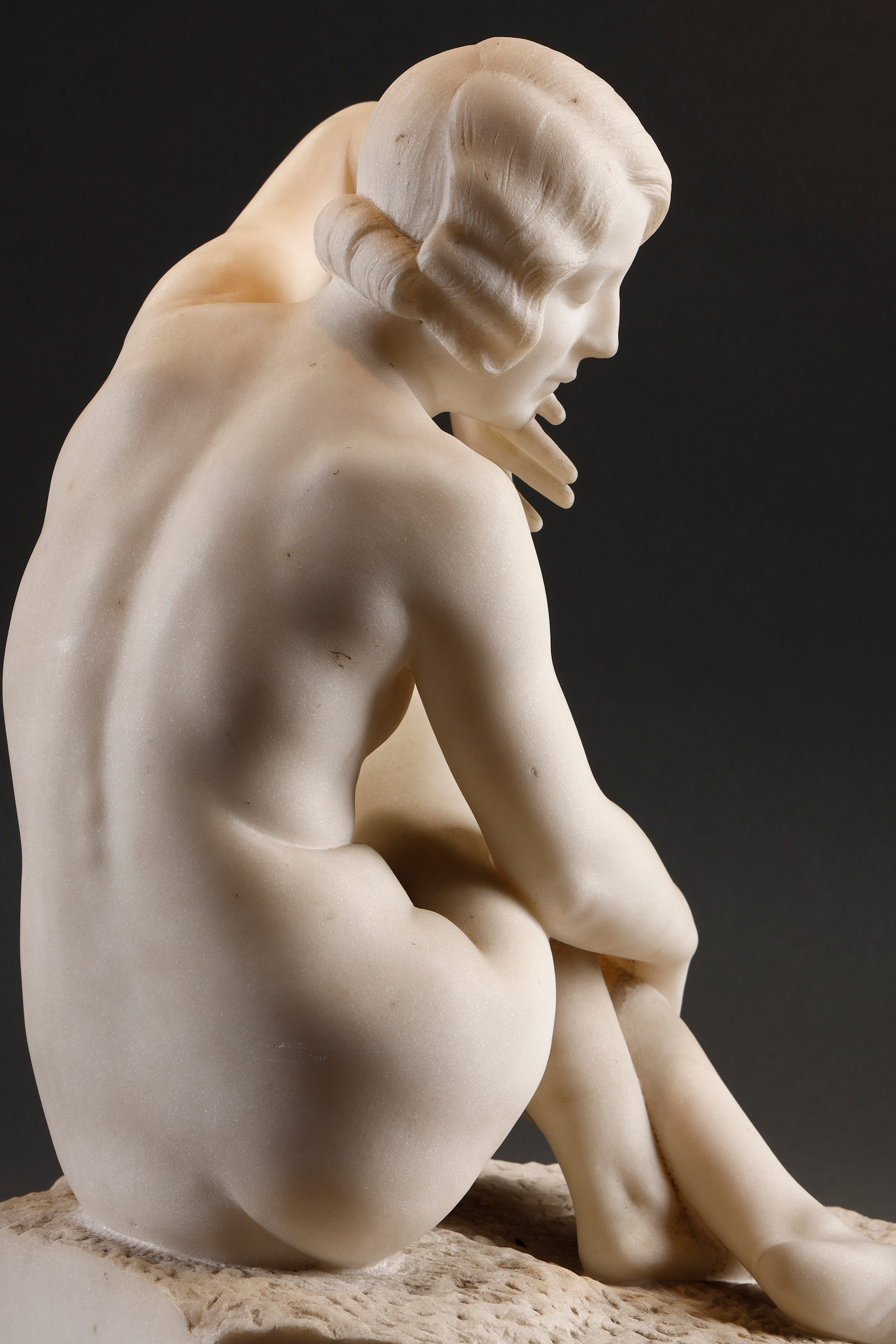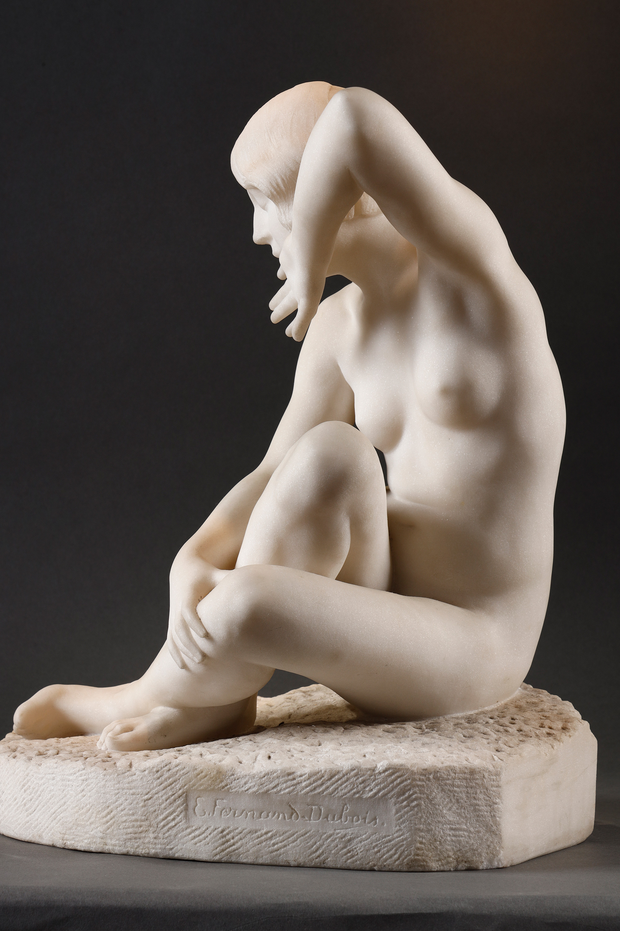 19世纪末至20世纪初比利时雕塑家Fernand Dubois签名出品卡拉拉大理石精雕人物雕塑《坐姿少女》