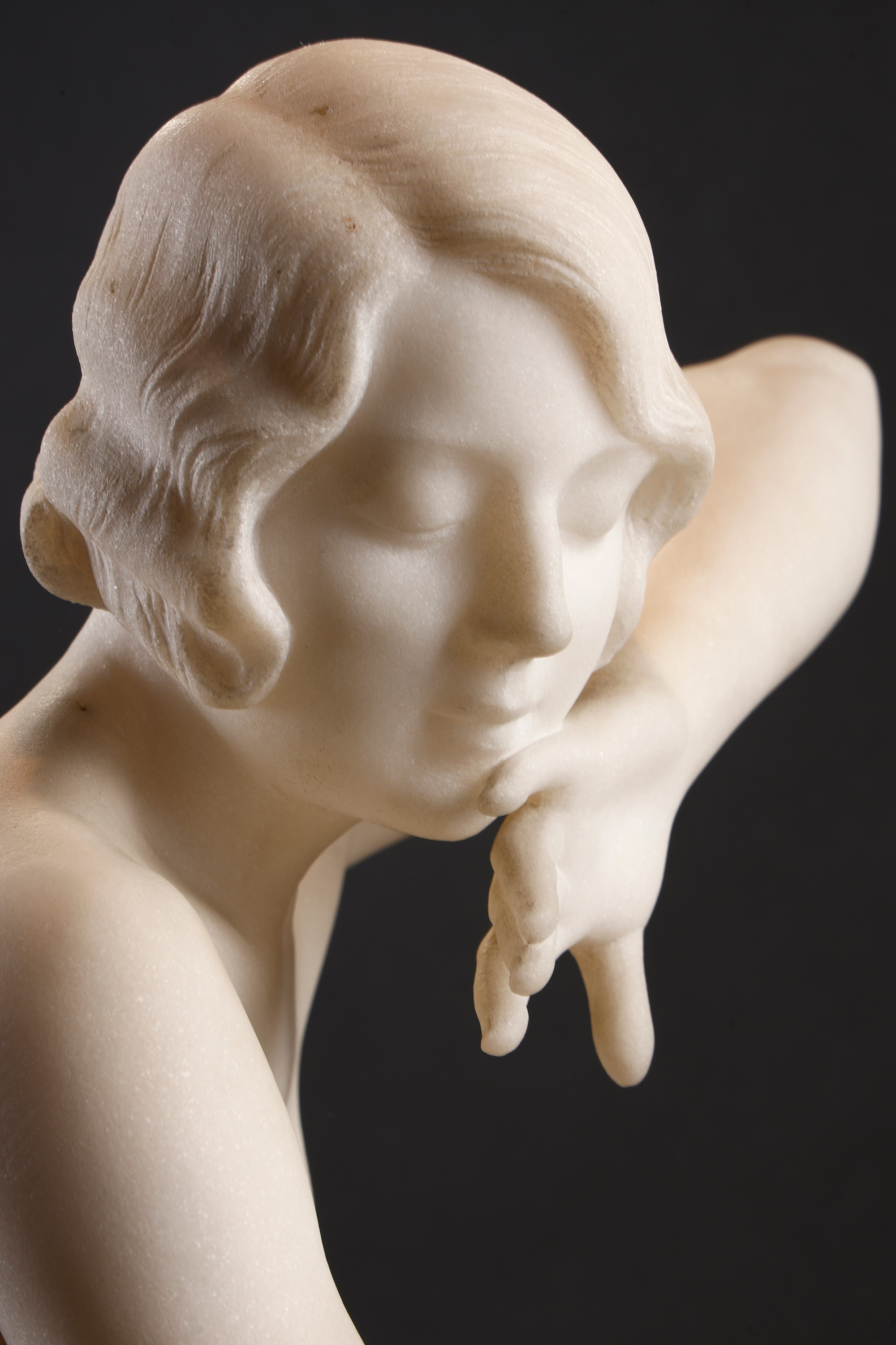 独角鹿西洋古董19世纪末至20世纪初比利时雕塑家Fernand Dubois签名出品卡拉拉大理石精雕人物雕塑《坐姿少女》