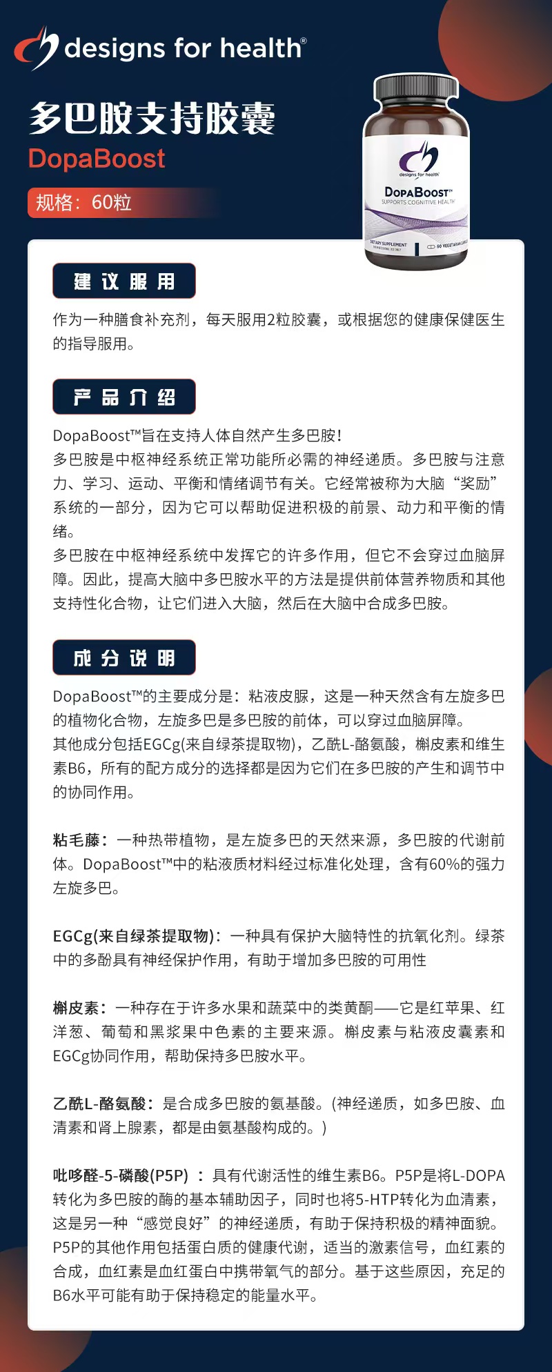 【多巴胺提升因子配方】DopaBoost 60粒 左旋多巴 穿过血脑屏障 含绿茶萃取EGCG+乙酰L-酪氨酸+槲皮素+维生素B6 注意力ADHD 健康设计DFH