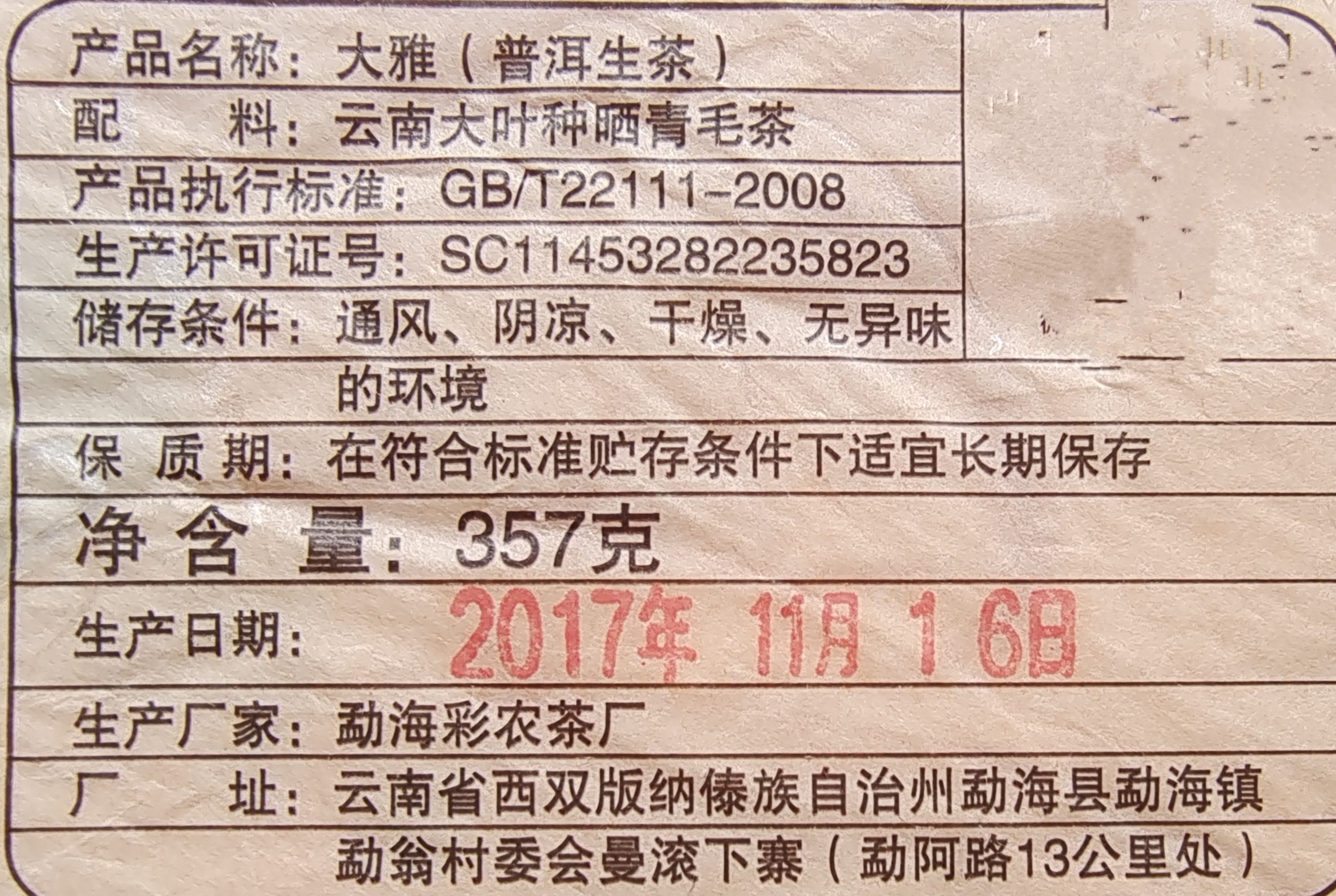 大雅原料精选与刮风寨、铜箐河、弯弓、薄荷塘等一线顶级山头齐名的易武古曼撒核心区国有林里的古树鲜叶,彩农核心工艺全手工、全程不落地匠心制造而成。代表着易武一线dj发烧品质。
