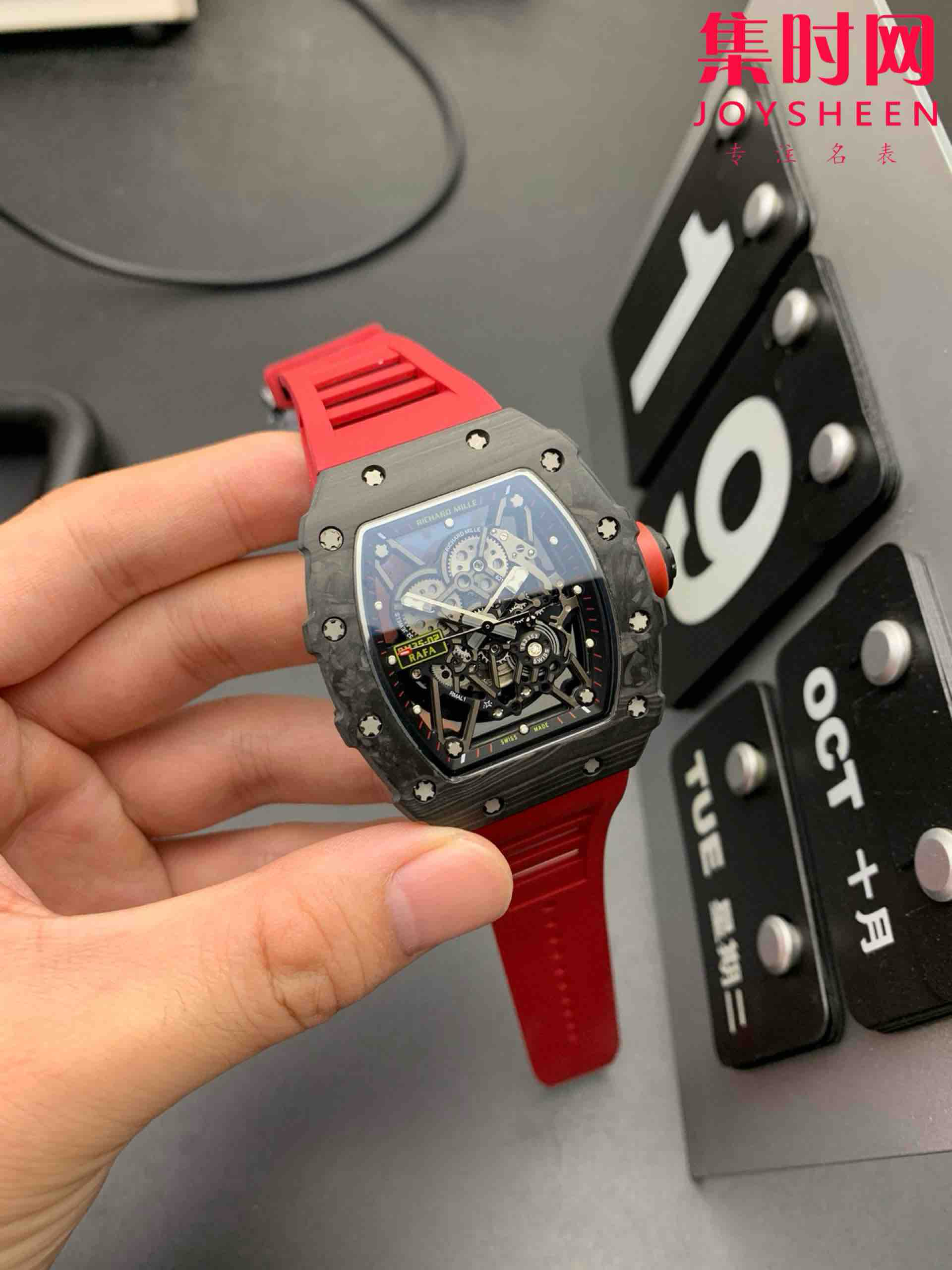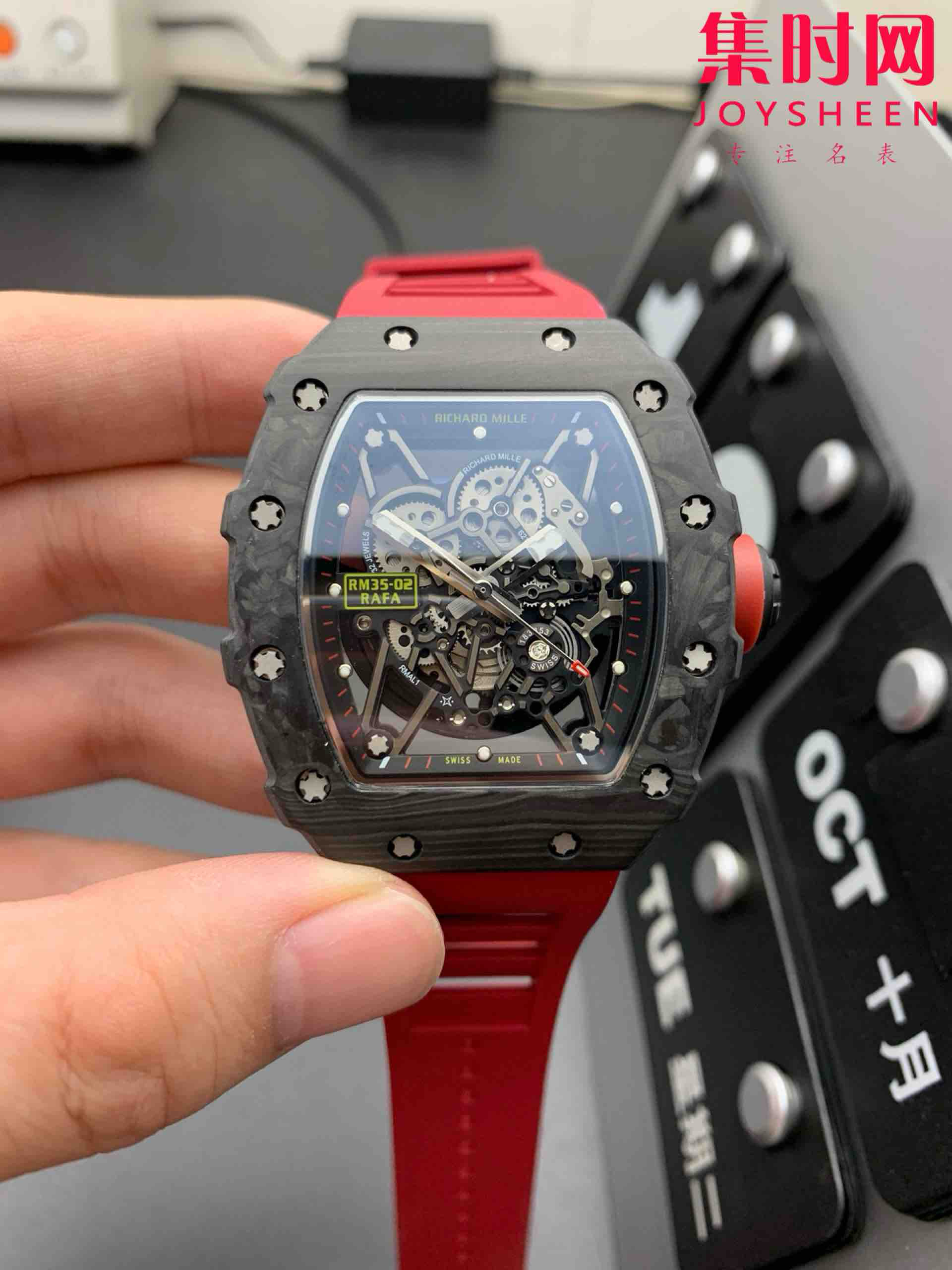 KV理查德米勒RM35-02系列 男士腕表 表壳和底盖釆用高密度进口NTPT碳纤维材料 碳纤维表壳表底和钛内胆两侧釆用同步CNC加工!使之壳上下与左右二侧毫无缝隙,经试水测试4Pa压力后均达到100%通过防水检验 表带釆用马来西亚进口纯橡胶材料制作而成,使之呈现出超韧性及柔软的感觉,市面上最强的RM专用橡胶带,做到能与正品互换的效果 依原版原理采用钛金属材料作为内胆及釆用最前沿的电火花精切缕空技术!机芯釆用进口全自动机械机芯 表壳底上的字使用最前沿的超声波精准雕刻技术,使表底整体呈现岀高贵的质感 玻璃釆用目前市面上最高硬度的蓝宝石水晶玻璃材料及双面镀蓝膜处理 每只腕表底盖上都有独立的编码!与原版一致的流水编码。