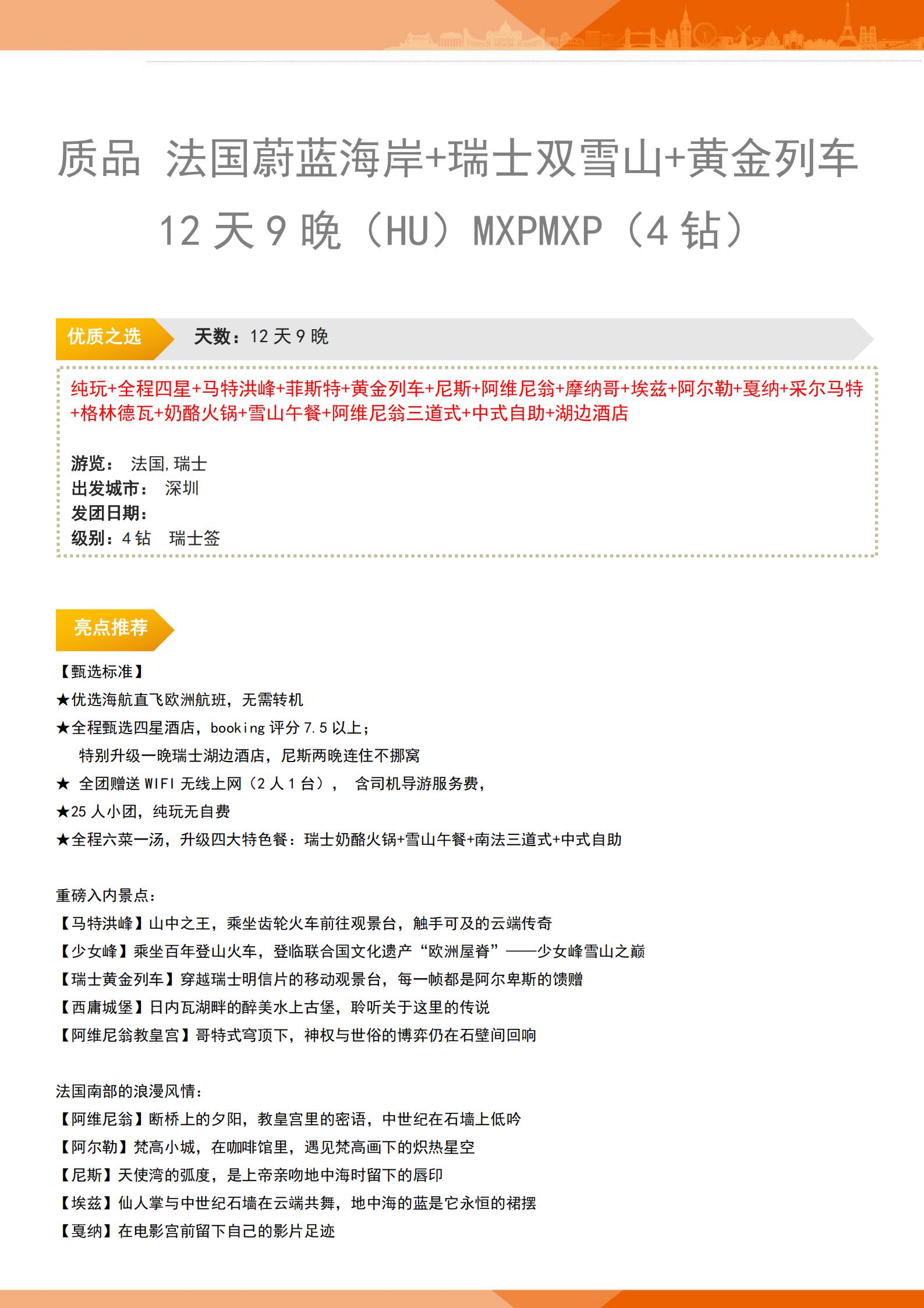 【暑假、国庆】<法国+瑞士12天9晚纯玩(25人小团)>深圳直飞+全程四星+马特洪峰+菲斯特+黄金列车+尼斯+阿维尼翁+摩纳哥+埃兹+阿尔勒+戛纳+采尔马特+格林德瓦+雪山午餐+湖边酒店