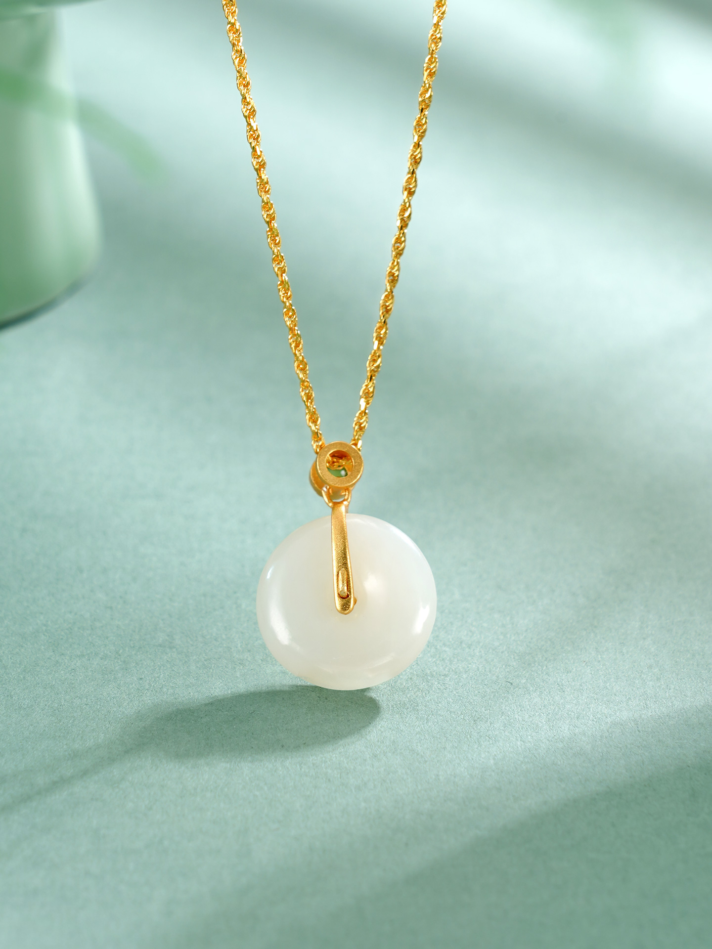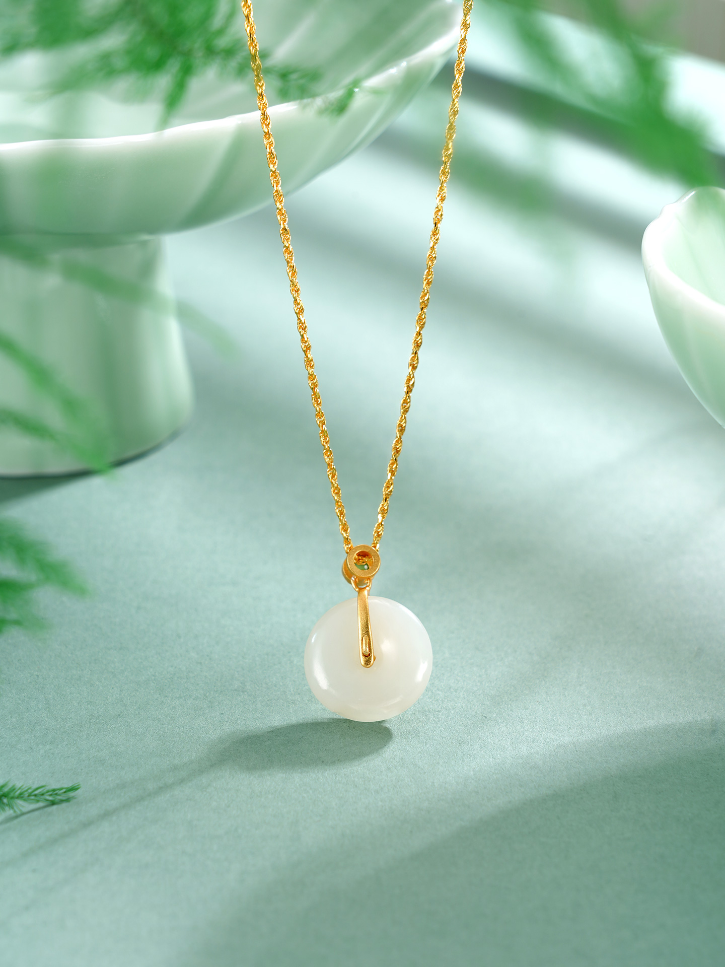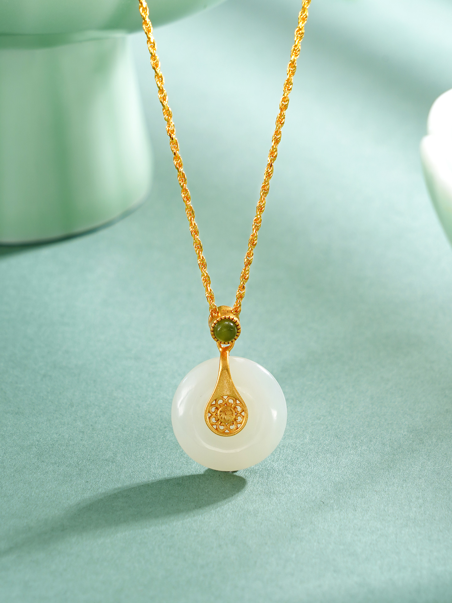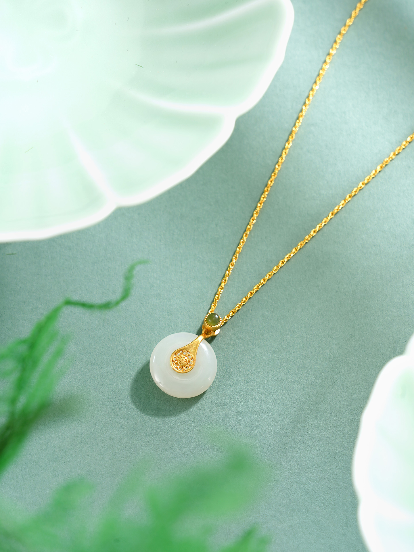 【寓意】:平安扣象征平安顺遂、圆满和谐,花朵纹代表明媚与富贵。作品采用花朵镶嵌平安扣的设计,象征繁花相扣,富贵无忧。