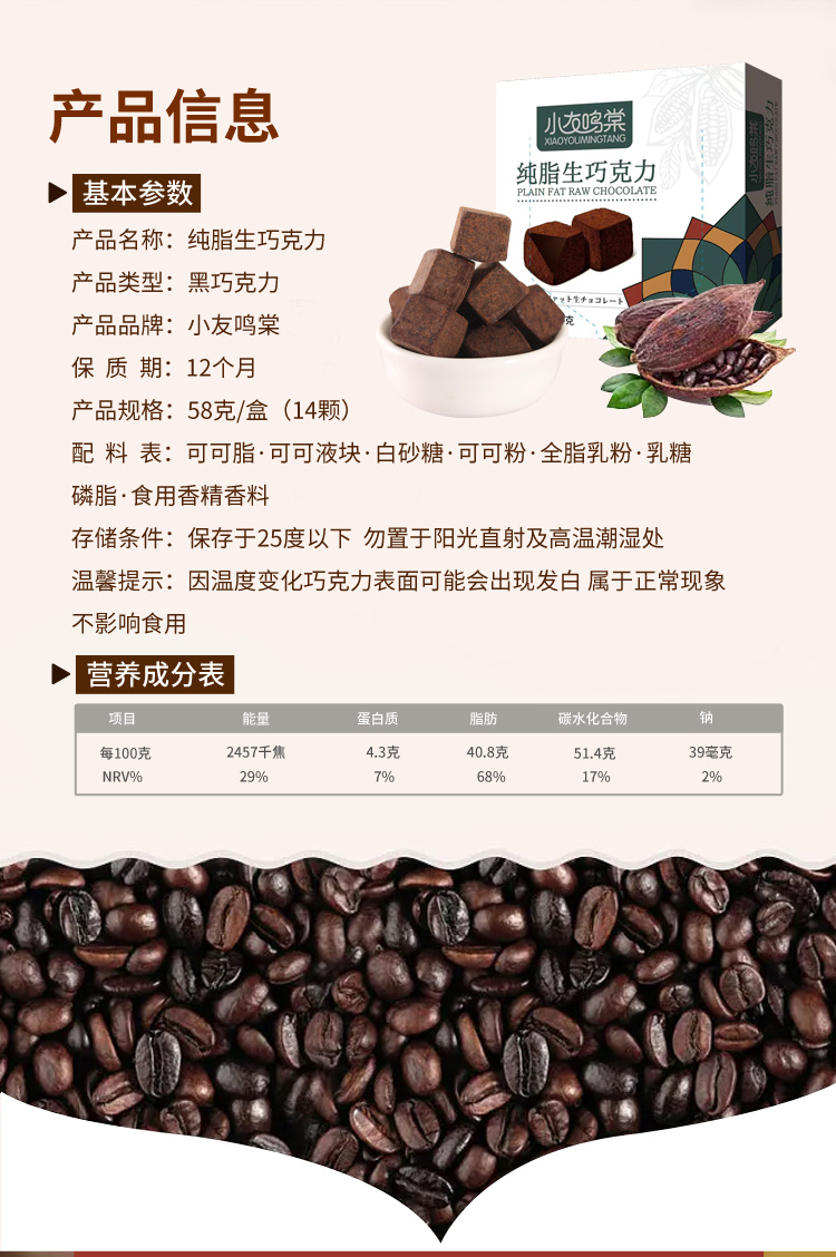 小友鸣棠·纯脂生巧克力*2盒(每盒58g 14颗)生产日期: 11月