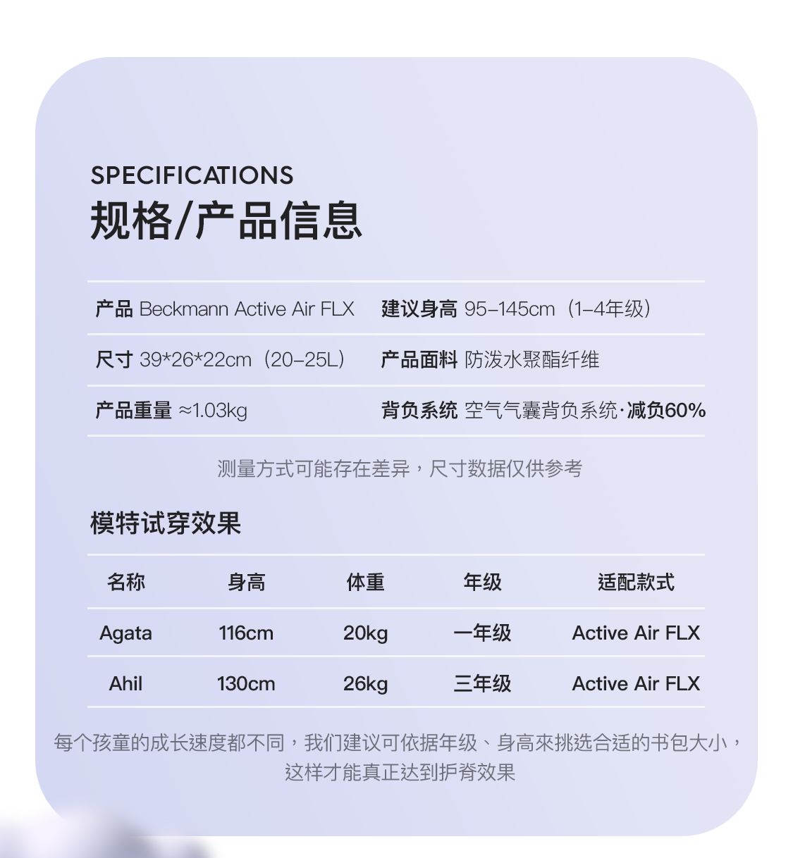 【20-25L】挪威Beckmann贝克曼儿童护脊书包ActiveAirFLX魔法气垫20-25L系列1-6年级