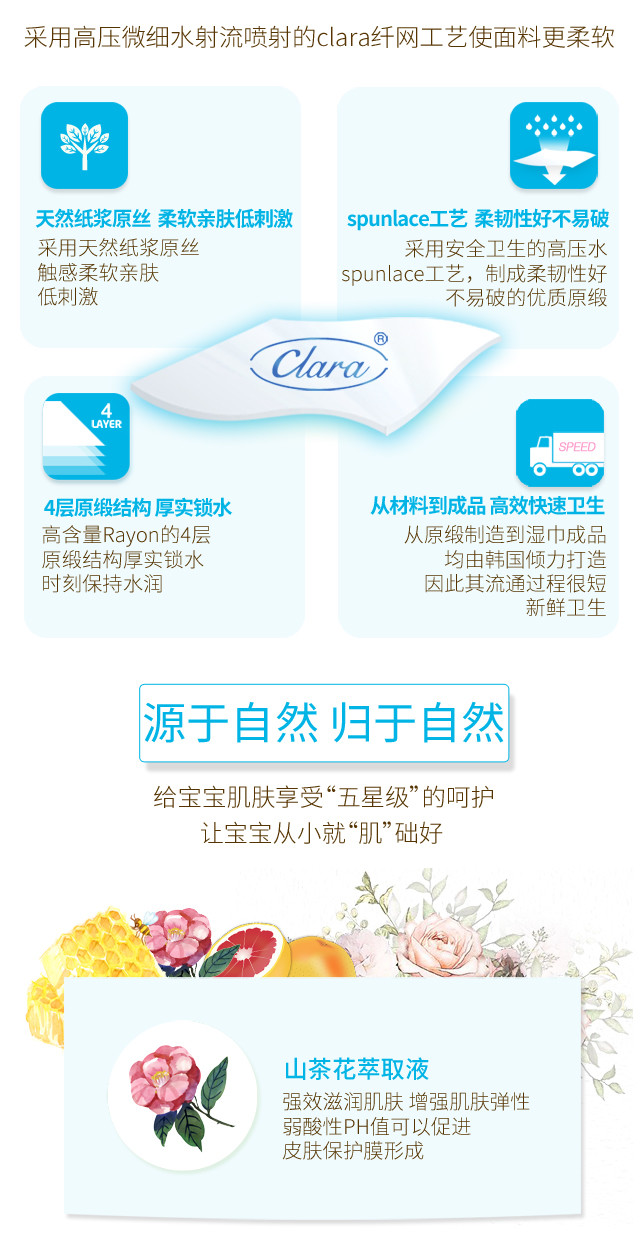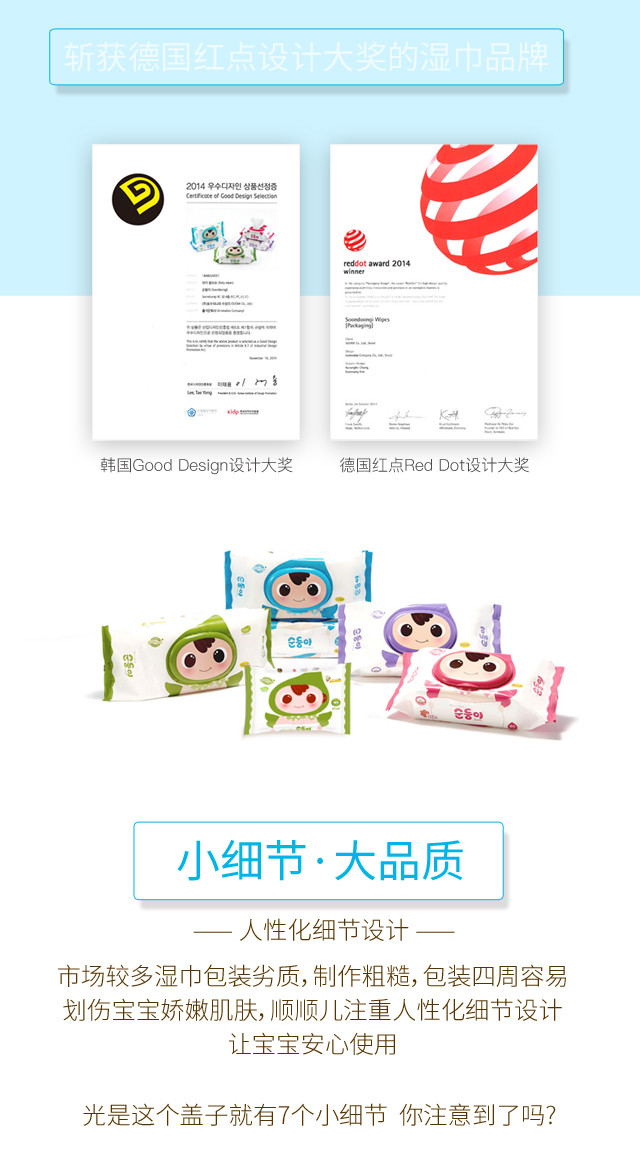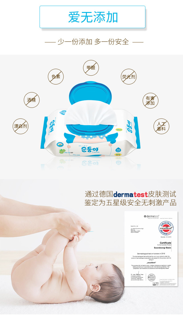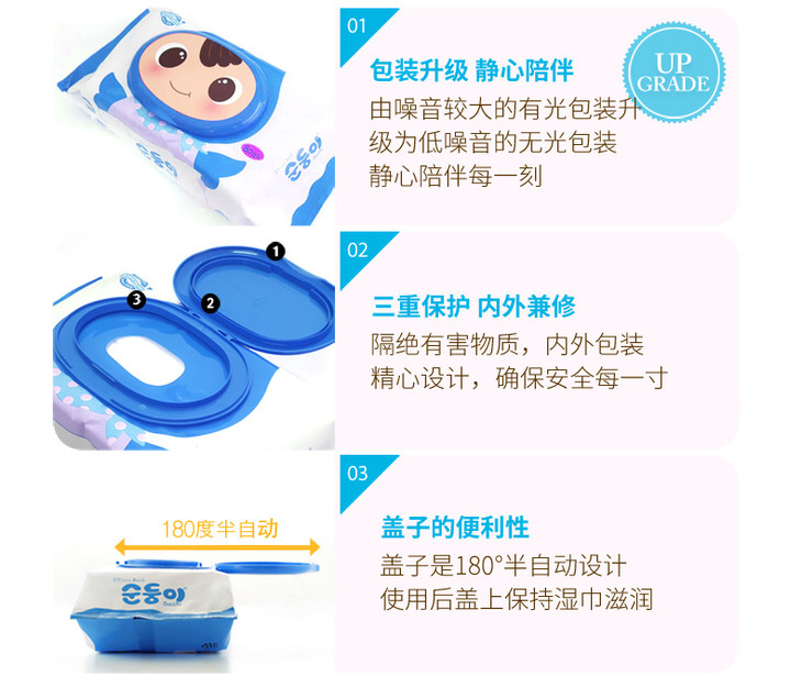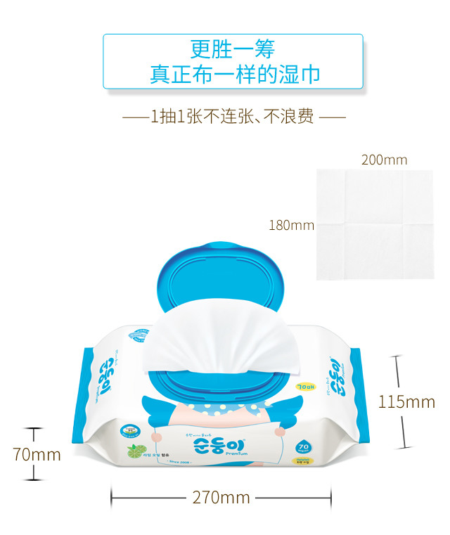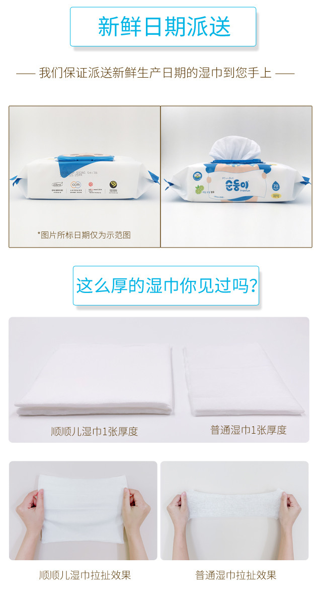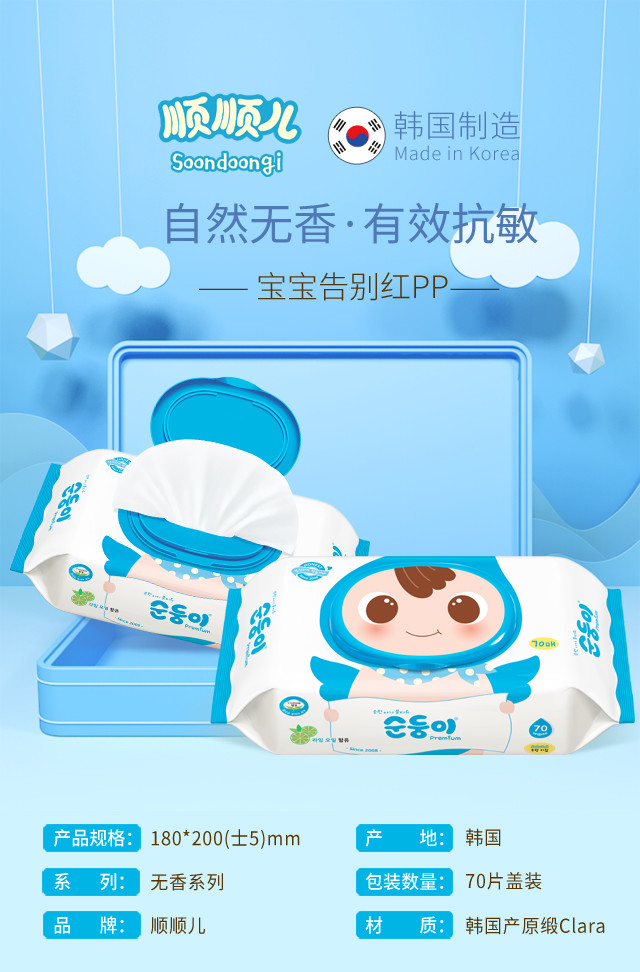 顺顺儿韩国原装进口婴儿湿巾蓝色无香70抽10包