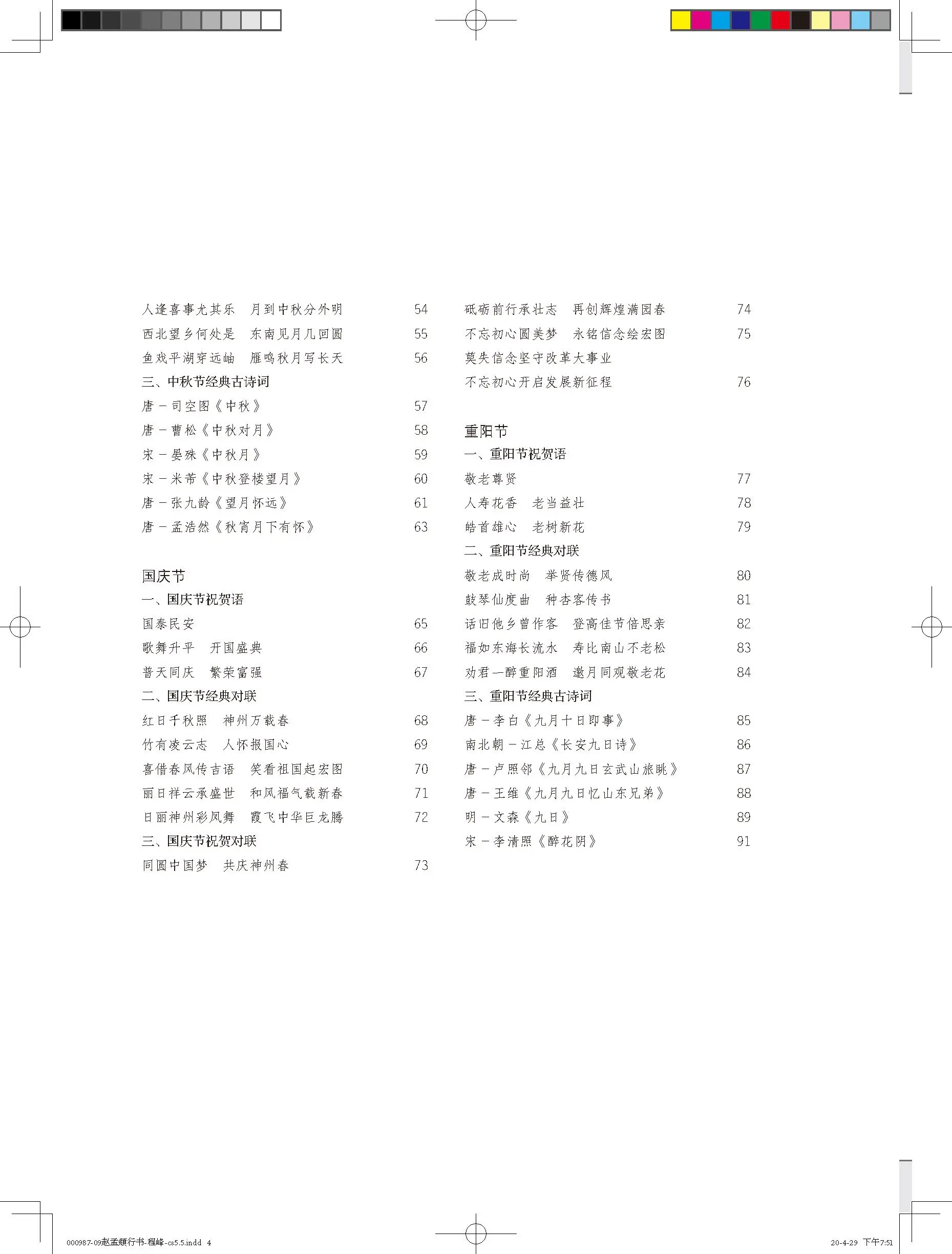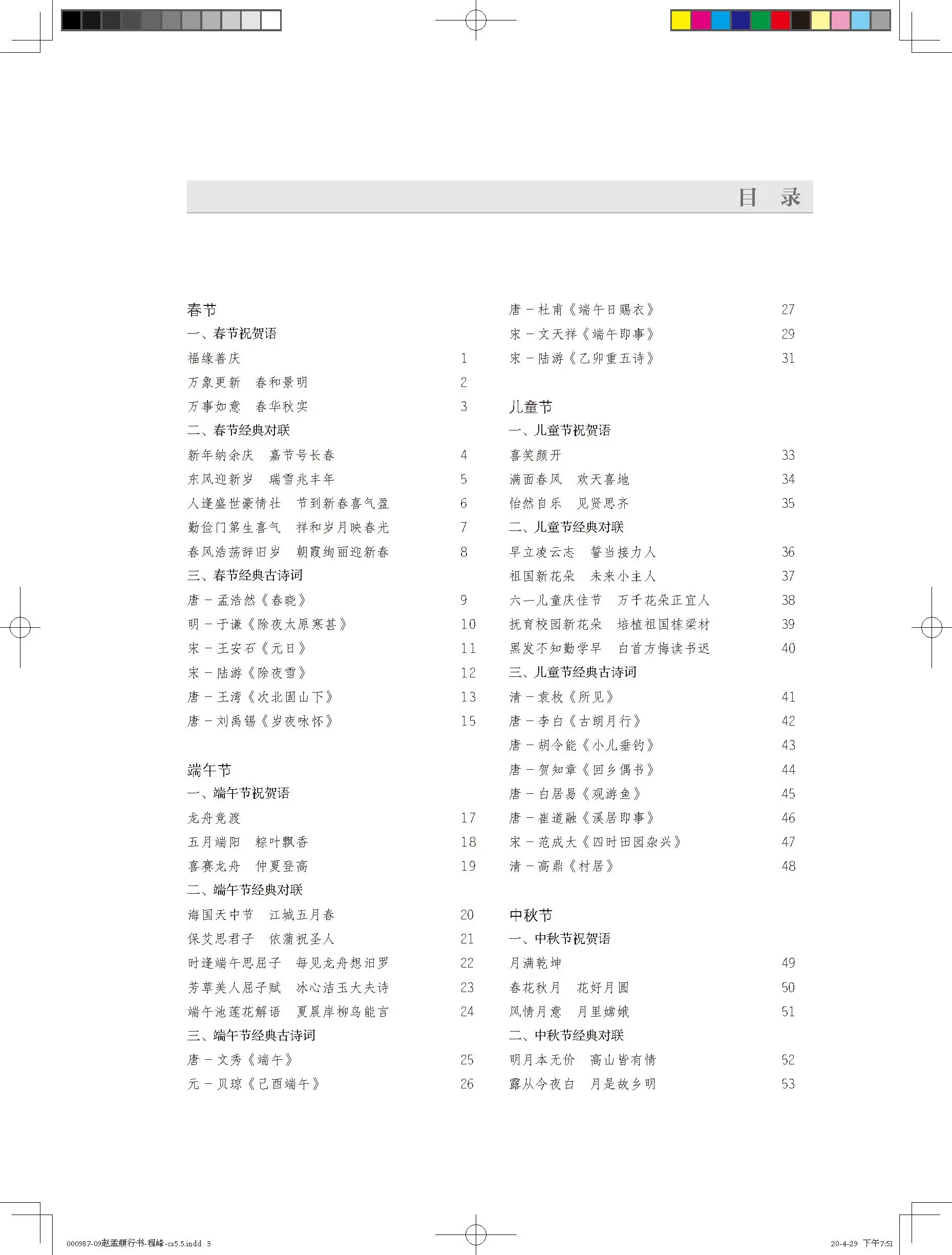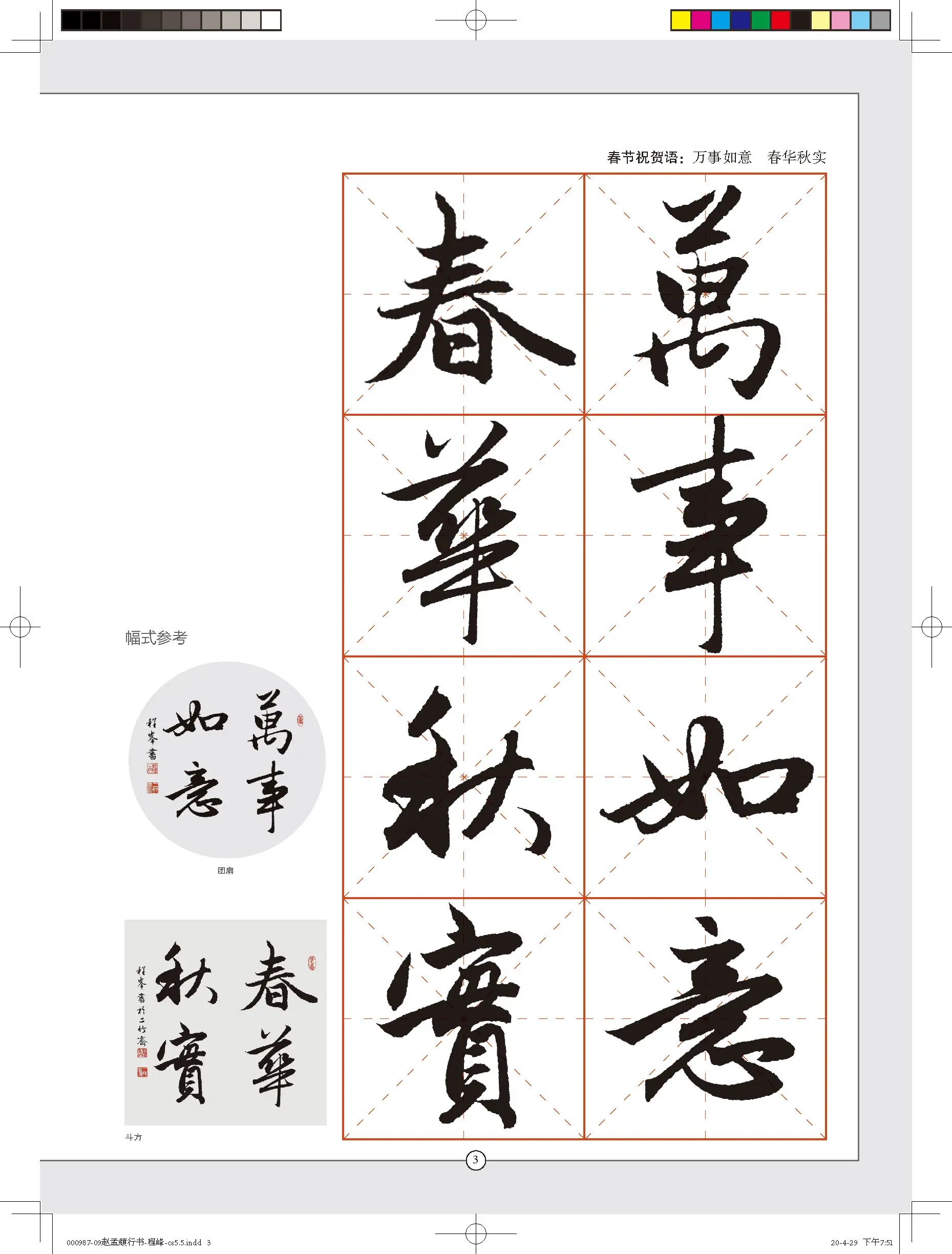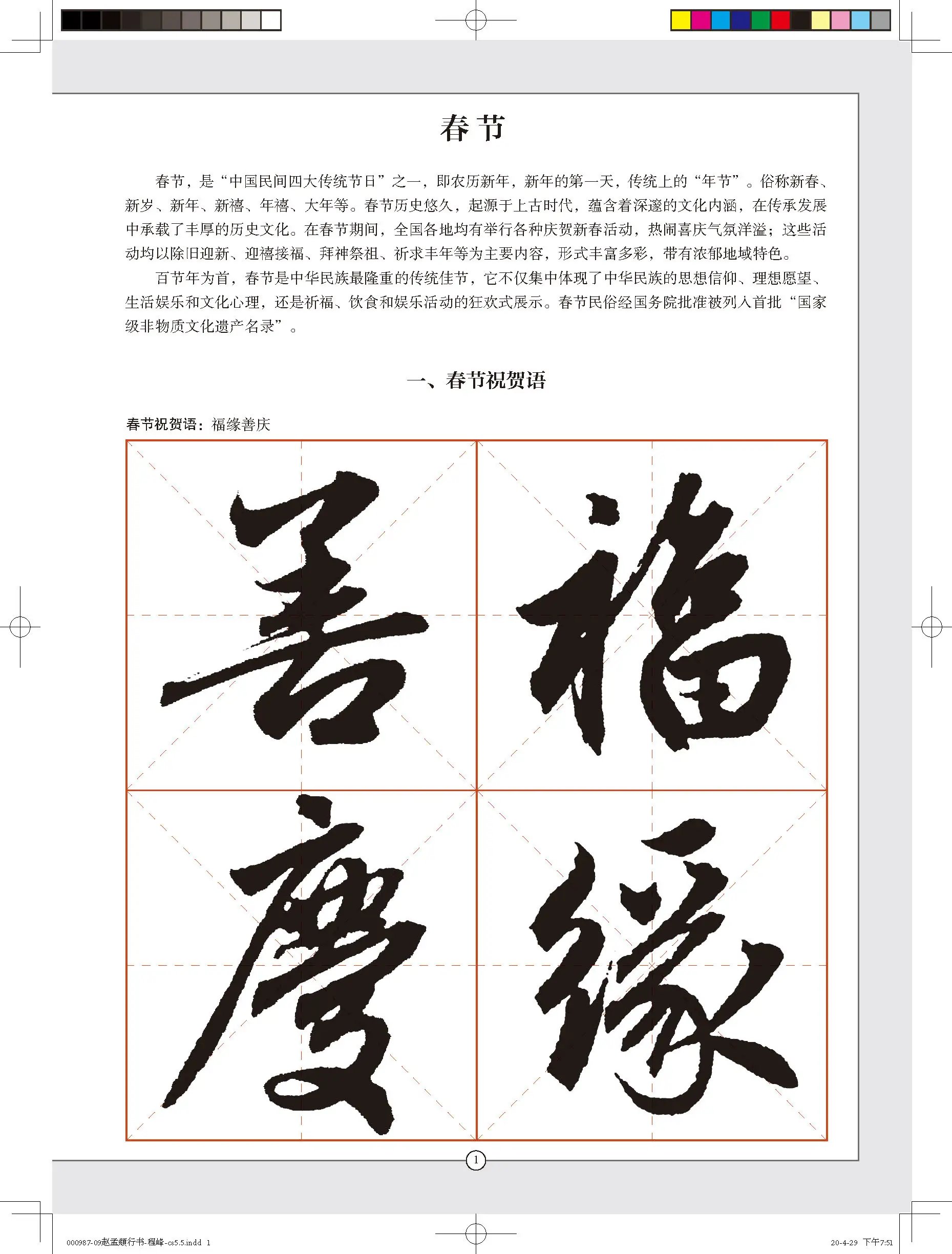 出版时间:2020-5内容简介:“节庆挥毫宝典”系列以春节、端午节、儿童节、重阳节、国庆节、中秋节为主题,集名家名帖之字,一家一帖集成一书,幅式参考涵盖了团扇、对联、斗方、中堂、条幅等,其内容又以类相从编排,不仅从形式到内容上有力地保证了全书的一致性与连贯性,更便于读者有针对性地、分门别类地欣赏、临摹、创作之用。《赵孟頫行书集字吉语诗词》是此系列中的一本。