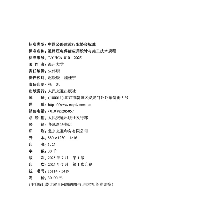 书名:道路压电俘能应用设计与施工技术规程(T/CHCA 010—2025)