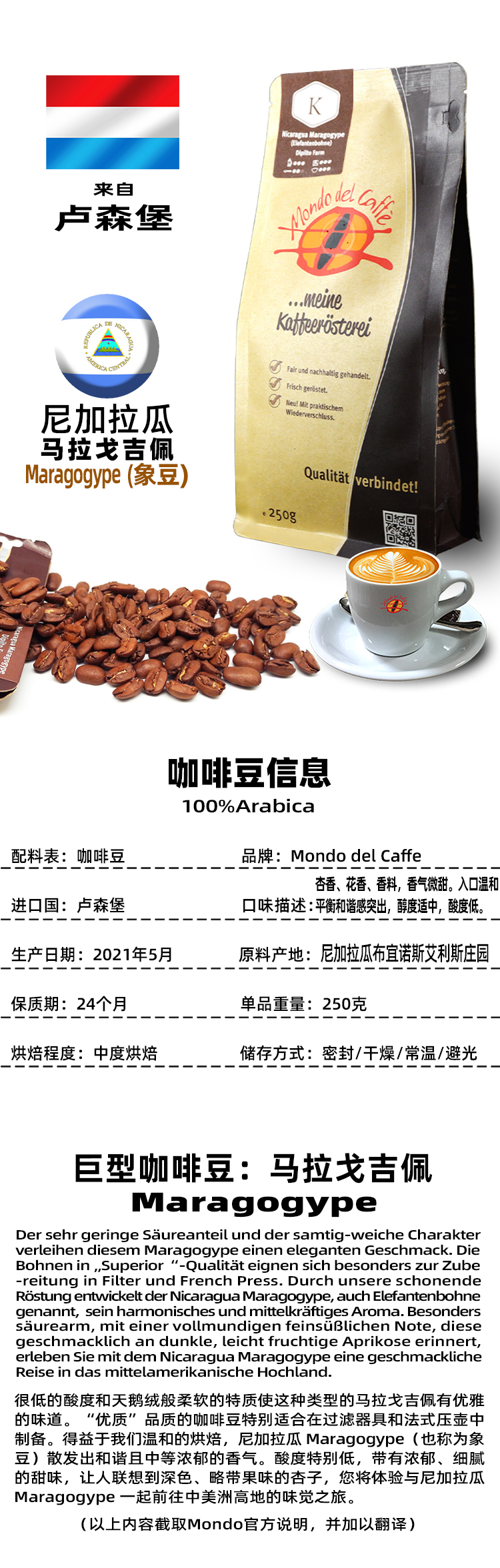 Mondo del Caffe 尼加拉瓜BUENOS AIRES庄园马拉戈吉佩象豆 卢森堡