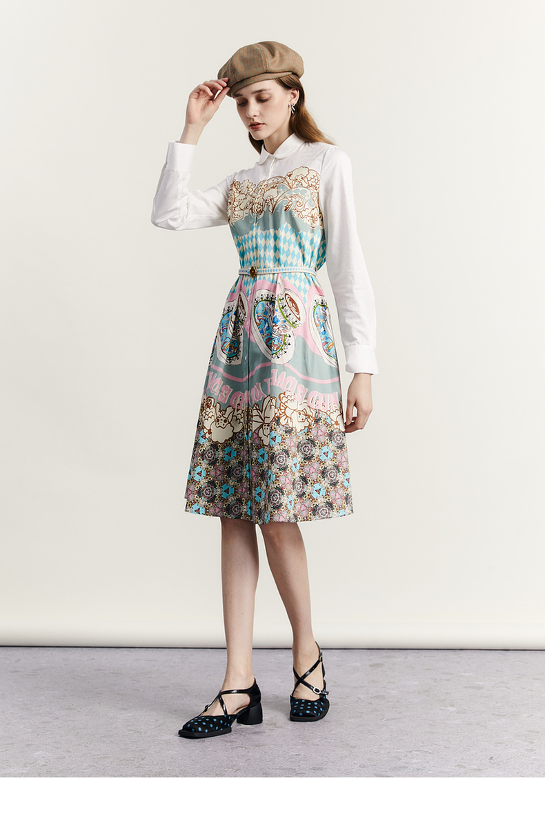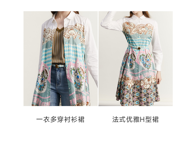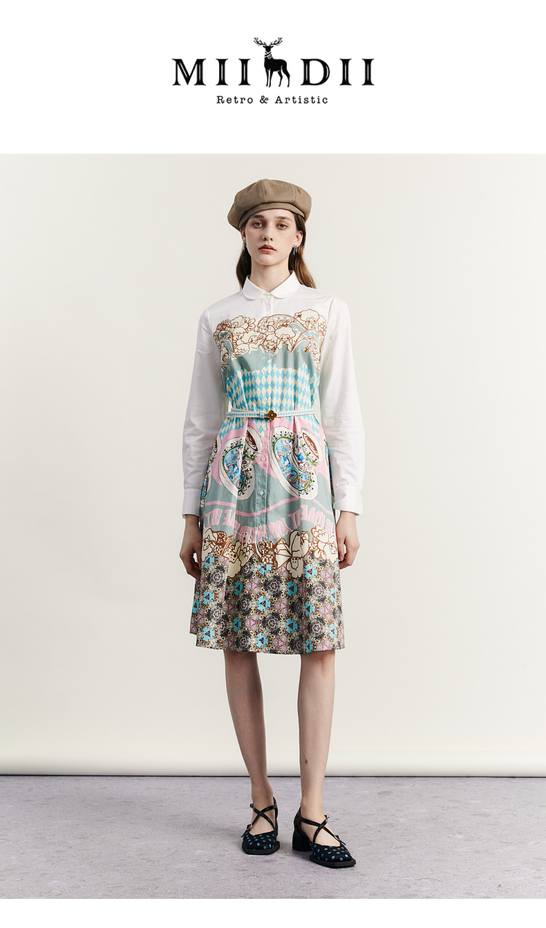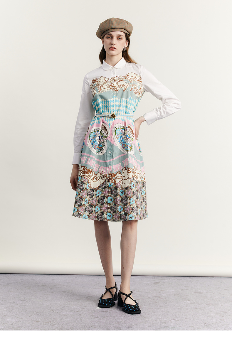 谜底衬衫式连衣裙长袖2023秋季新款复古主题印花中长裙233ML1141
