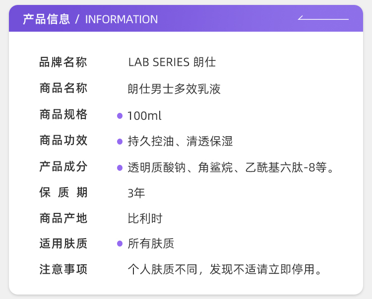 【保税仓】11月效期美国Lab Series 朗仕男士多效 乳液 清爽控油 100ml