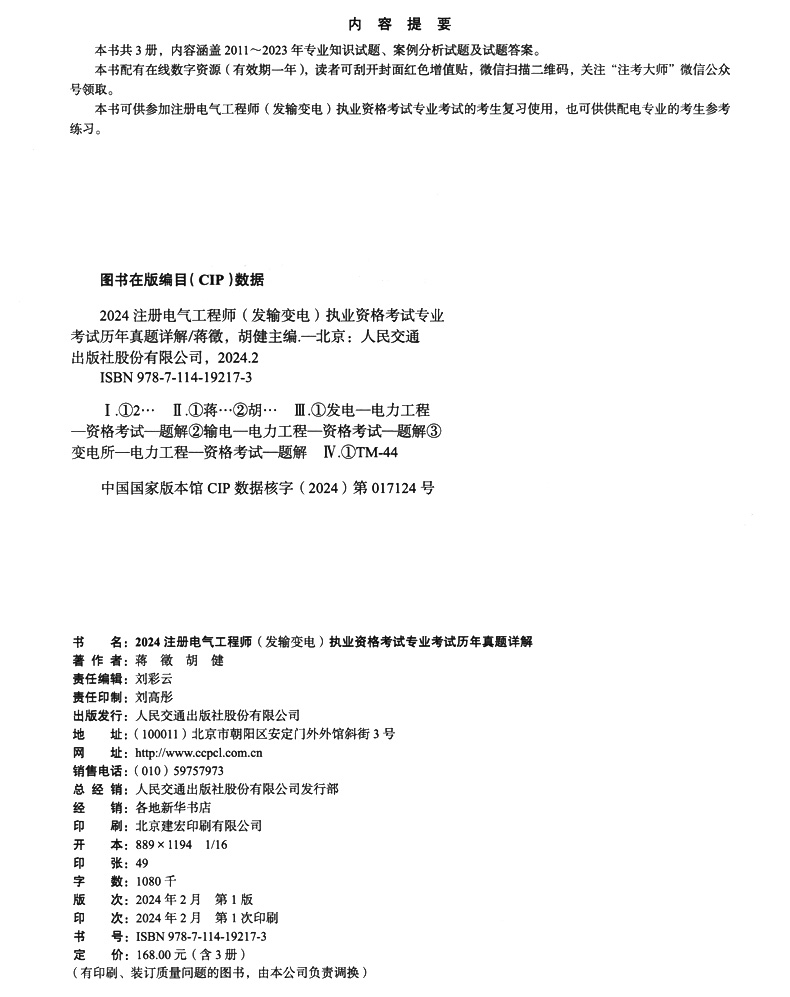 书名:2024注册电气工程师(发输变电)执业资格考试专业考试历年真题详解