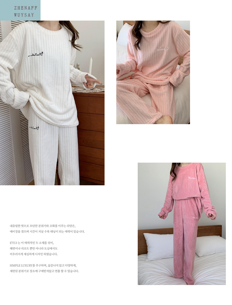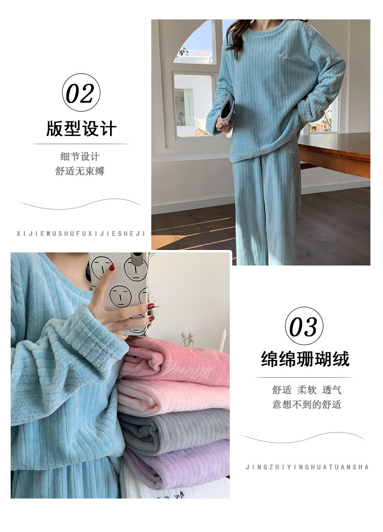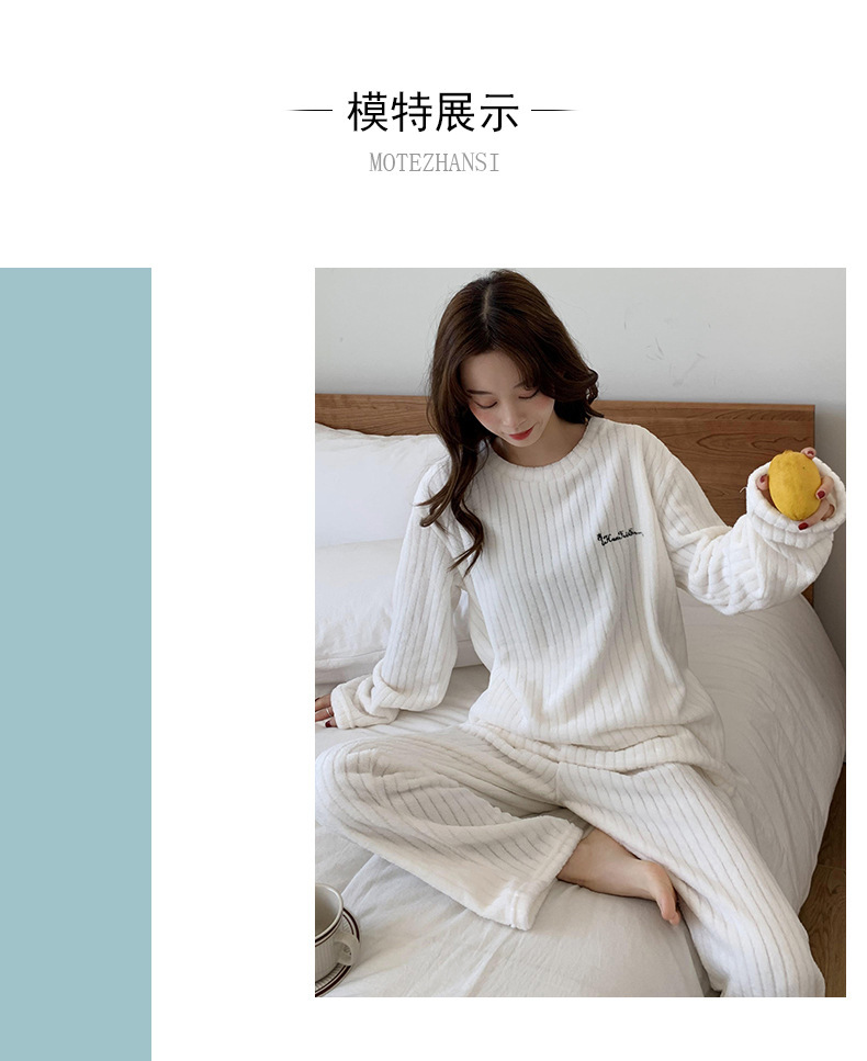 秋冬法兰绒睡衣两件套珊瑚绒家居服新款月牙城休闲条纹暖暖套装女