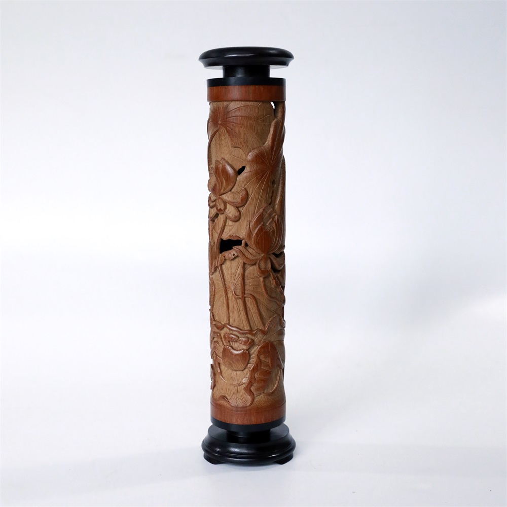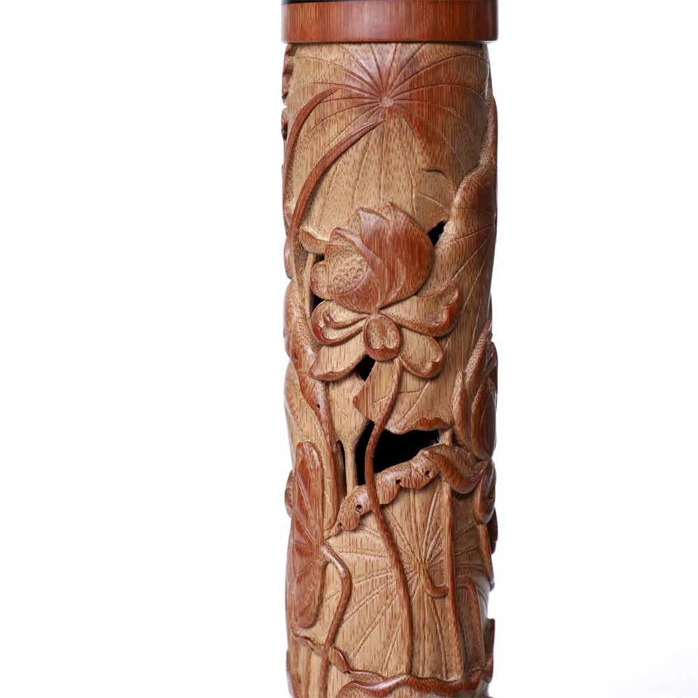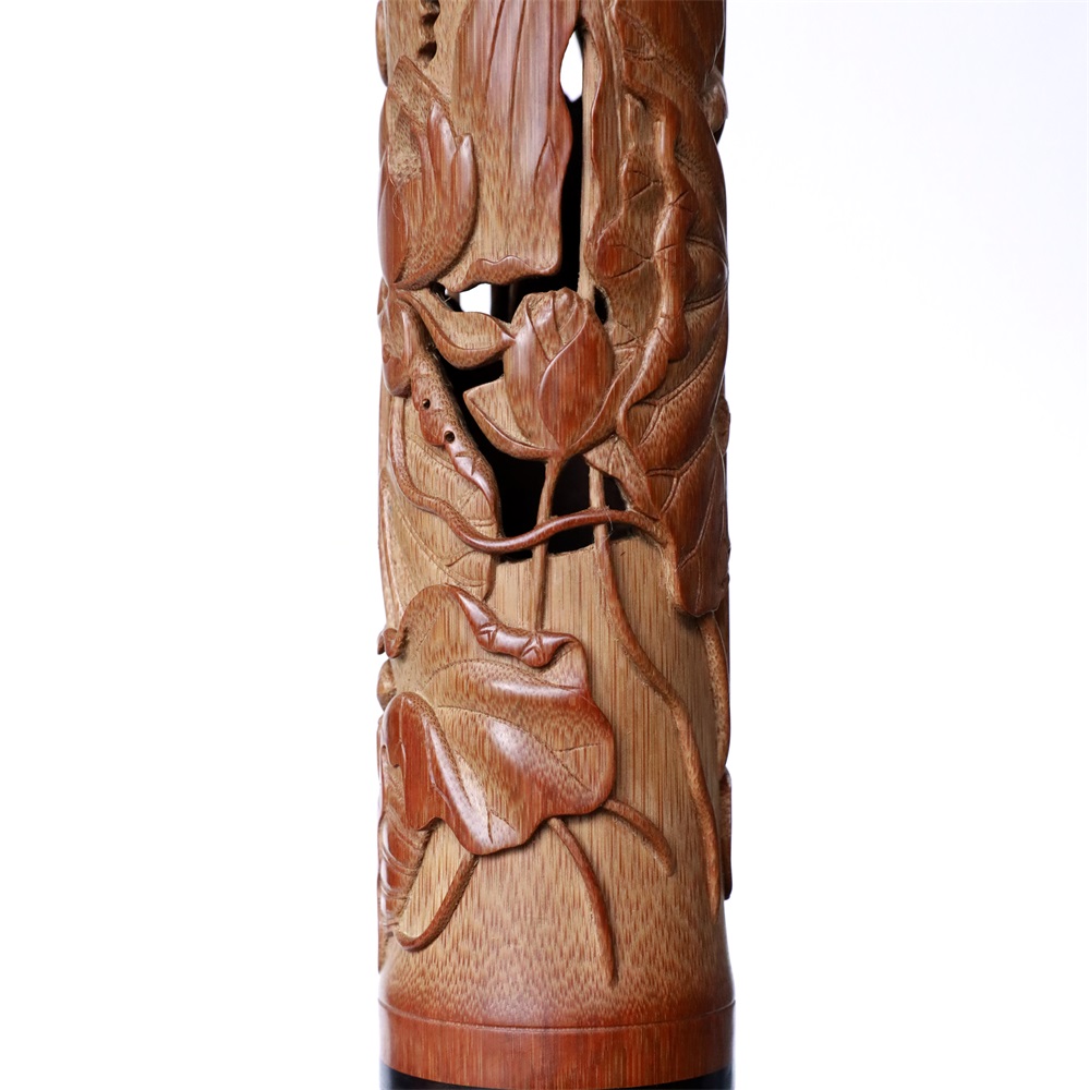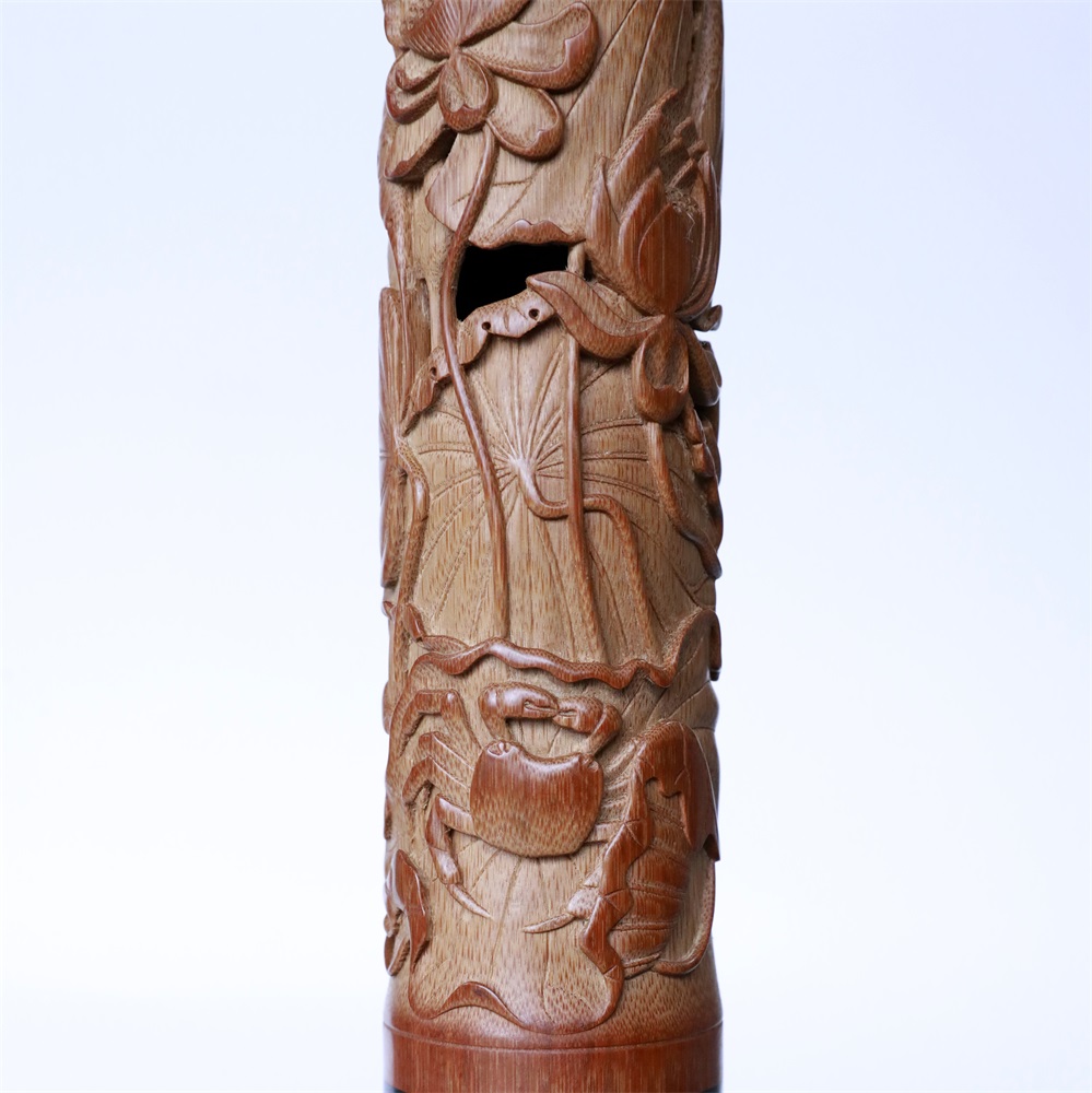 作品采用徽州传统手工艺雕刻而成。方寸间荷花枝干灵动,穿插有致,花与叶的层次、位置、穿插、向背,繁而不乱,显示出高妙的匠意。踞于荷叶上的小螃蟹成为构图的点睛之笔,刻划自然生动细腻,增添了画面的趣味。荷花、螃蟹均为中国传统的吉祥图案。“荷”“和”谐音,赋予荷和气、和平、祥和、和合、和好的美好寓意。也承载了文人墨客的生活情趣和人文情怀。