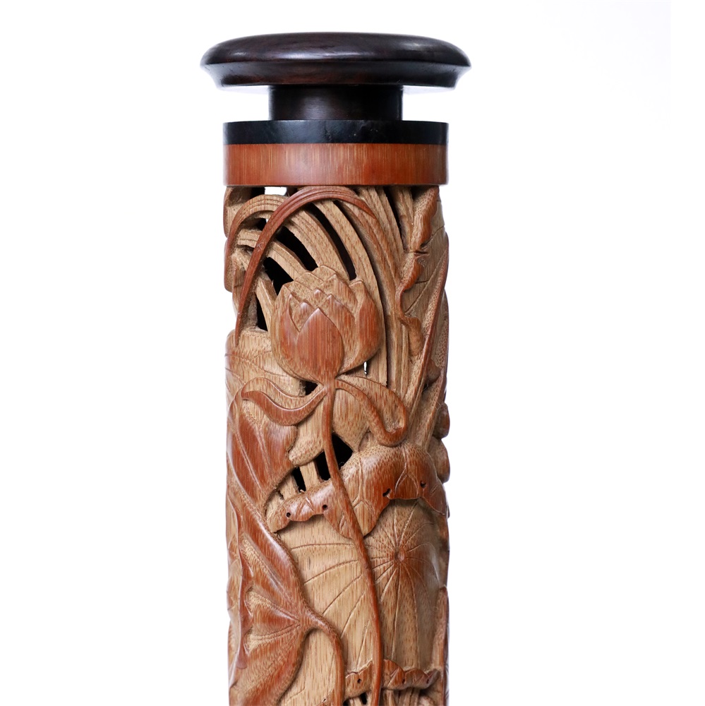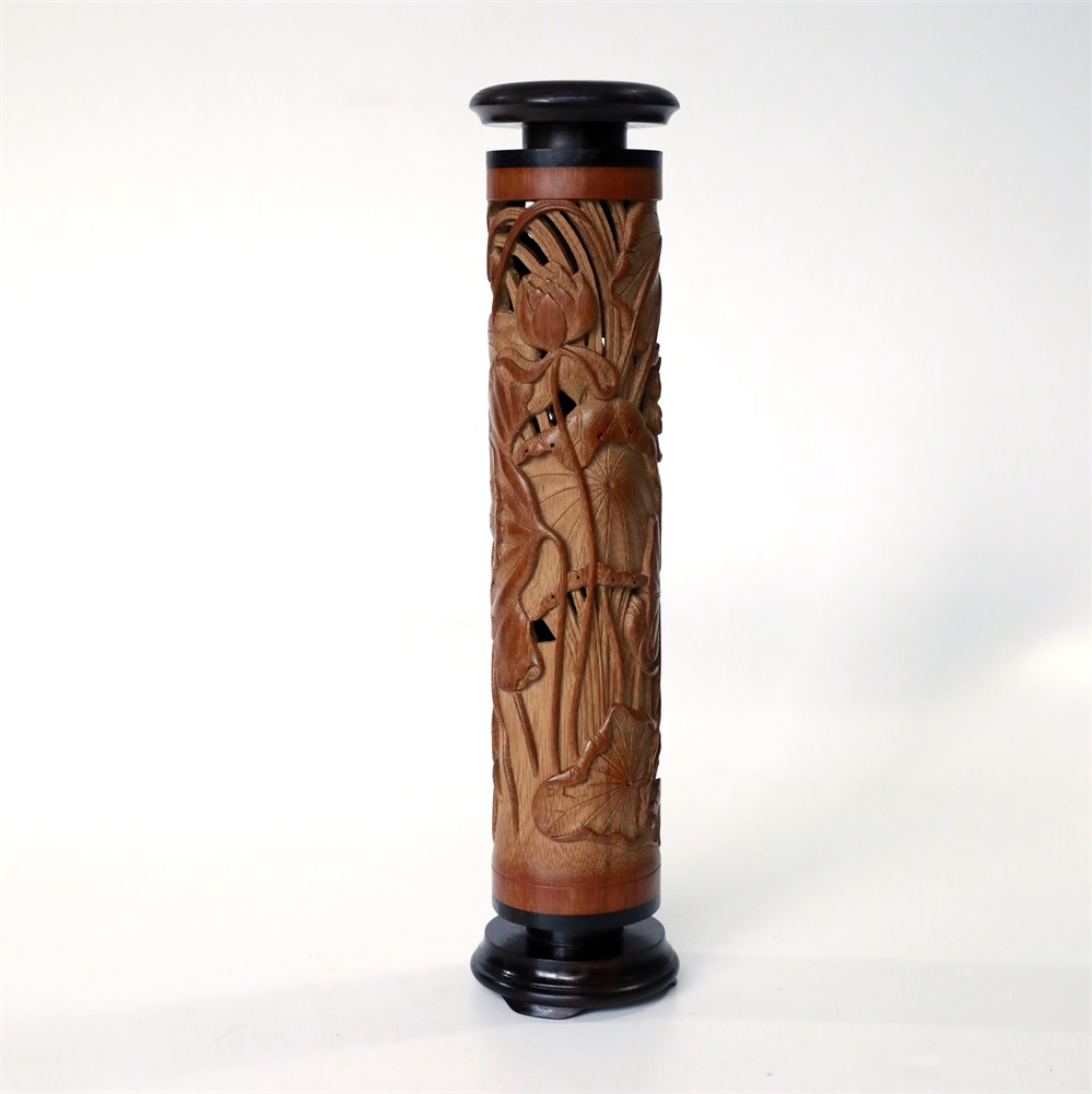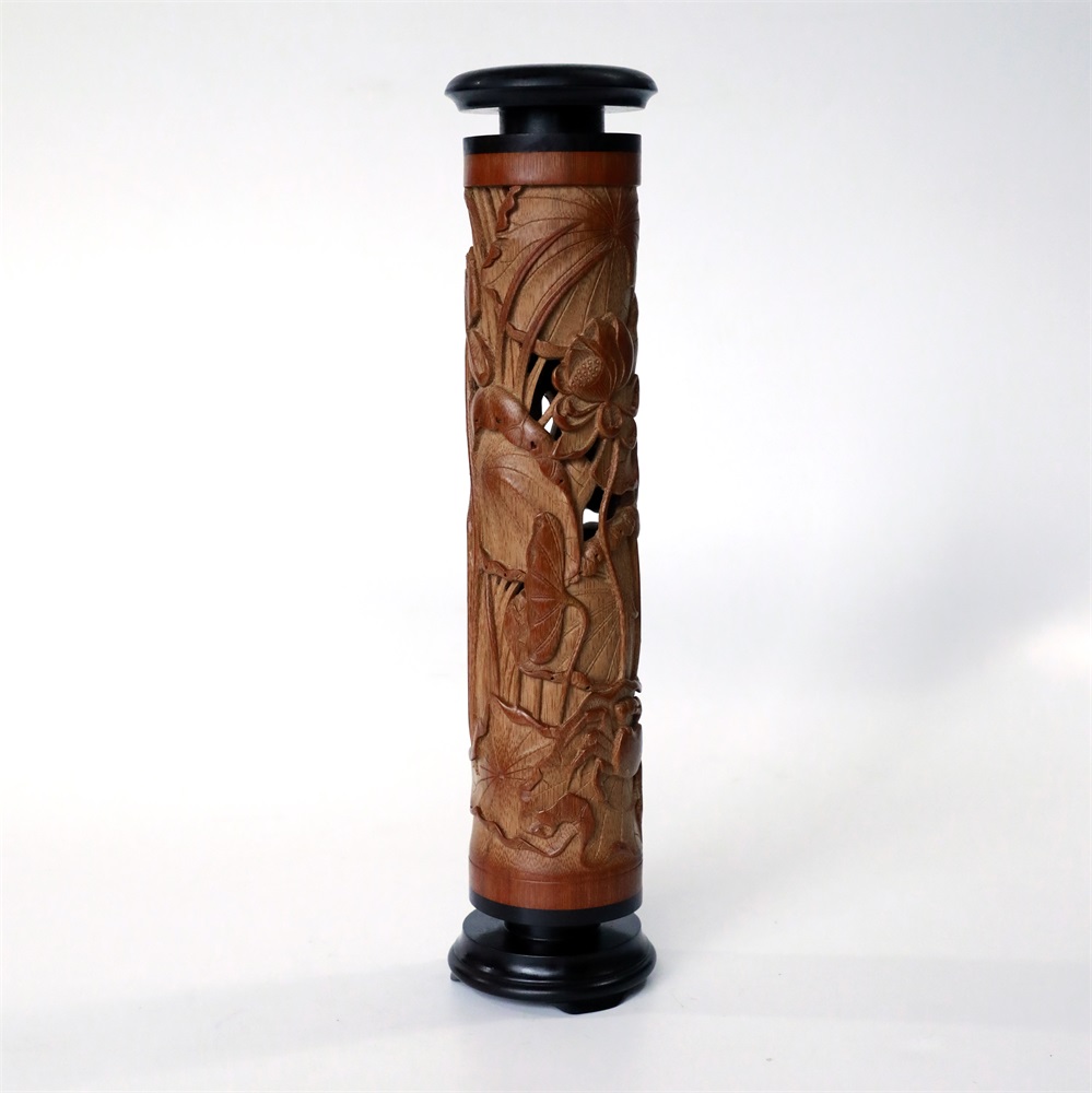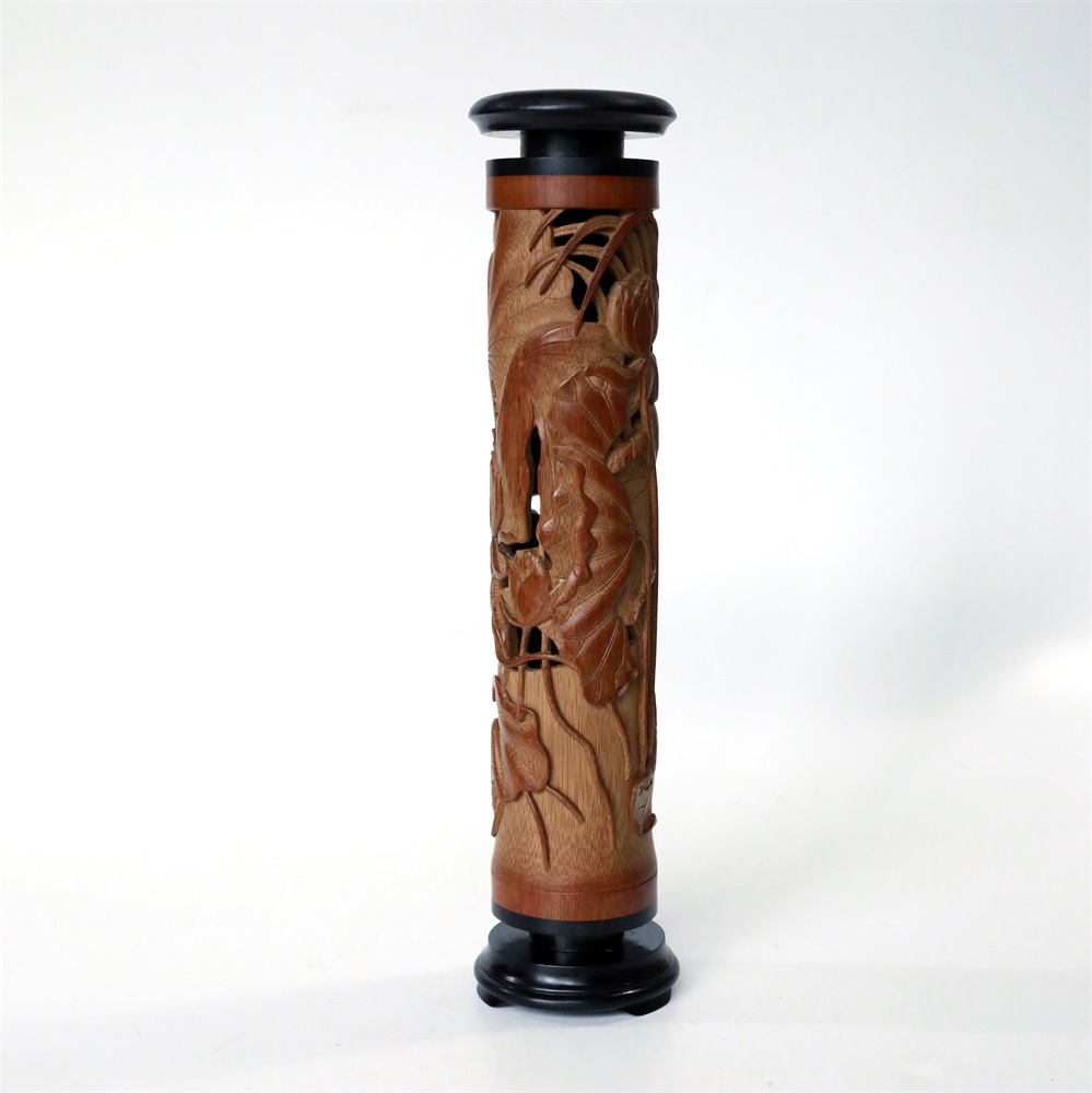 作品采用徽州传统手工艺雕刻而成。方寸间荷花枝干灵动,穿插有致,花与叶的层次、位置、穿插、向背,繁而不乱,显示出高妙的匠意。踞于荷叶上的小螃蟹成为构图的点睛之笔,刻划自然生动细腻,增添了画面的趣味。荷花、螃蟹均为中国传统的吉祥图案。“荷”“和”谐音,赋予荷和气、和平、祥和、和合、和好的美好寓意。也承载了文人墨客的生活情趣和人文情怀。