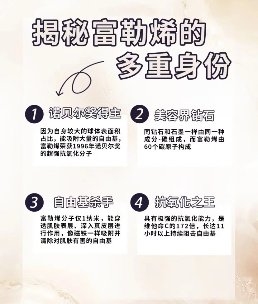 👉富勒烯的稳定性和无光敏性,让它全天都可以使用全面抵御光老化,白天清除自由基!夜间持续皮肤修复!