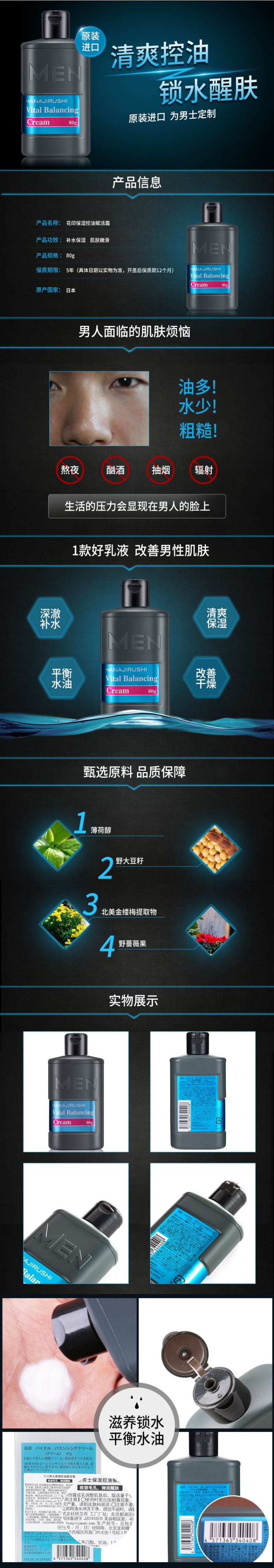 花印 男士乳液面霜80g 四合一啫哩补水保湿控油 日本