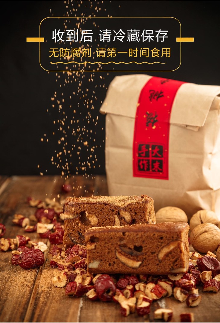 【产品亮点】手工制作,无添加剂 不含香精 真材实料,可以吃到真的大枣和核桃仁的枣糕。低糖低油。健康美味两不误。
