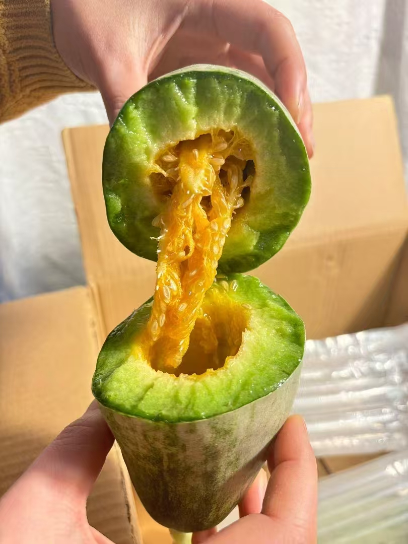 别的瓜都是要把瓜籽、瓜瓤掏干净,十分麻烦。但是博洋72的精华就在它的内瓤。掰开来,嫩绿的果肉包裹着黄澄澄的瓜瓤,满溢着甜蜜的瓜汁,大口咬下,就能体会到什么叫“爽”!
