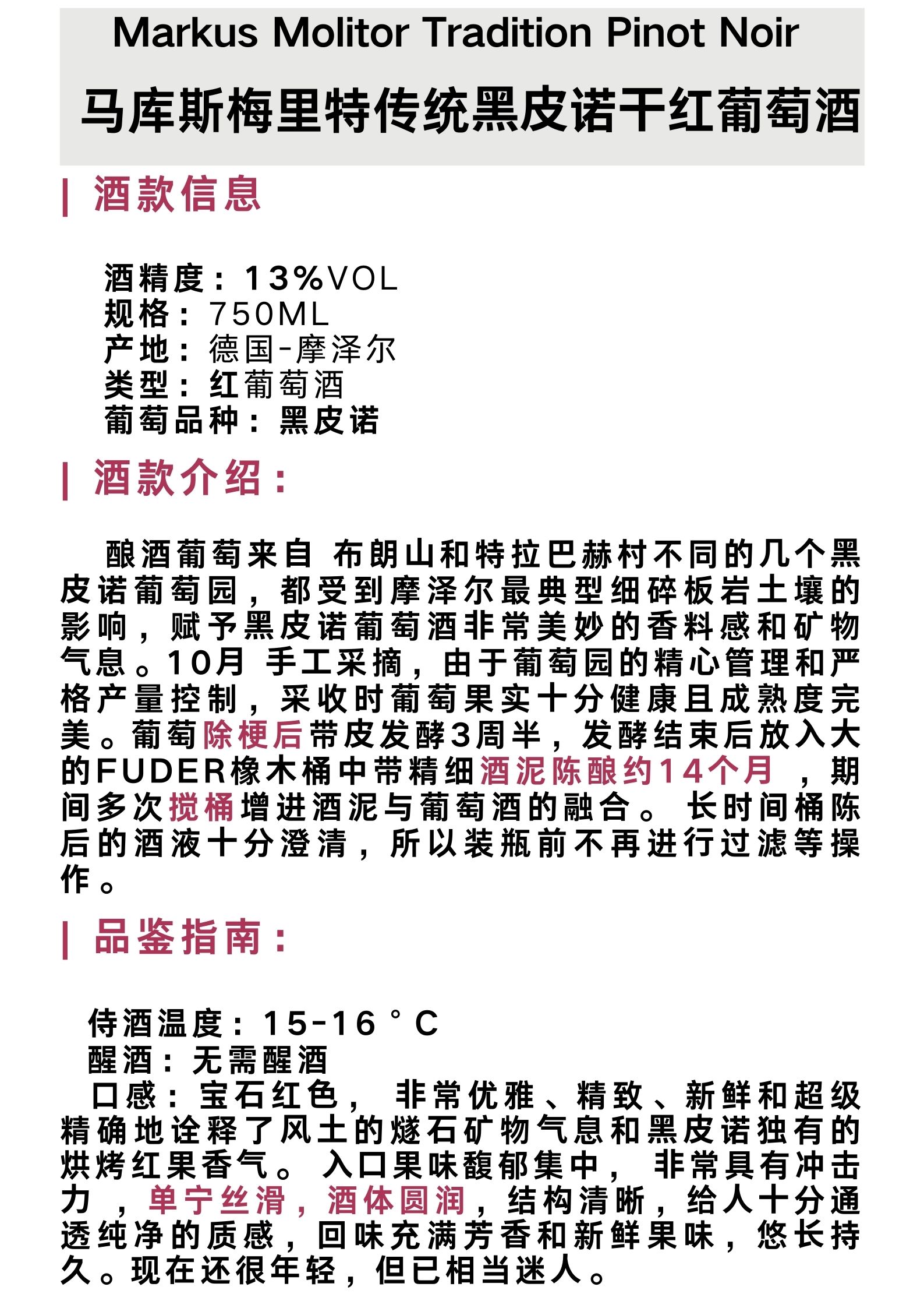 马库斯梅里特传统⿊⽪诺⼲红葡萄酒 Markus Molitor Tradition Pinot Noir