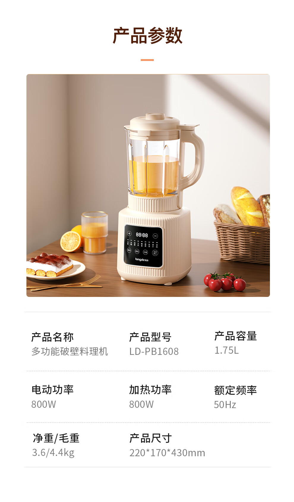【小家电】龙的longde破壁机家用大容量多功能早餐豆浆机榨果汁料理辅食机 LD-PB1608 HF