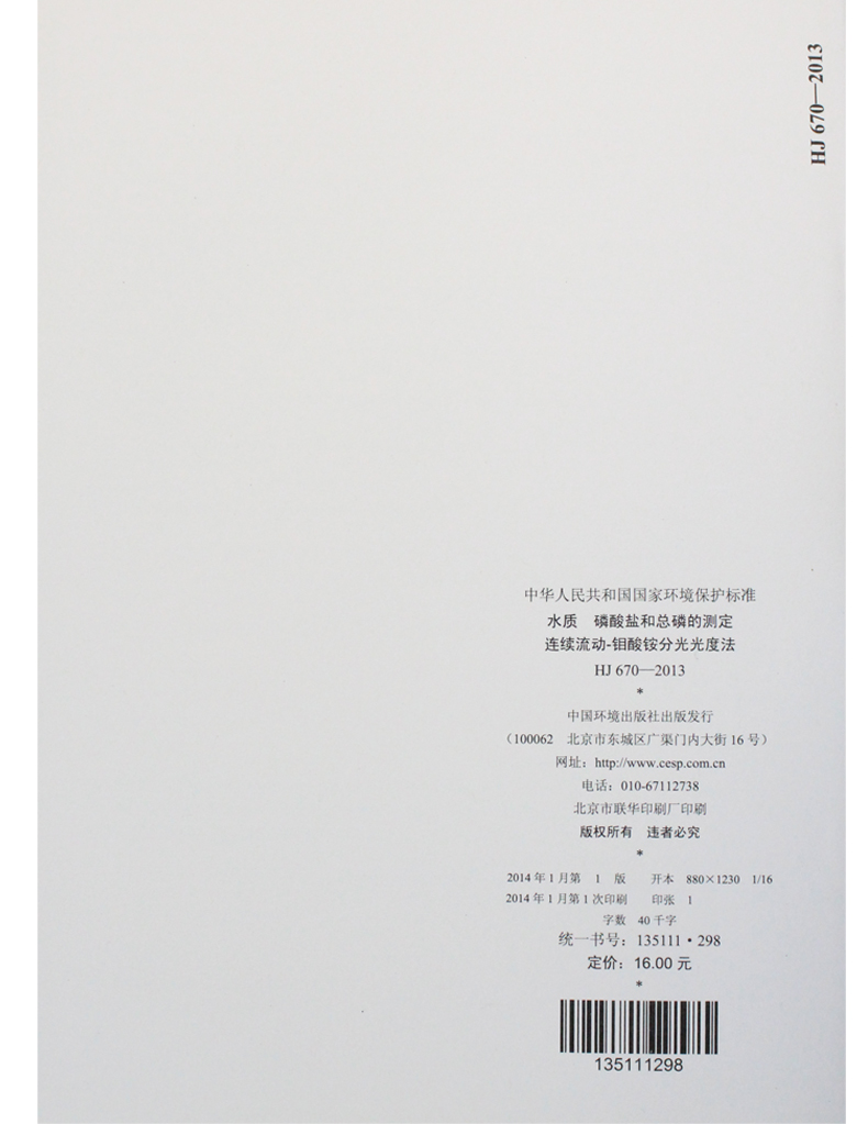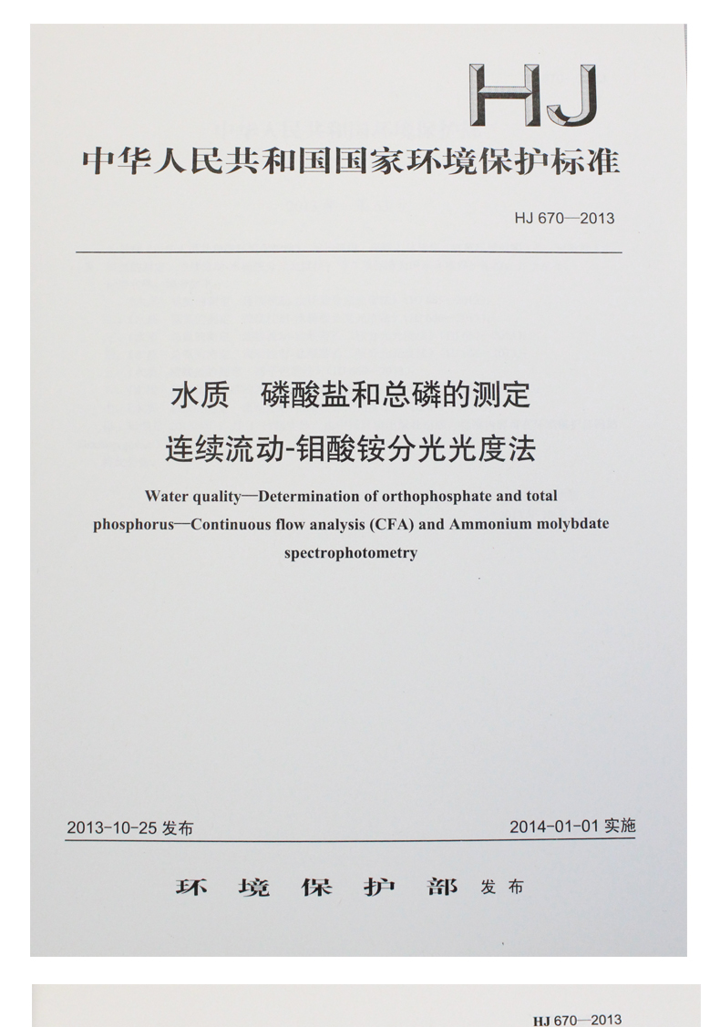 HJ 670-2013 水质 磷酸盐和总磷的测定 连续流动-钼酸铵分光光度法 国家标准 GB 环境保护中国环境出版社 135111298