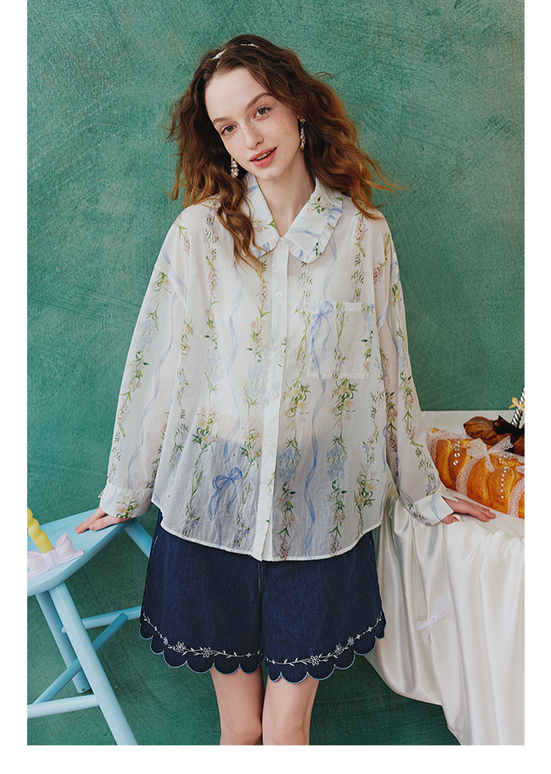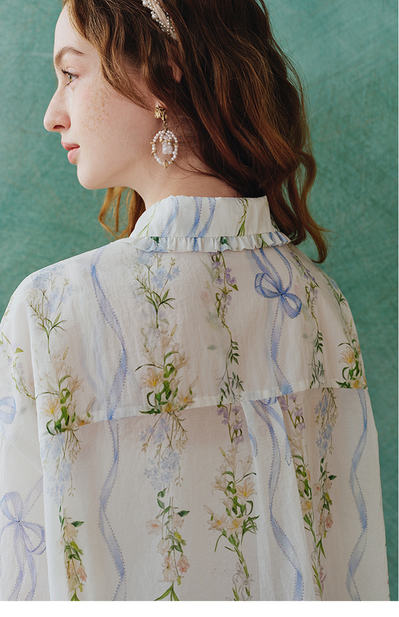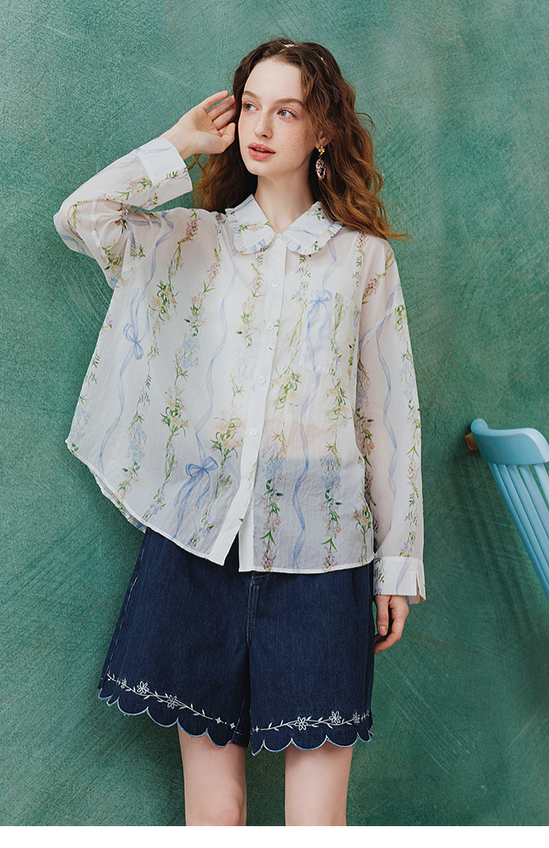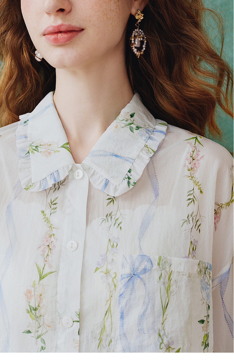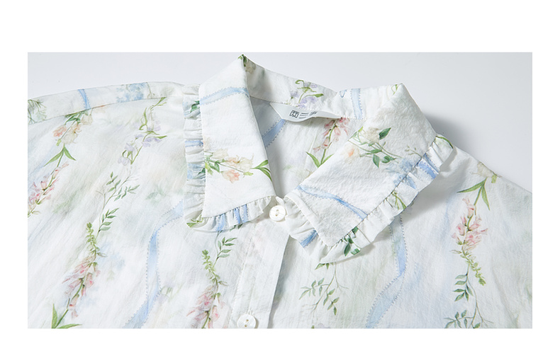 两三事 琉璃清梦 2025夏季新款复古荷叶边翻领印花长袖衬衫女