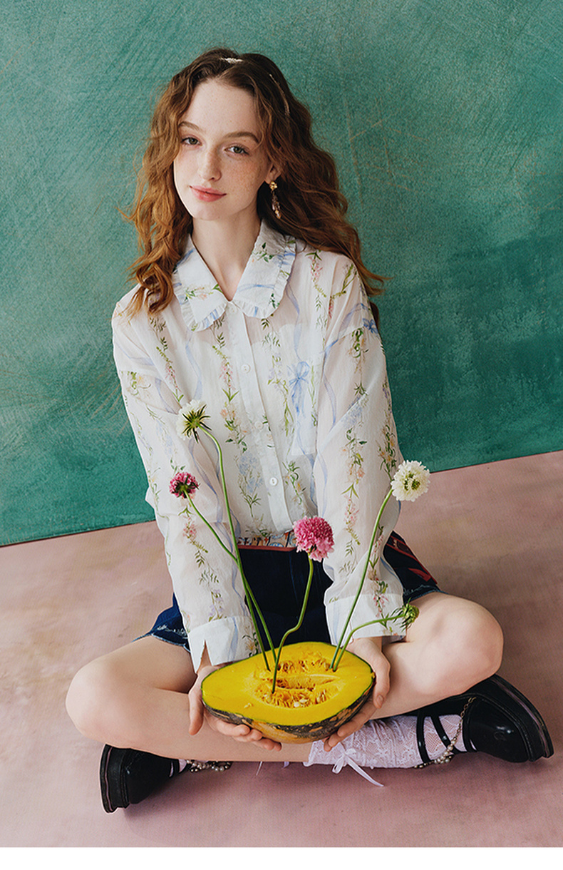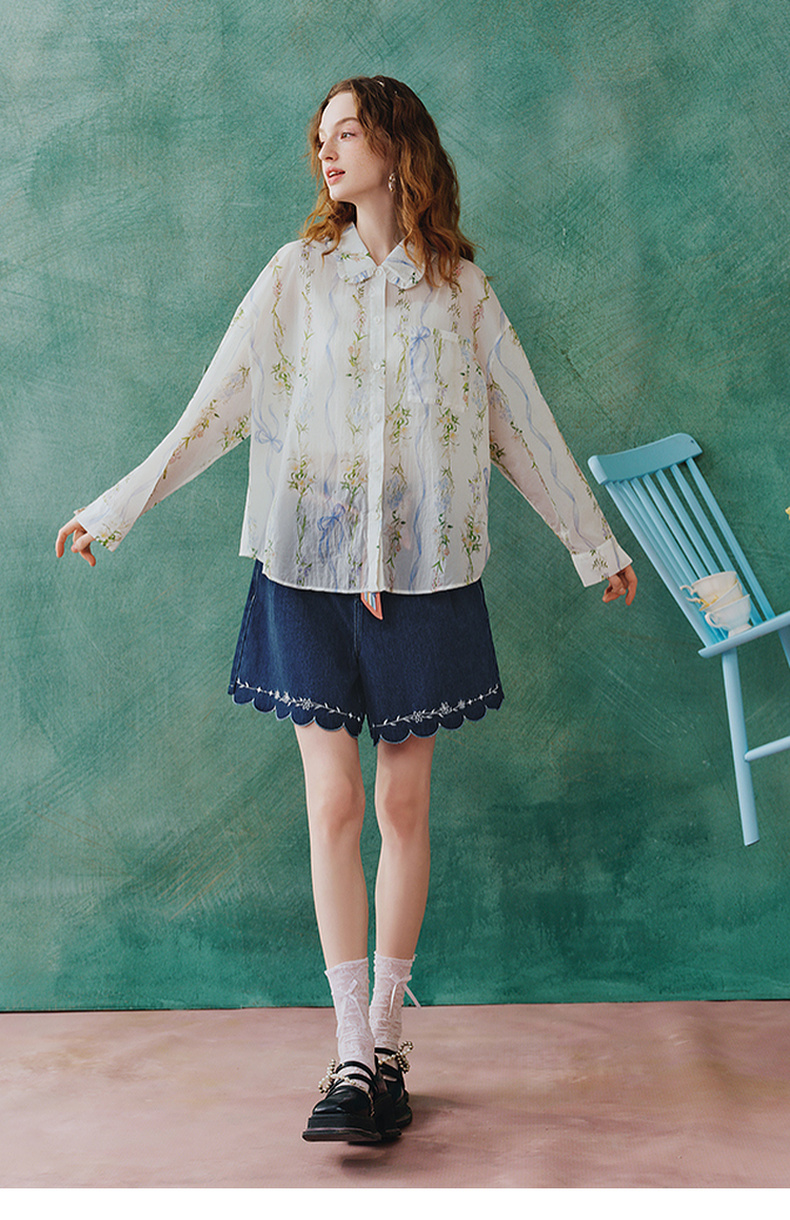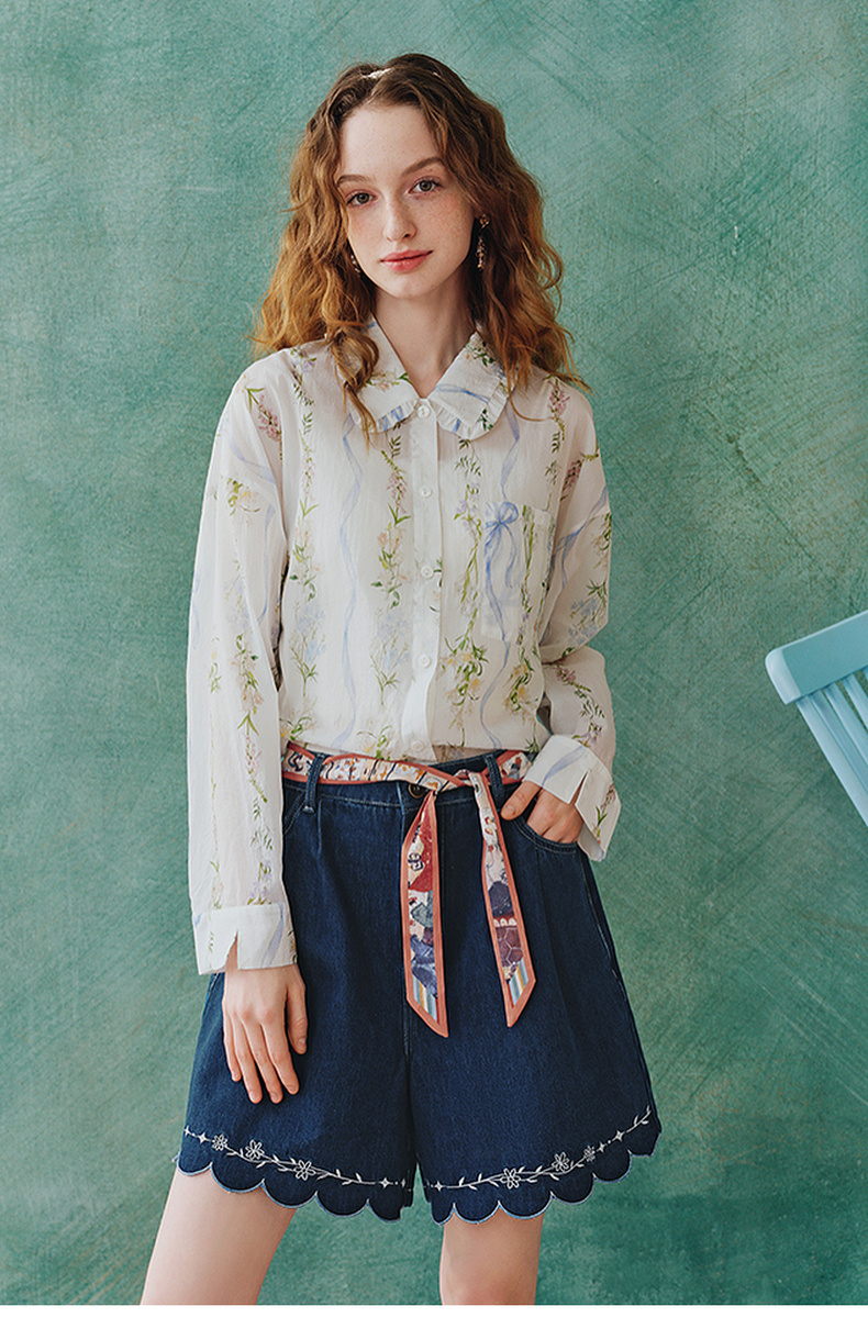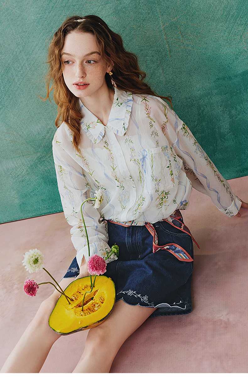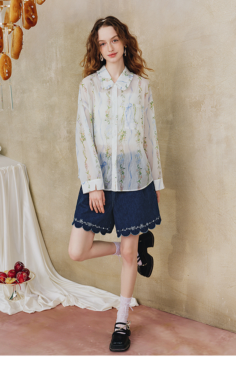两三事 琉璃清梦 2025夏季新款复古荷叶边翻领印花长袖衬衫女