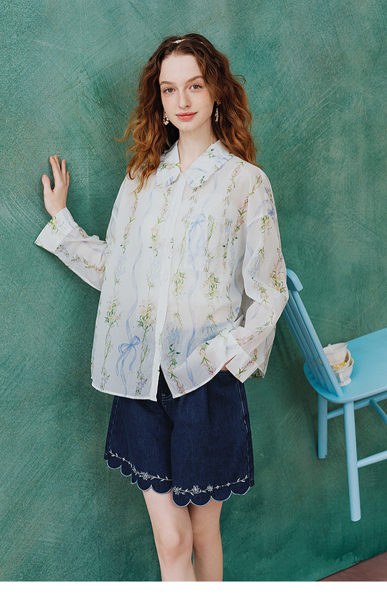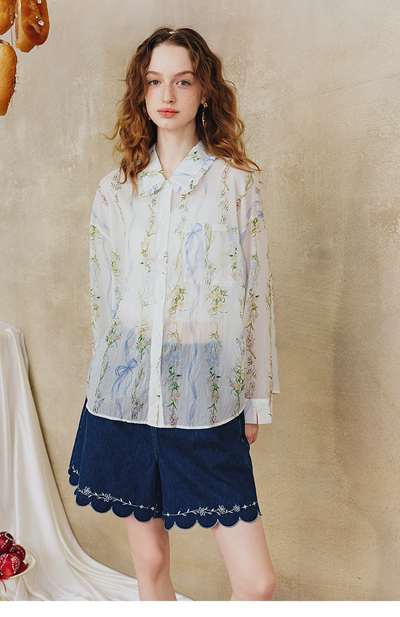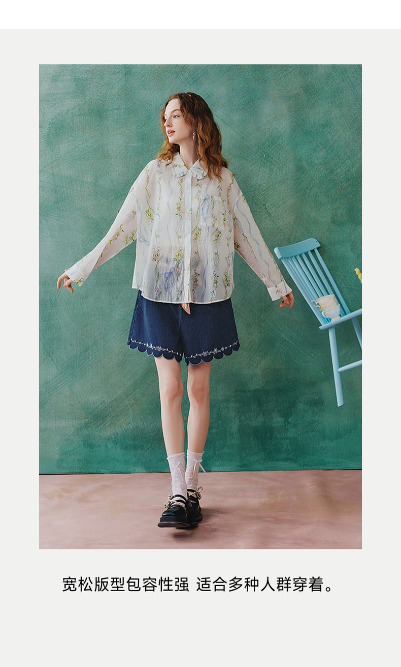 两三事 蜜夏神谕 2025春季新款文艺风蝴蝶结大翻领印花衬衫女宽松