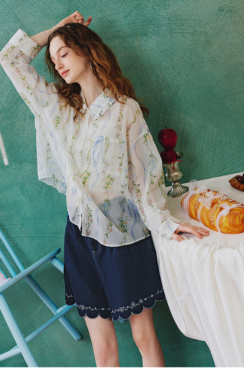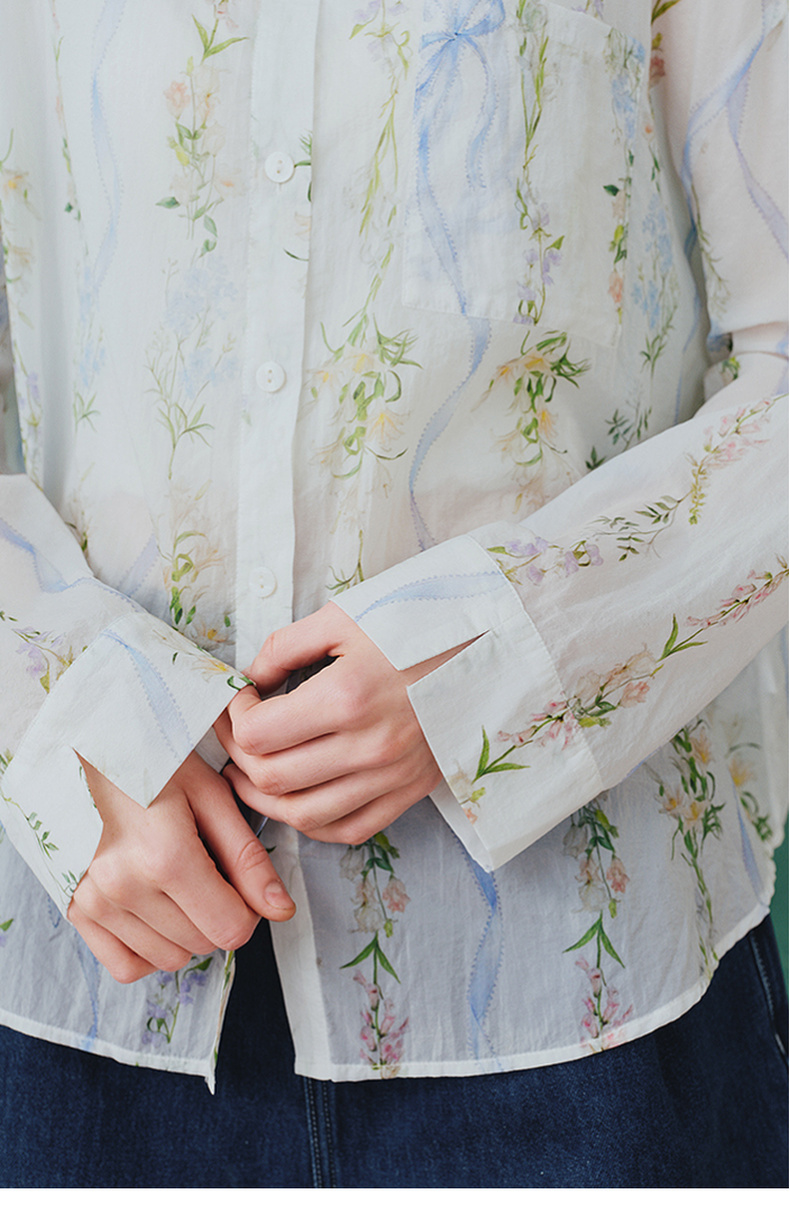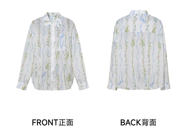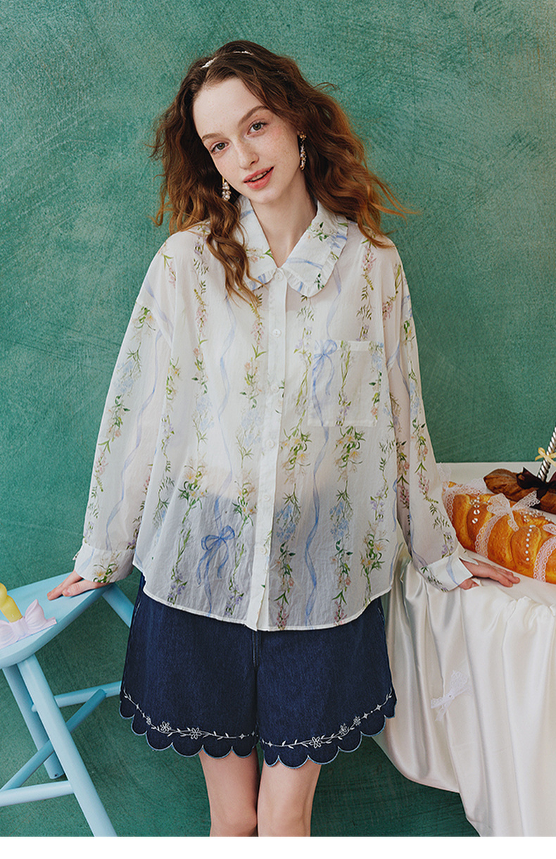 两三事 蜜夏神谕 2025春季新款文艺风蝴蝶结大翻领印花衬衫女宽松