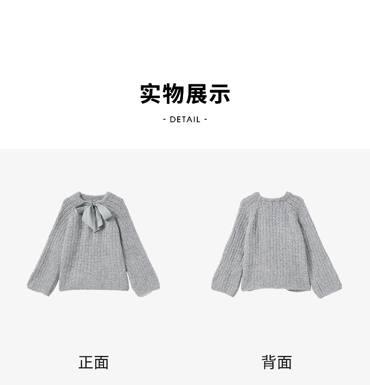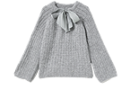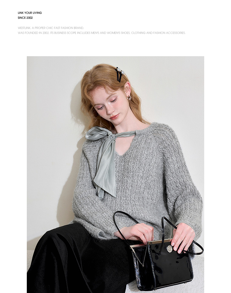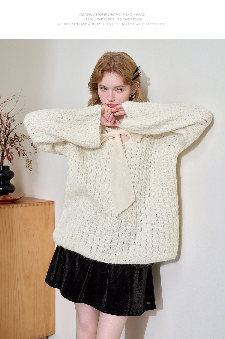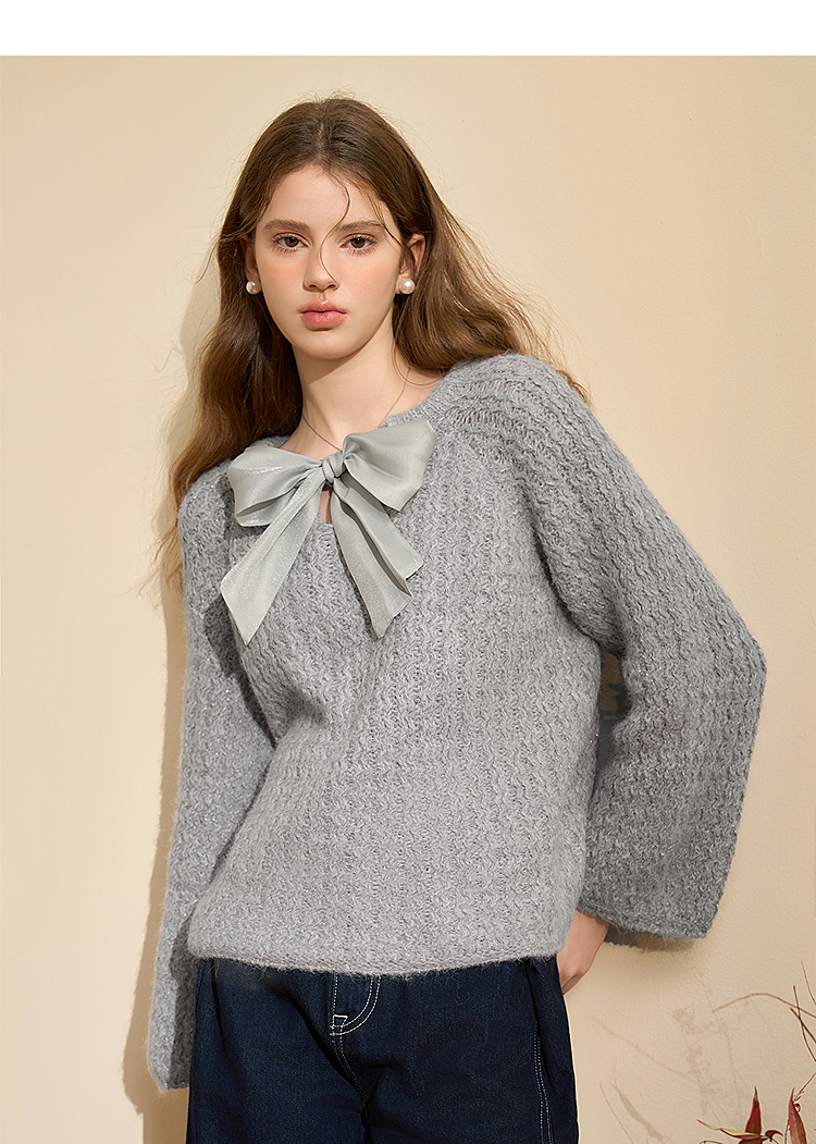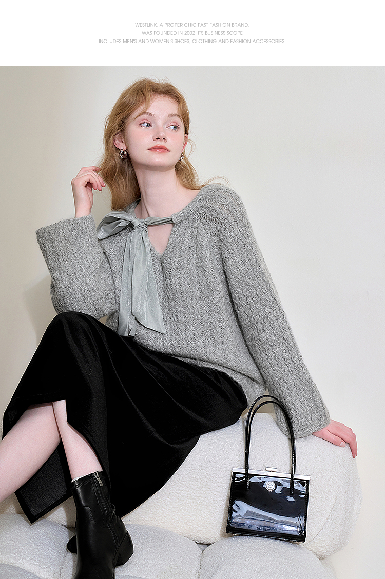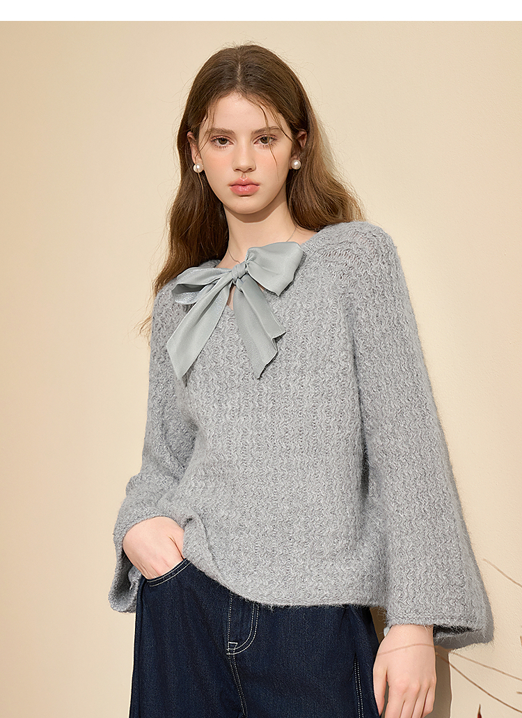 西遇蓝色v领毛衣女冬季新款宽松慵懒风蝴蝶结套头针织衫D0044081
