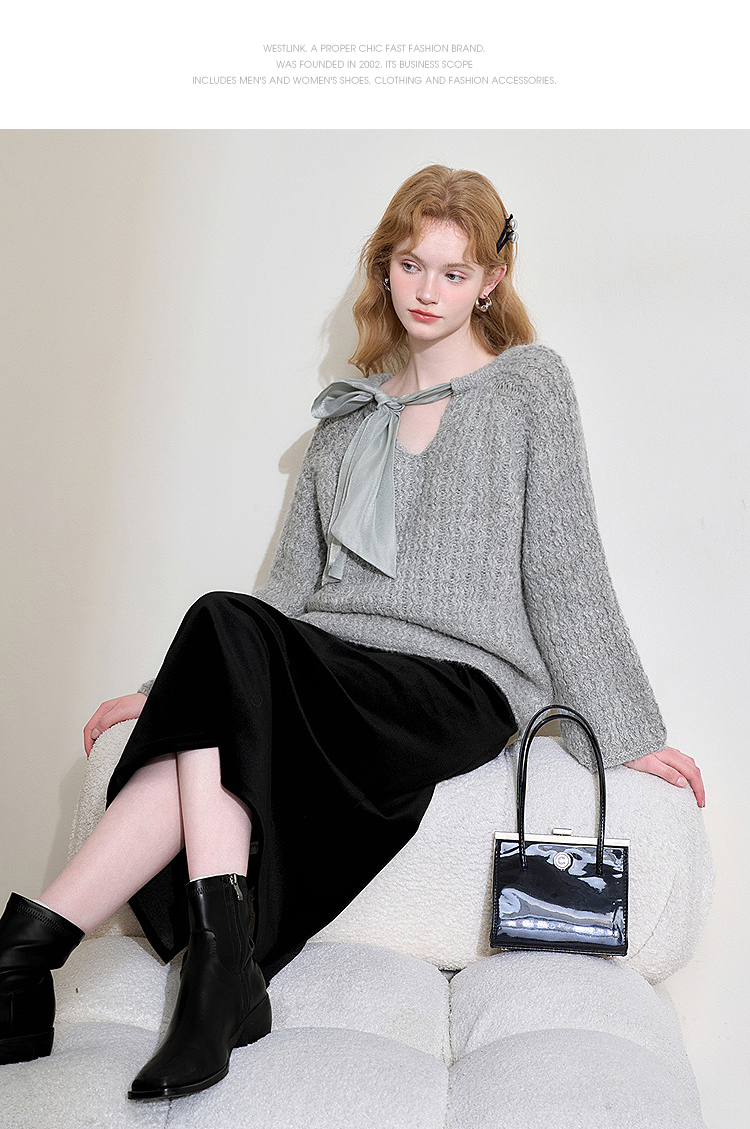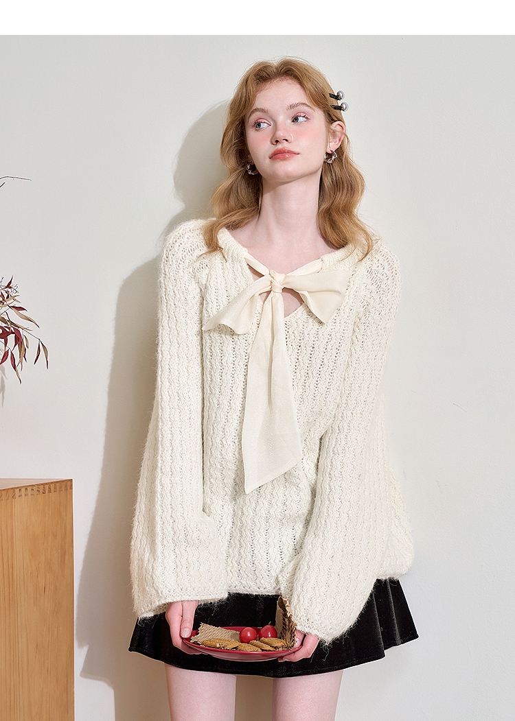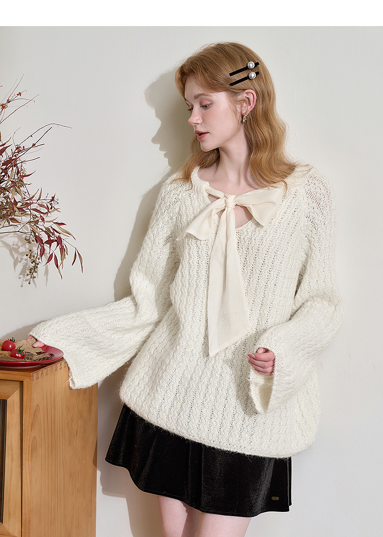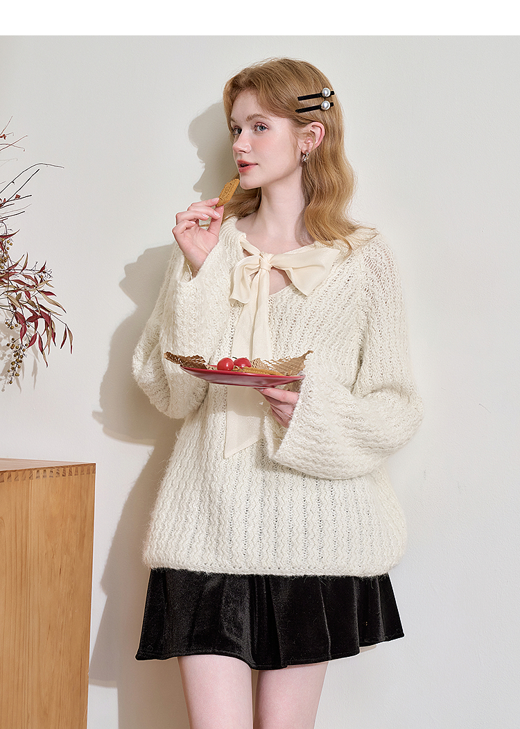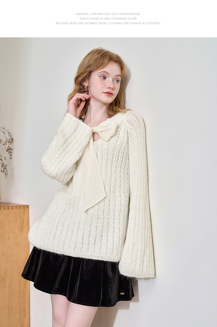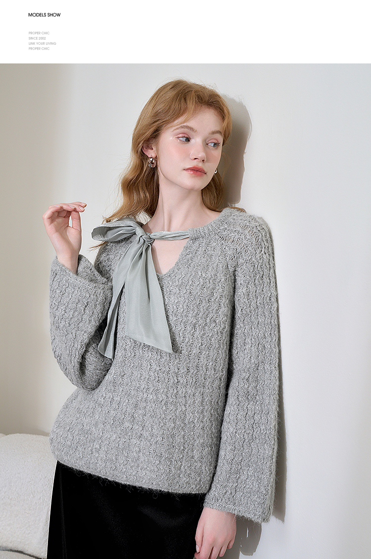西遇蓝色v领毛衣女冬季新款宽松慵懒风蝴蝶结套头针织衫D0044081