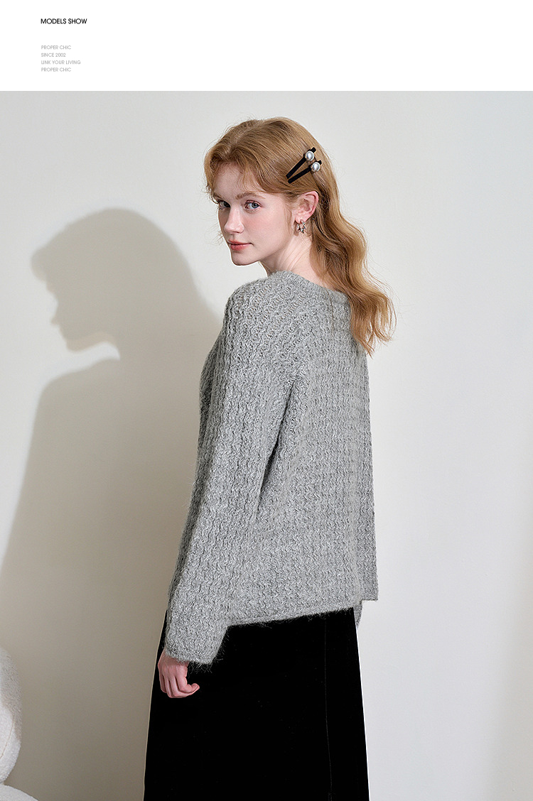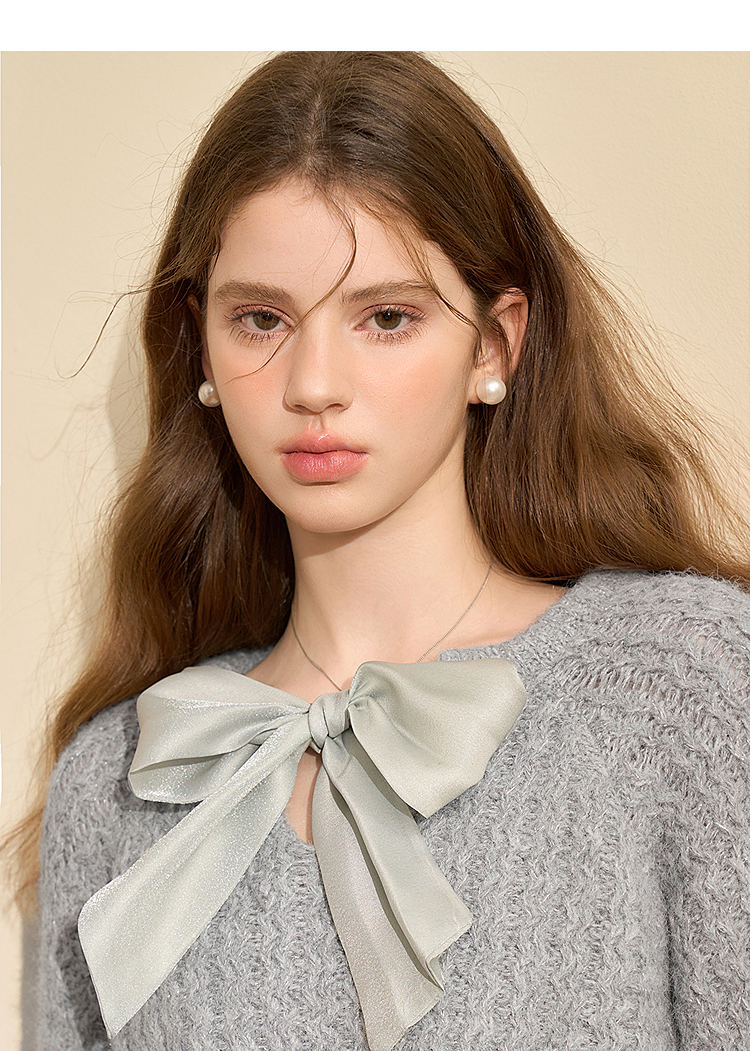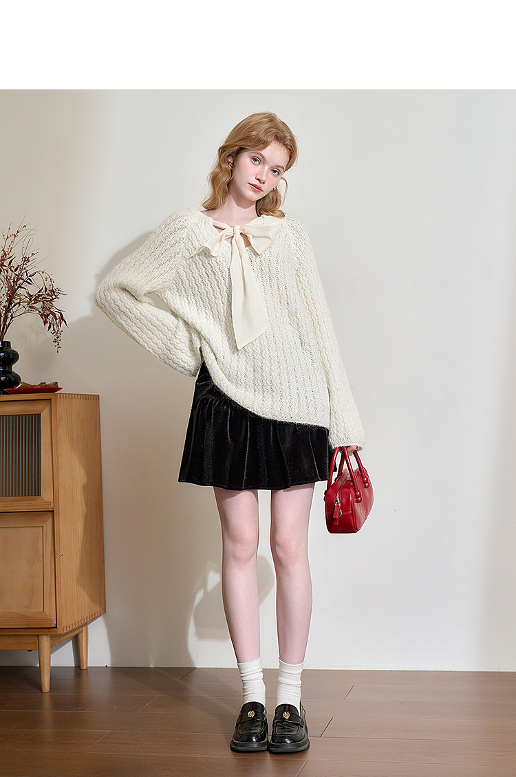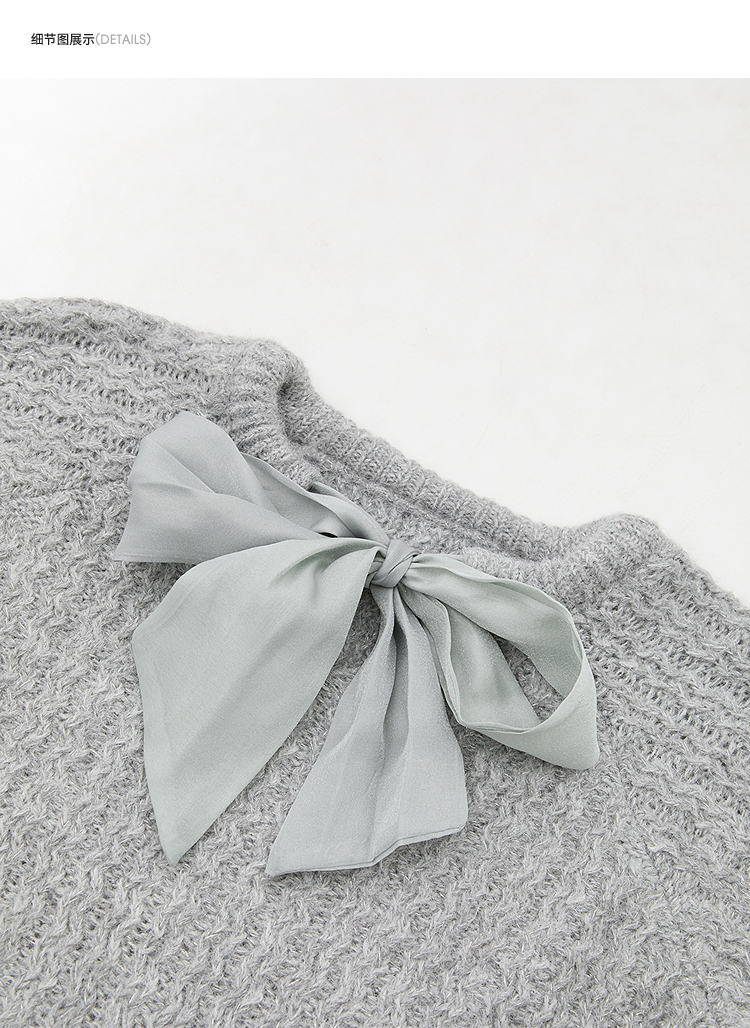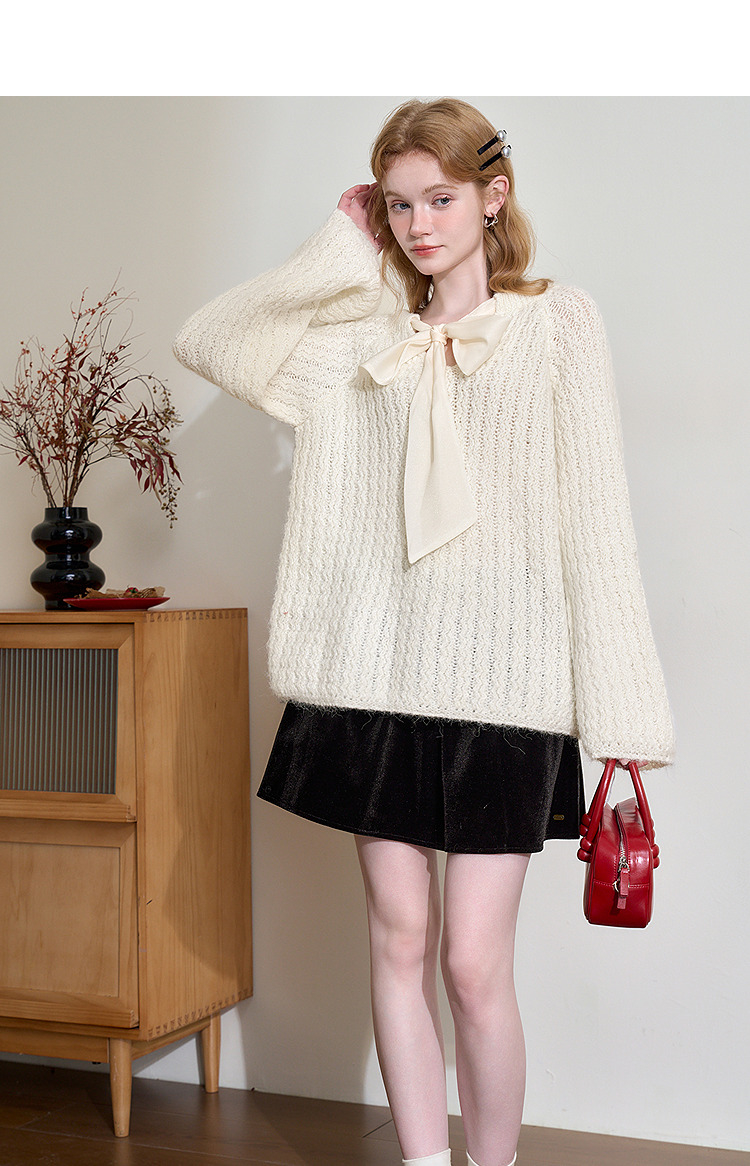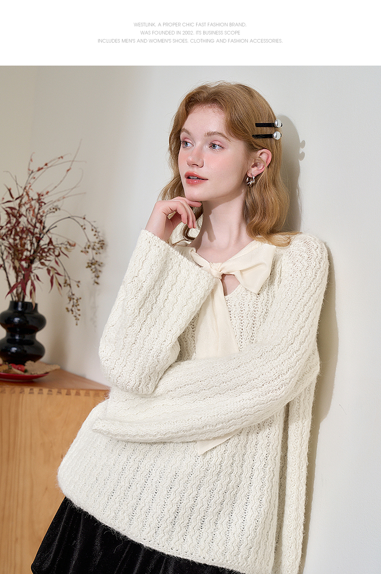 西遇蓝色v领毛衣女冬季新款宽松慵懒风蝴蝶结套头针织衫D0044081
