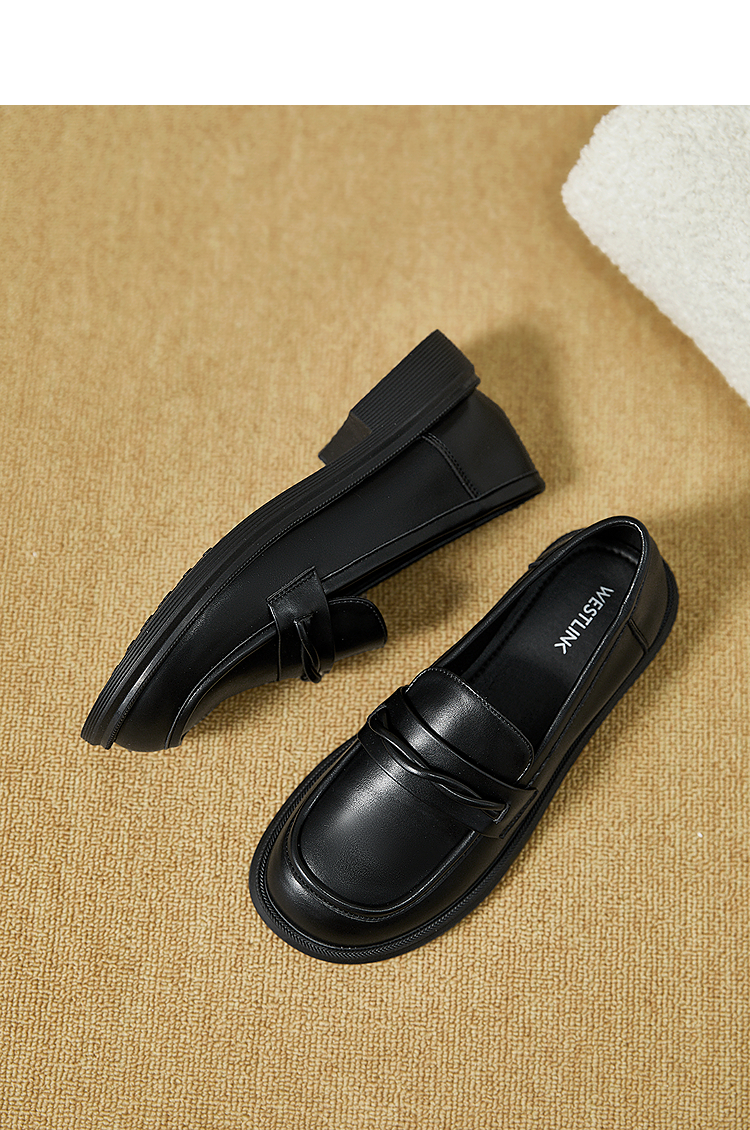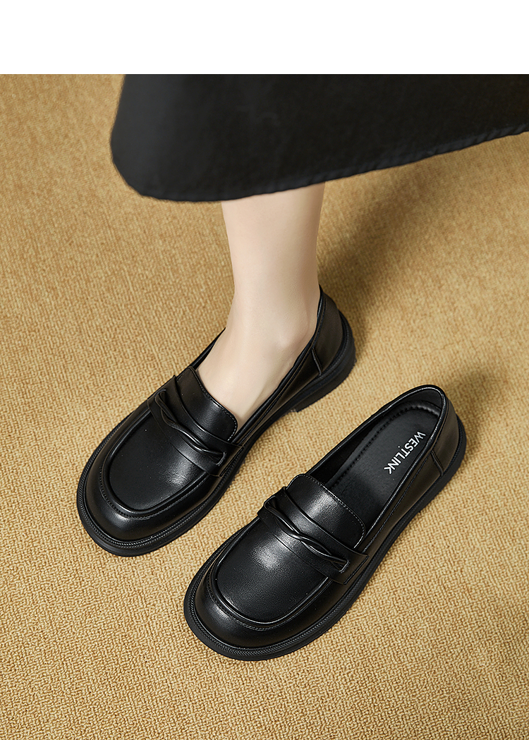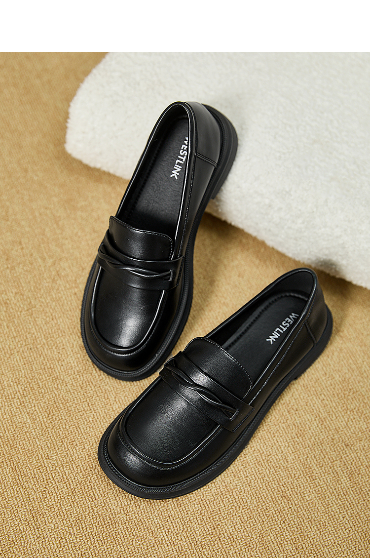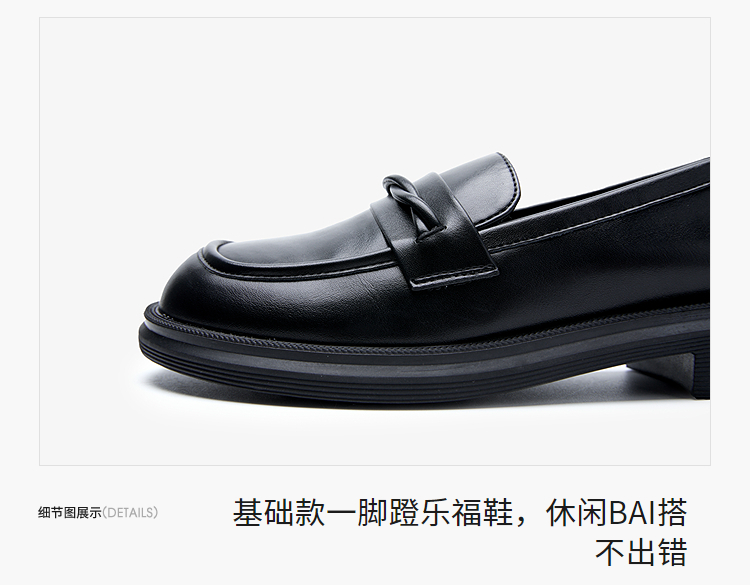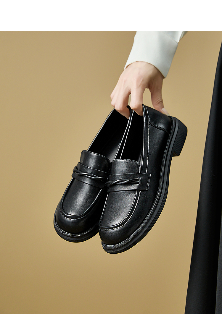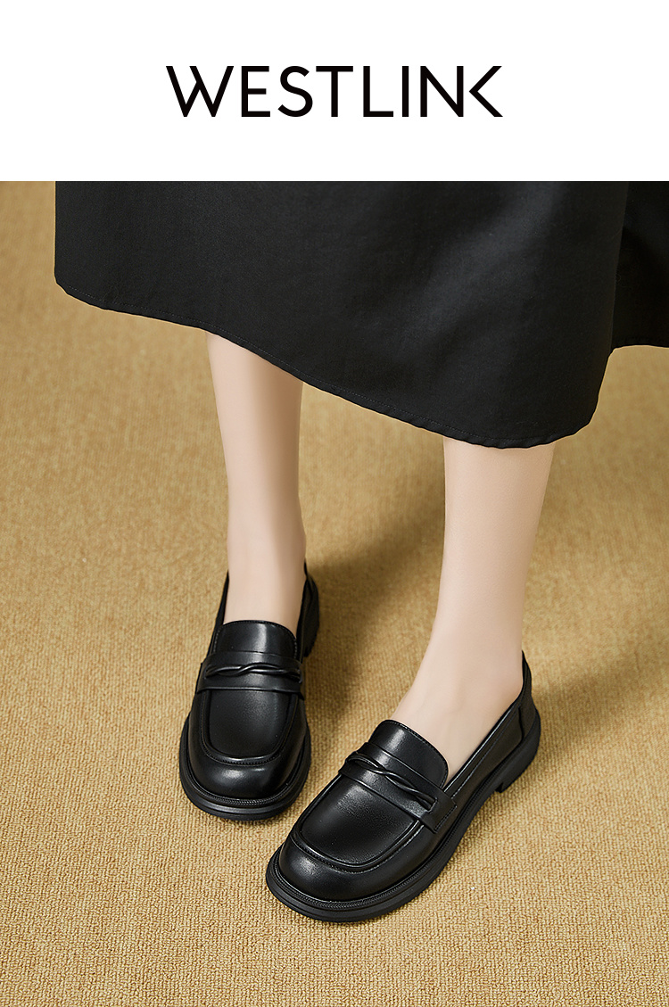 西遇平底乐福鞋女新款秋季法式简约一脚蹬低跟单鞋黑色小皮鞋V1857104
