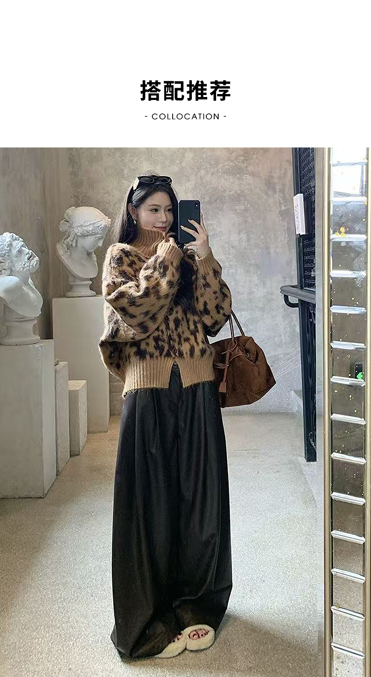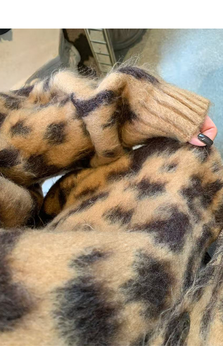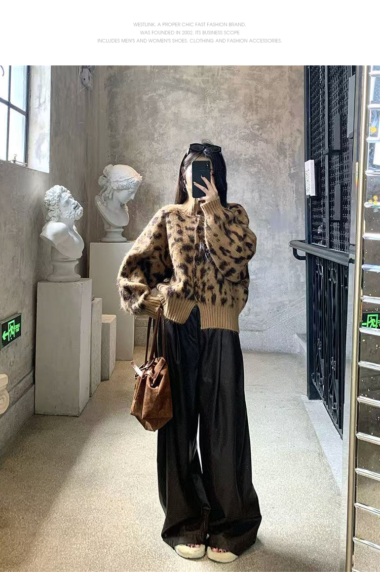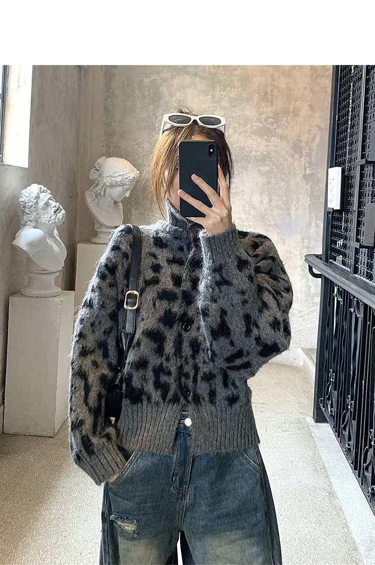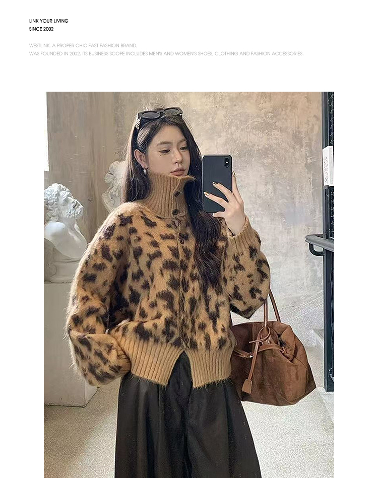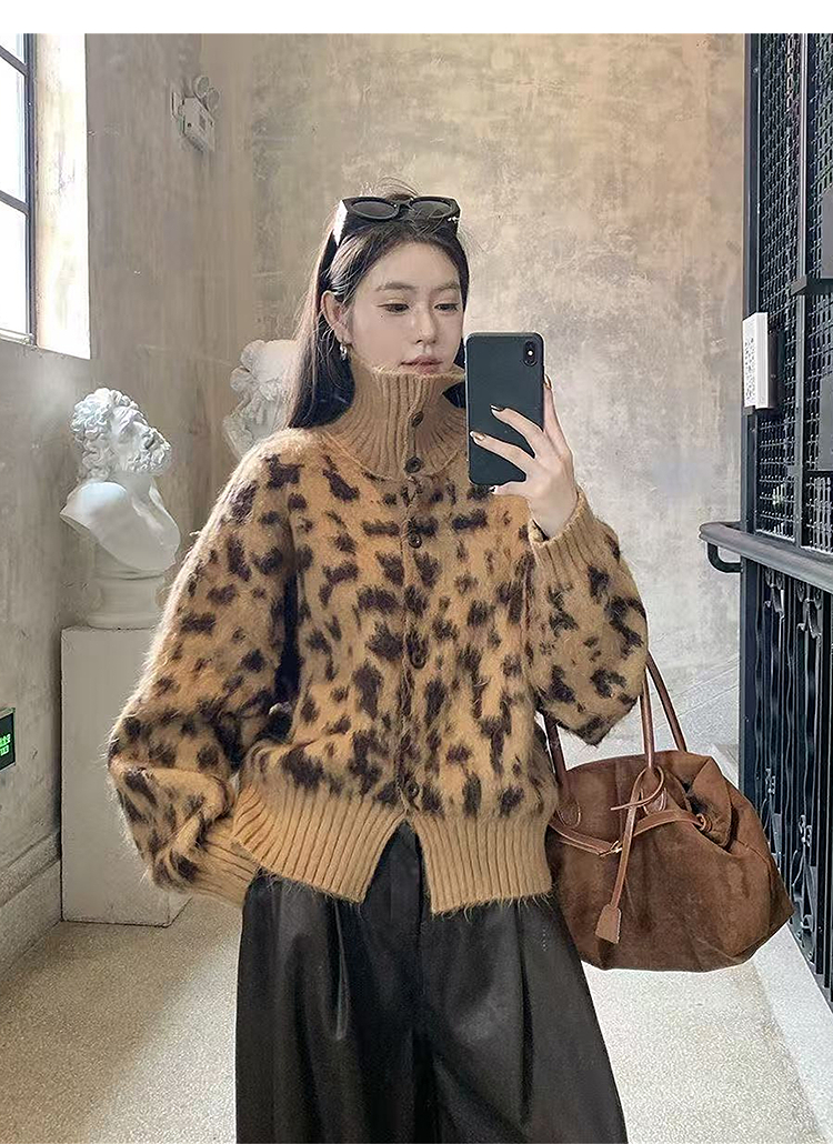 西遇立领针织开衫女冬季新款设计感洋气豹纹开叉毛衣外套SS051736