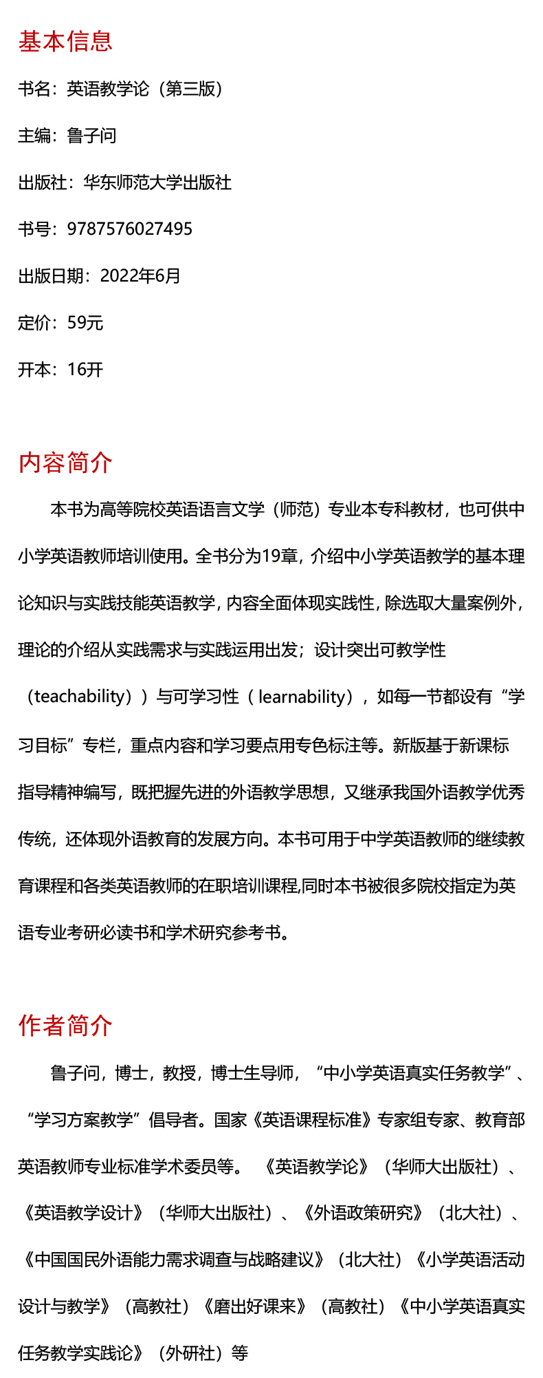全书按照19周为一个教学周期设计为19章。全书各章每一节都设置了“学习目标”专栏,将需要突出的重点内容和学习要点用蓝色文字标注。对于图表表述更为清晰明了的内容,采用图表形式总结归纳以有助于理解;部分可能理解有困难的内容,也辅助以图表形式。本教材每一节均包括三部分:第一部分为“思考”,这一部分从教学案例或教学思考中提出问题。第二部分为“学习”,这一部分先列出本节学习目标,然后呈现本节内容。内容目次清晰,运用图表辅助讲解。每一节在教学过程中都设计了思考问题,引导读者思考常见问题,包括英语学习和教学中的问题。第三部分为“实践”,这一部分呈现实践分析活动并提供参考答案。每一章在所有节内容之后设计了“本章小结”与“进一步阅读建议”。