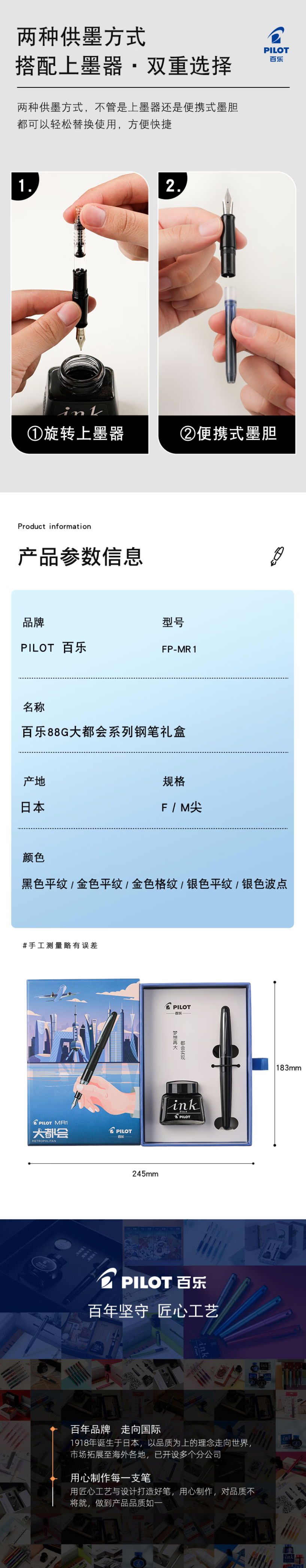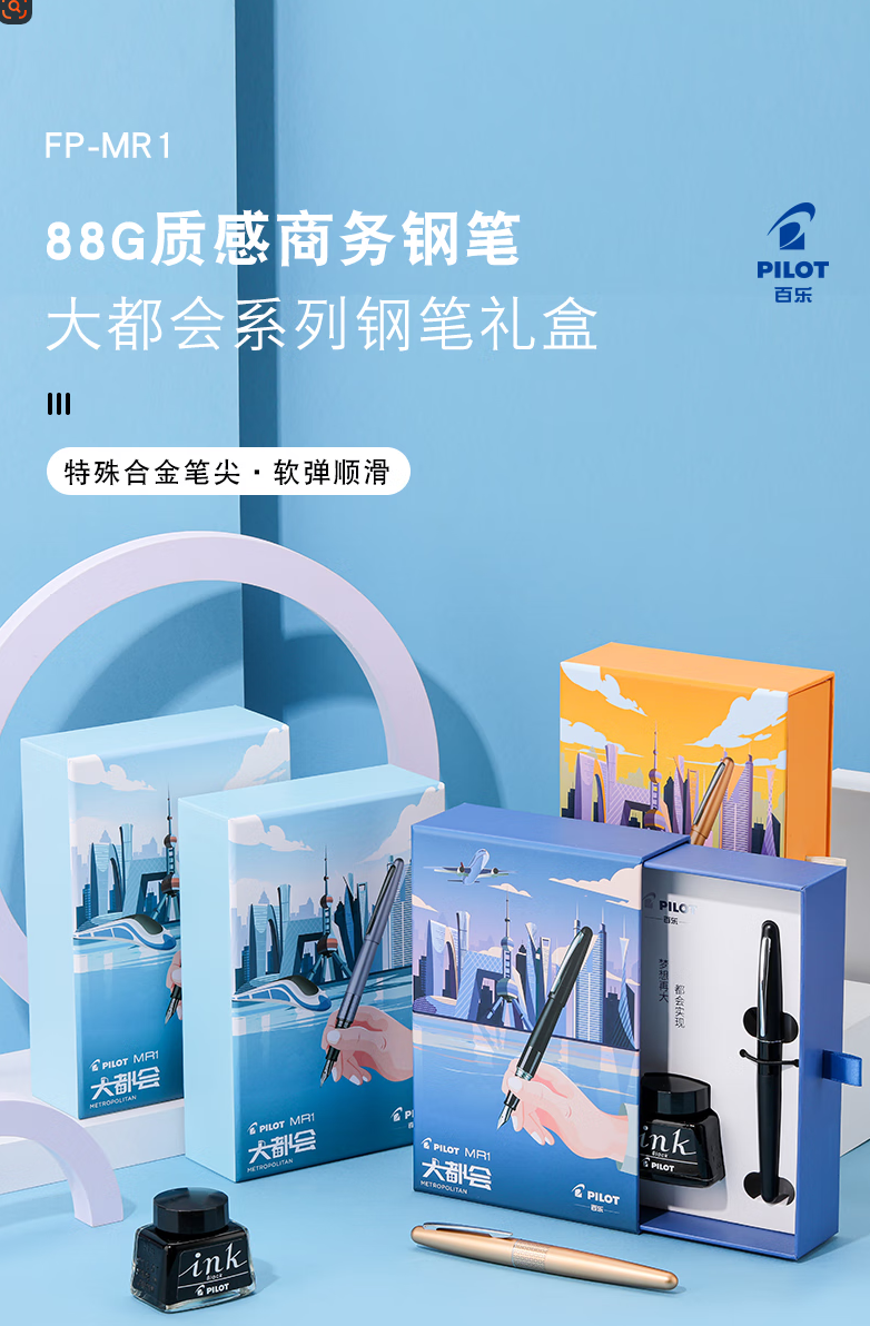 百乐(PILOT)88G钢笔金属签字笔墨水大都会系列套装 FPMR1钢笔学生书法练字 黑色平纹F咀