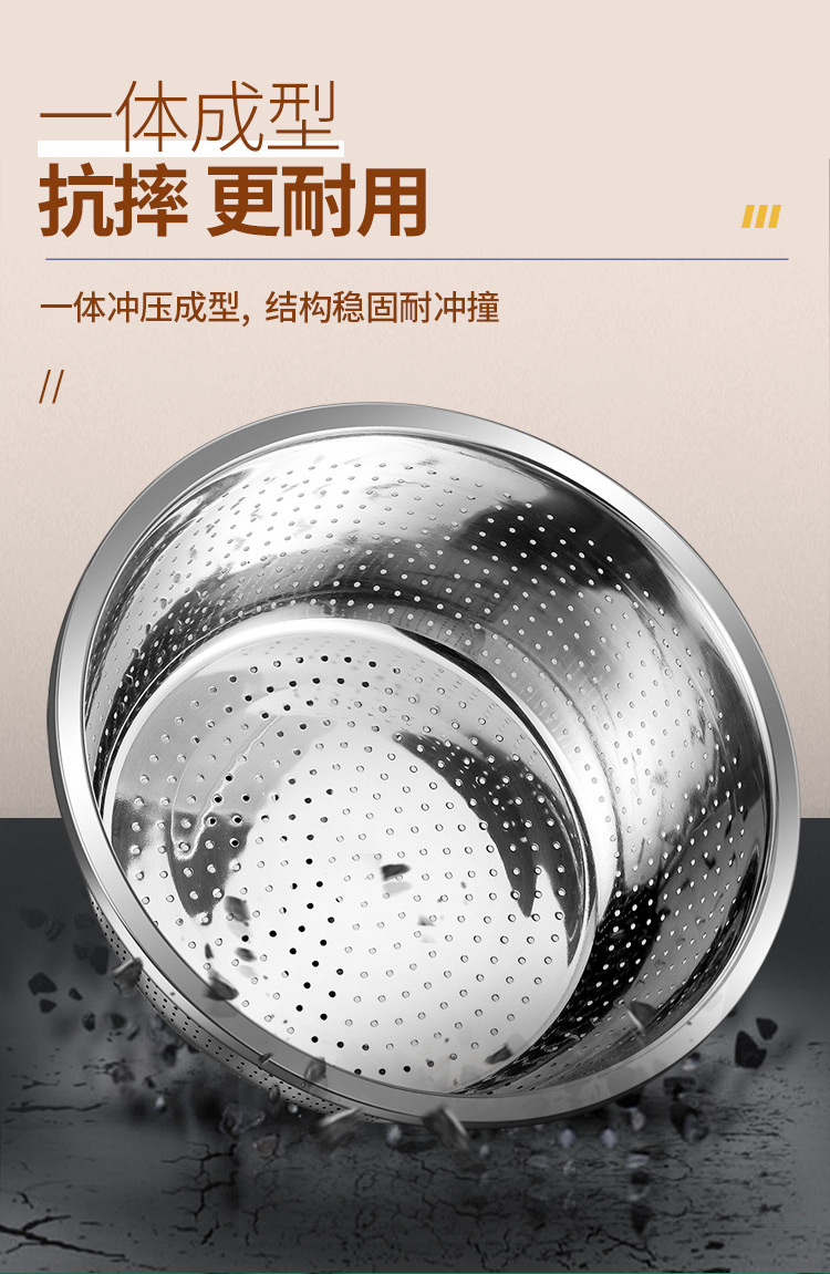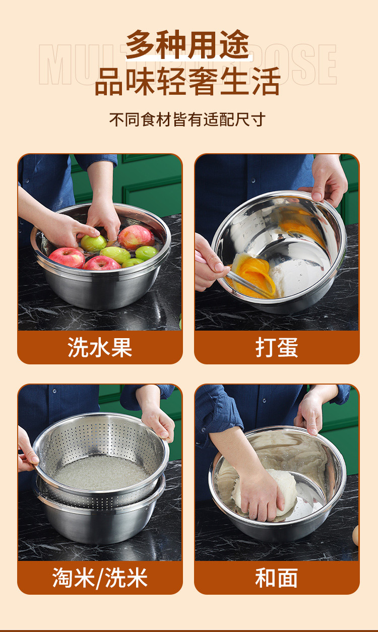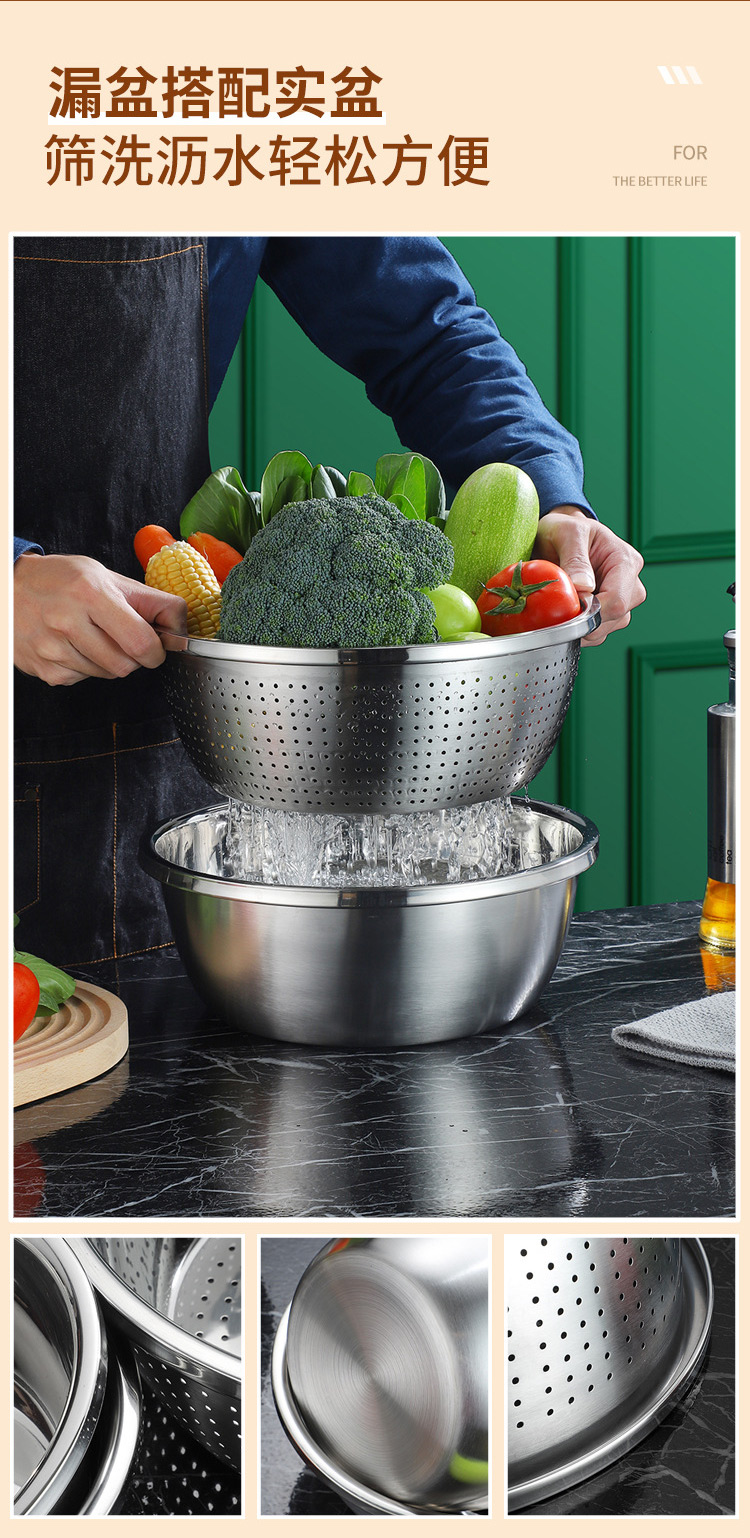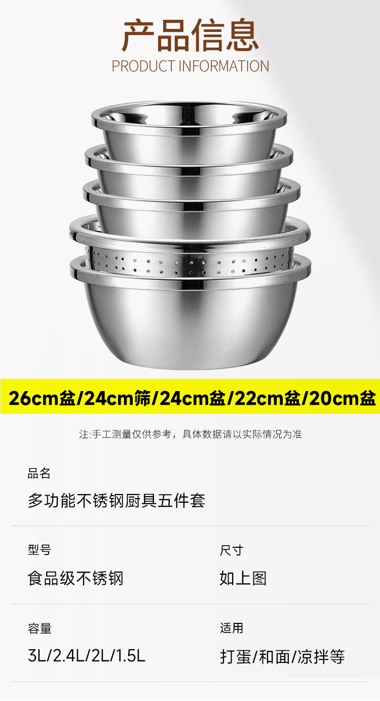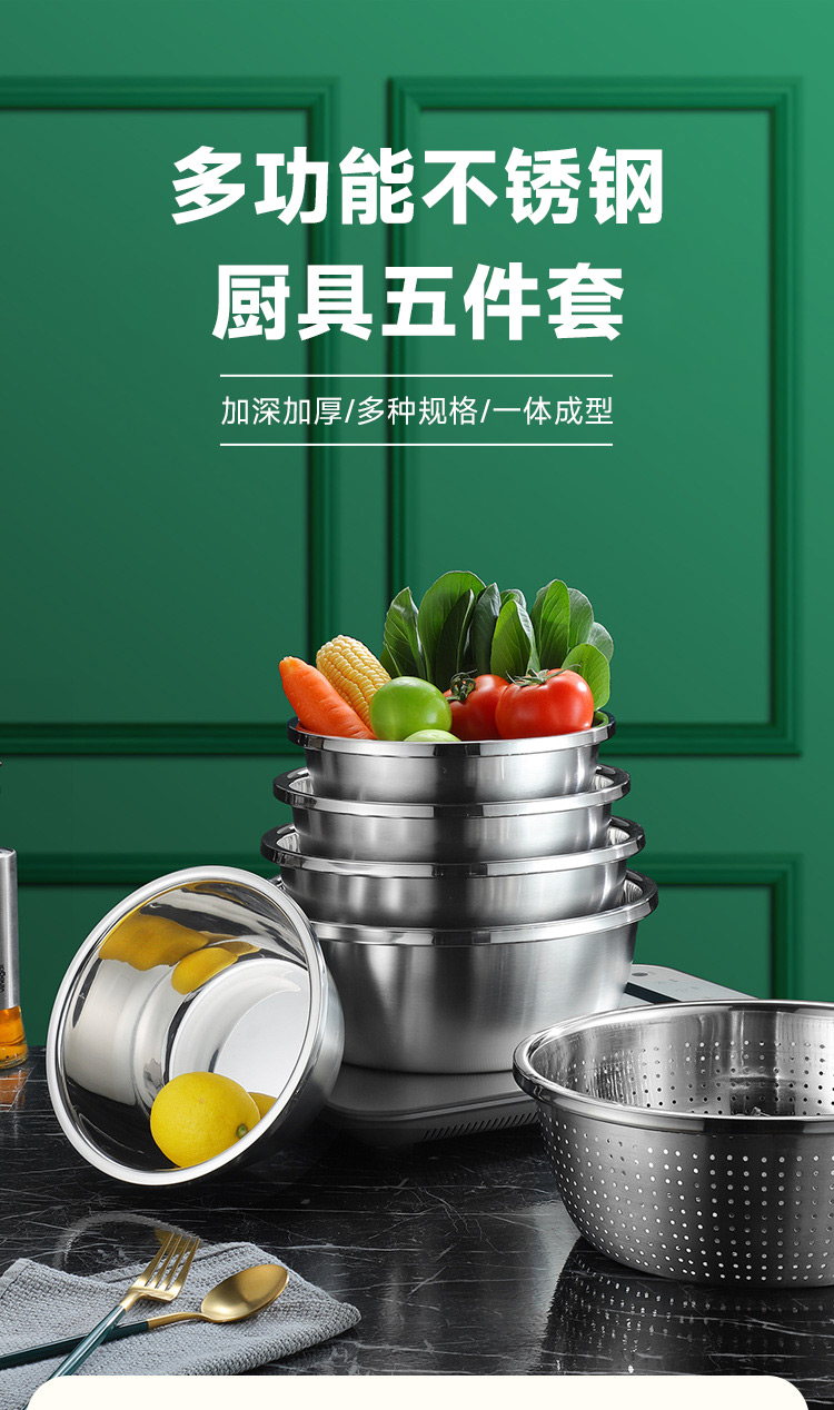 【精选】翰乐多功能不锈钢4盆1筛五件套 耐高温可加热 加深加厚 做工精细