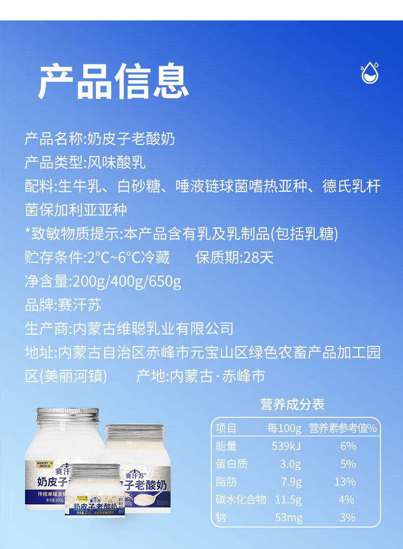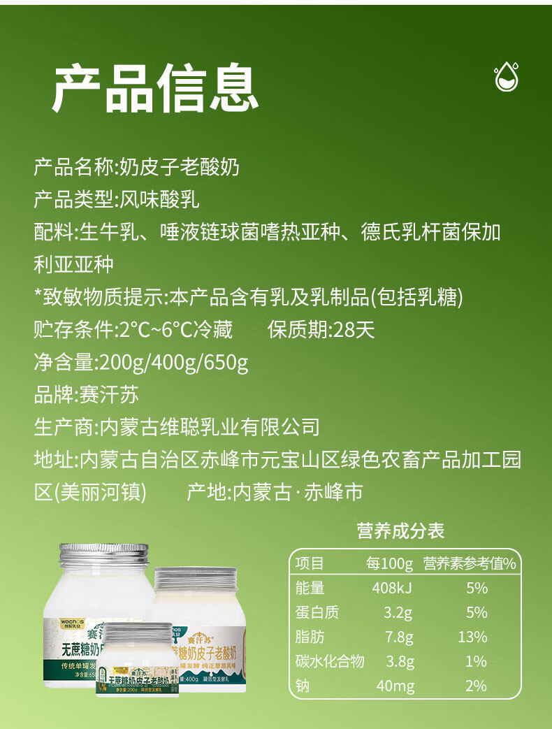 赛汗苏无蔗糖奶皮子老酸奶650g