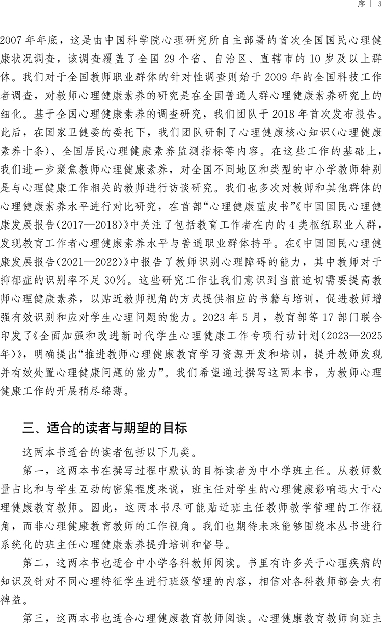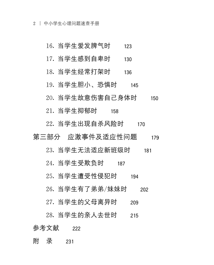 本书以中小学生心理问题的常见表现为脉络,通过提供必要的心理健康知识与技能,帮助教师更好地识别和解决学生的心理问题。通过查阅本手册,教师可快速判断学生异常表现背后可能存在的心理问题,明晰工作边界,拓展思维模式,增强理论联系实际的能力,初步了解对于相应心理问题的有效应对方式,从而在工作中更加自信与从容。本书是一线教师重要的工作参考用书。