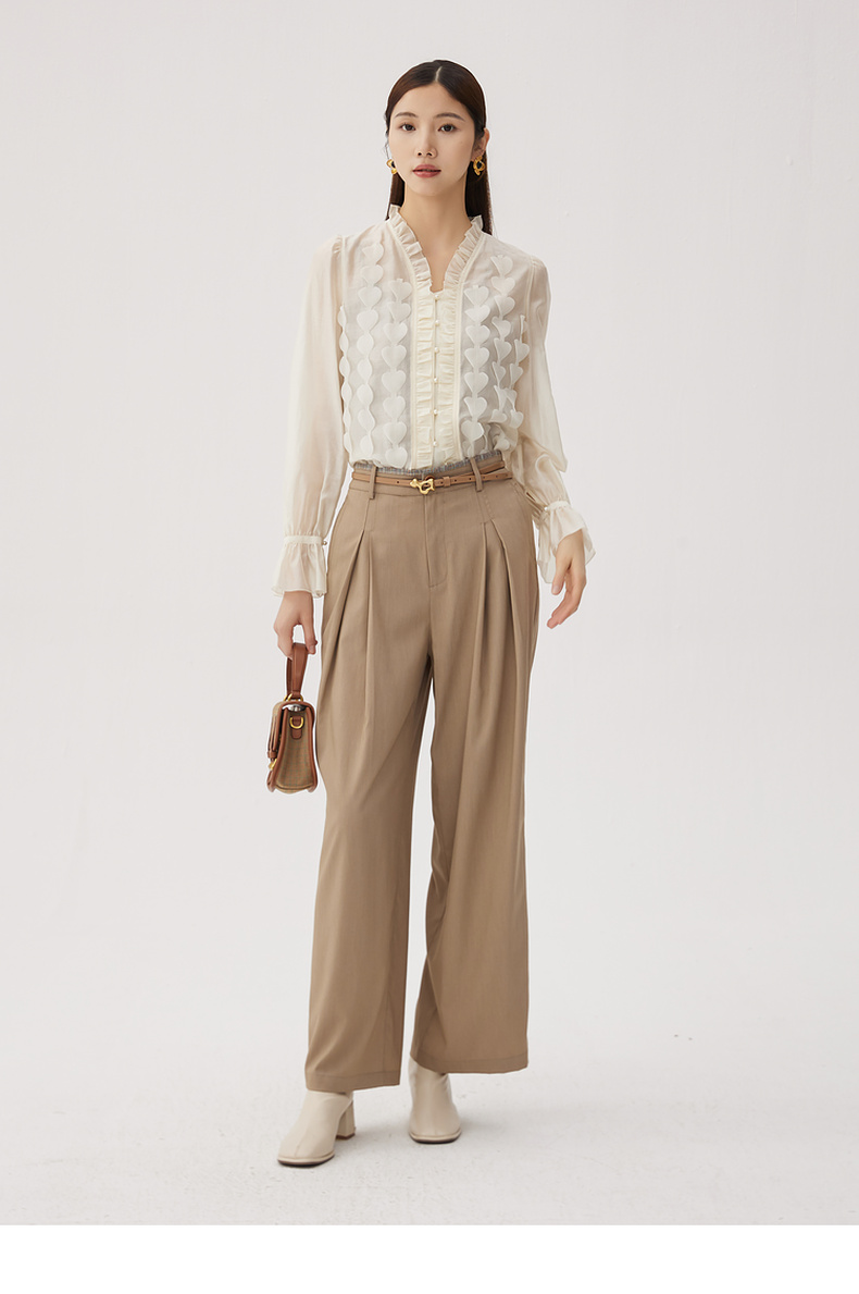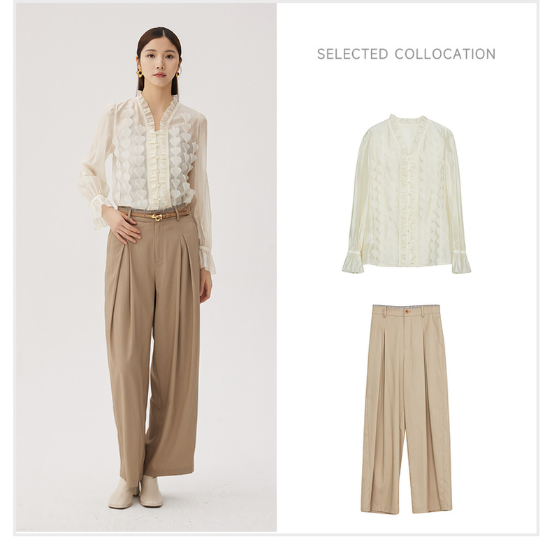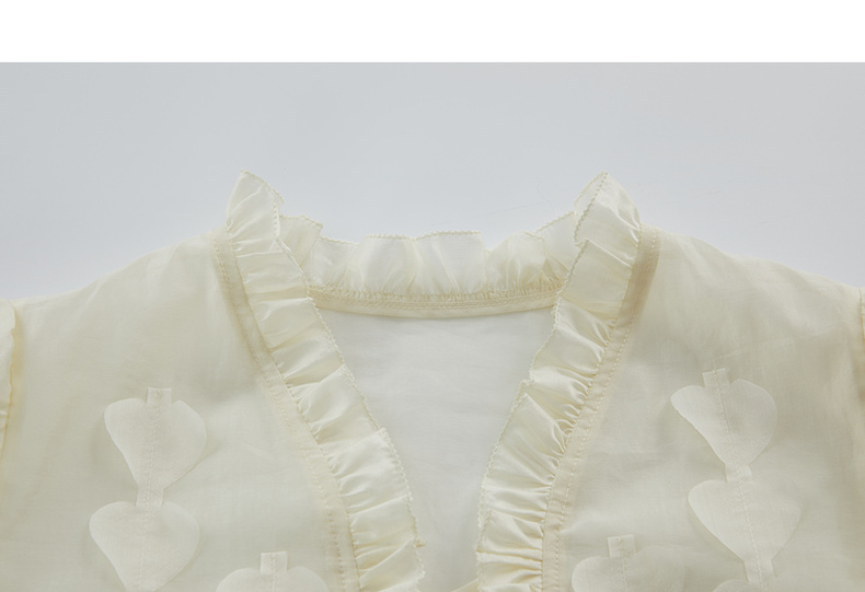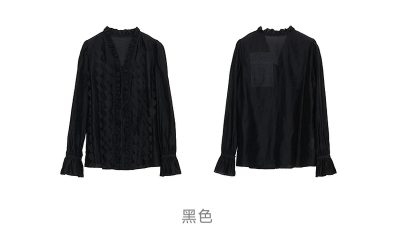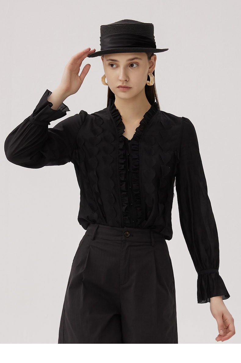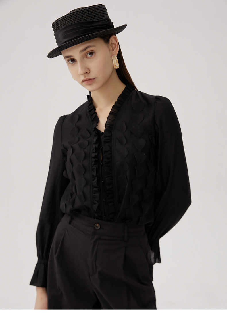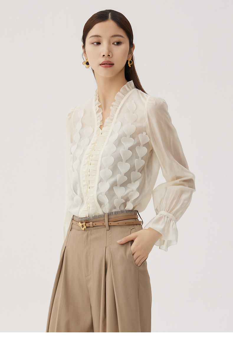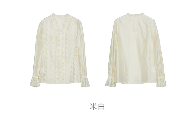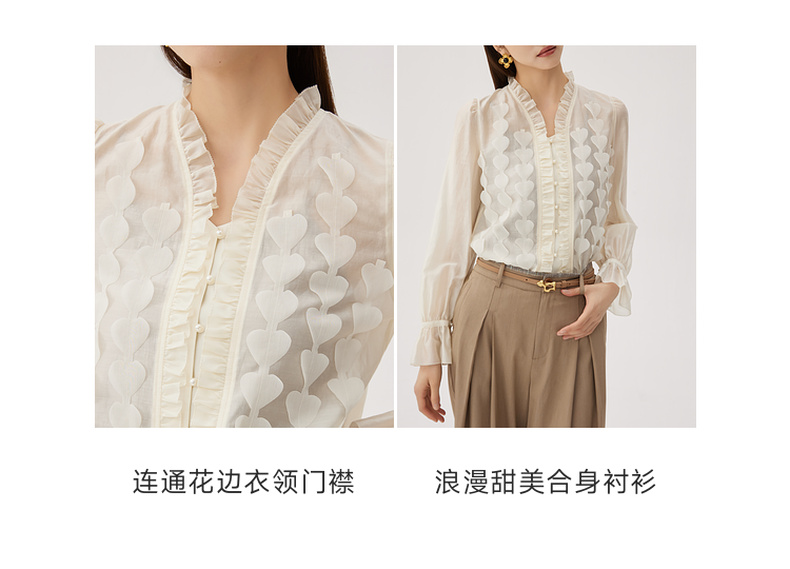 谜底衬衫长袖女2024秋新品优雅浪漫花边V领宽松刺绣衬衣243MC1104