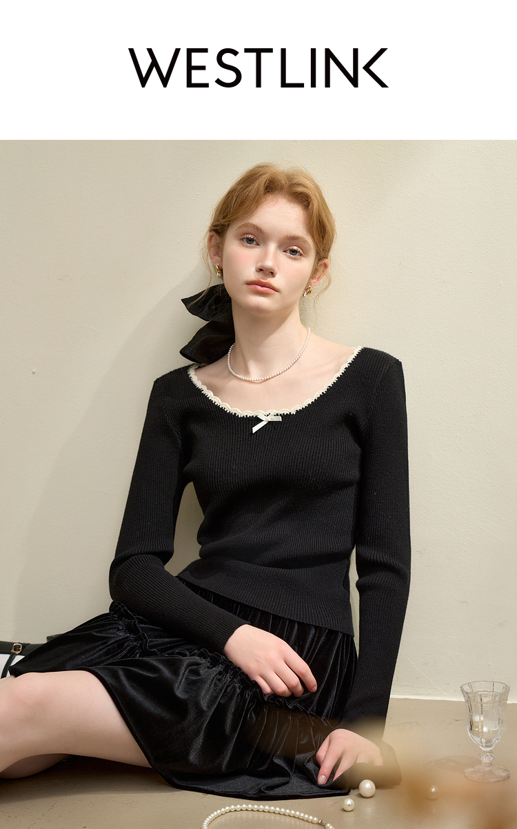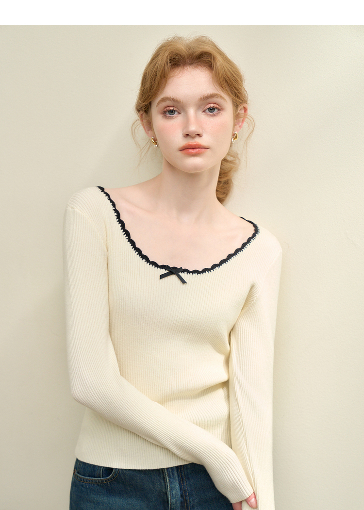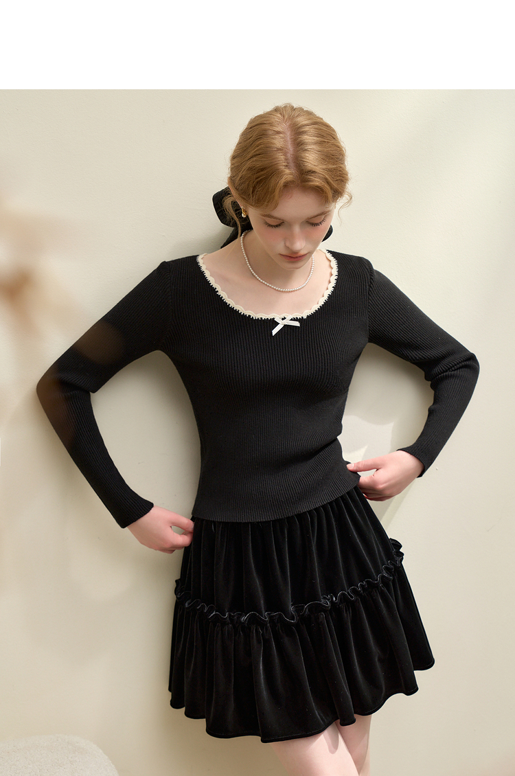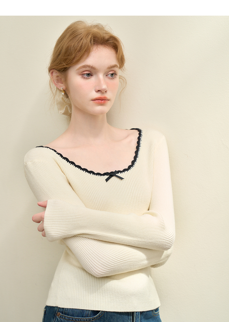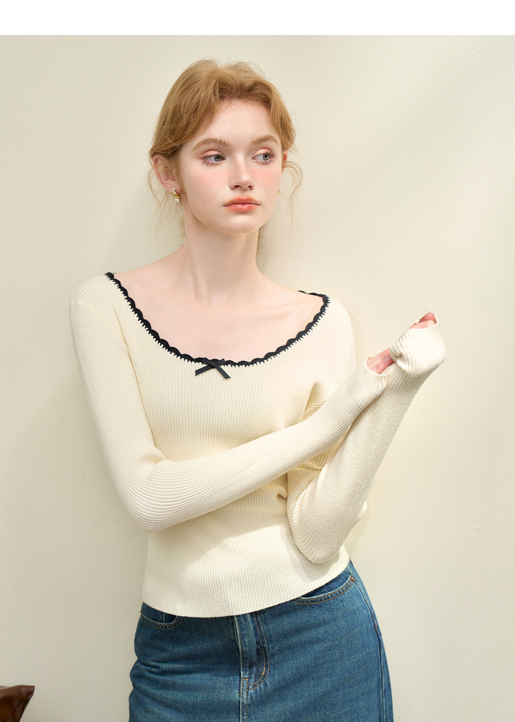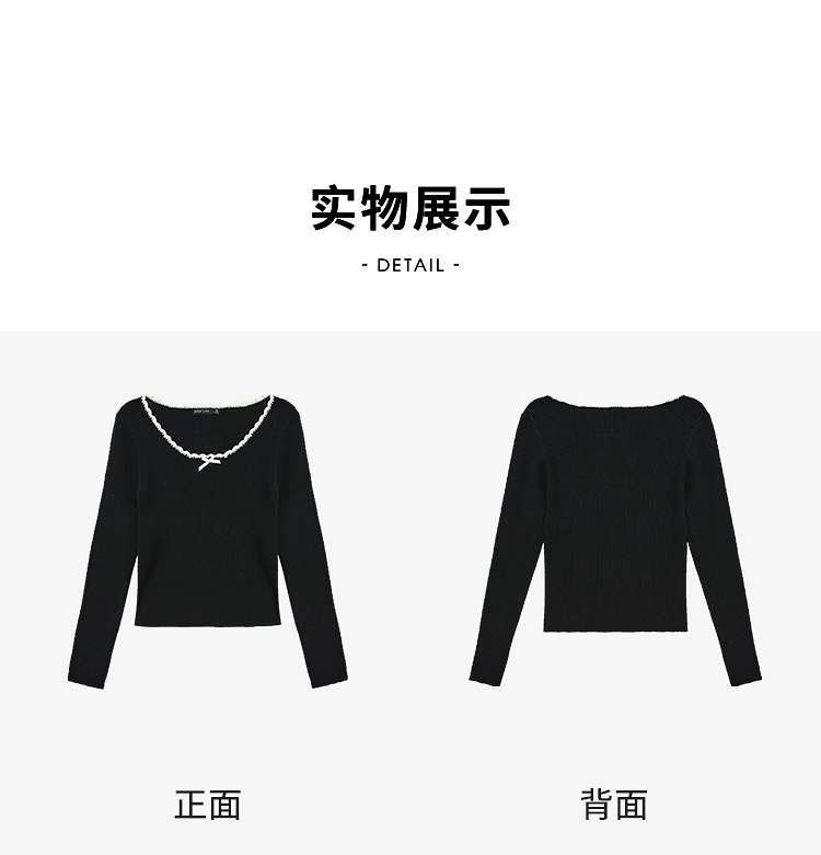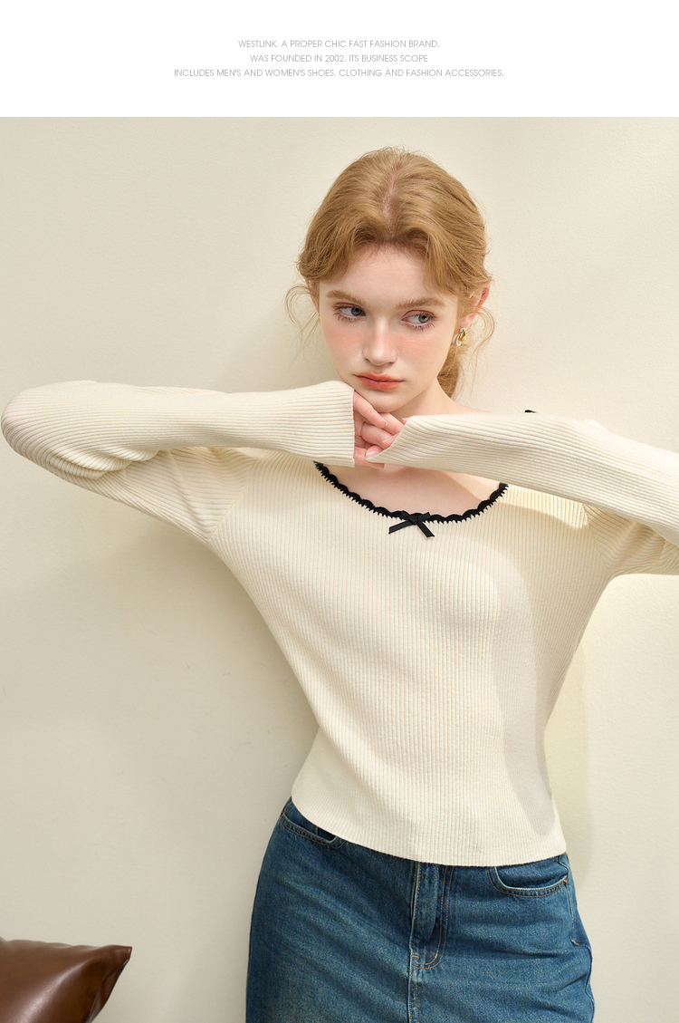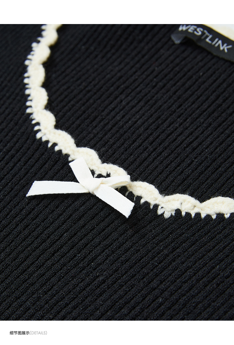 法式浪漫撞色花边蝴蝶结长袖针织衫女早春修身短款上衣V4342657