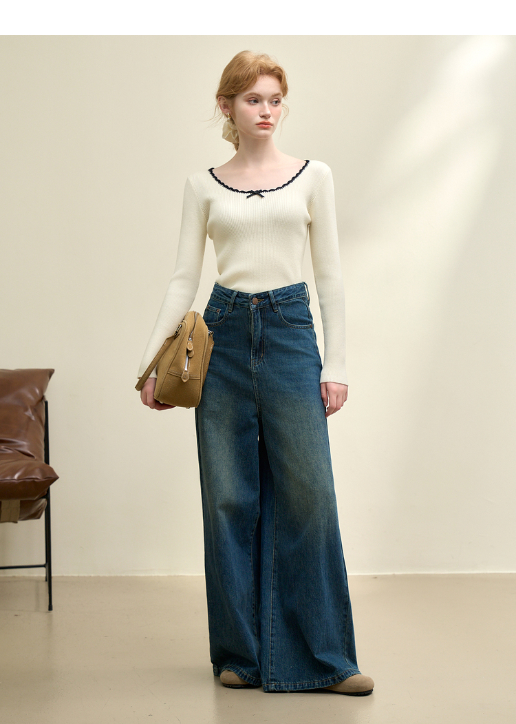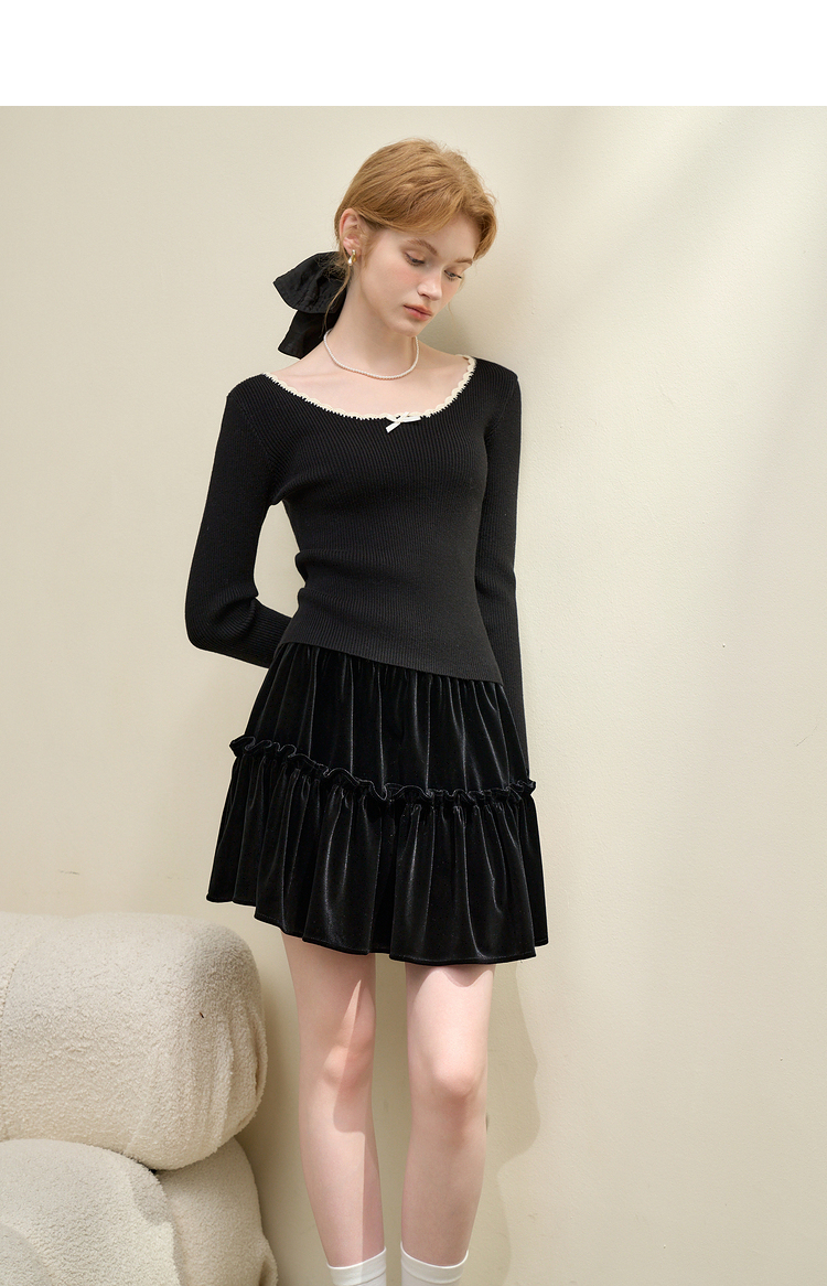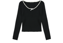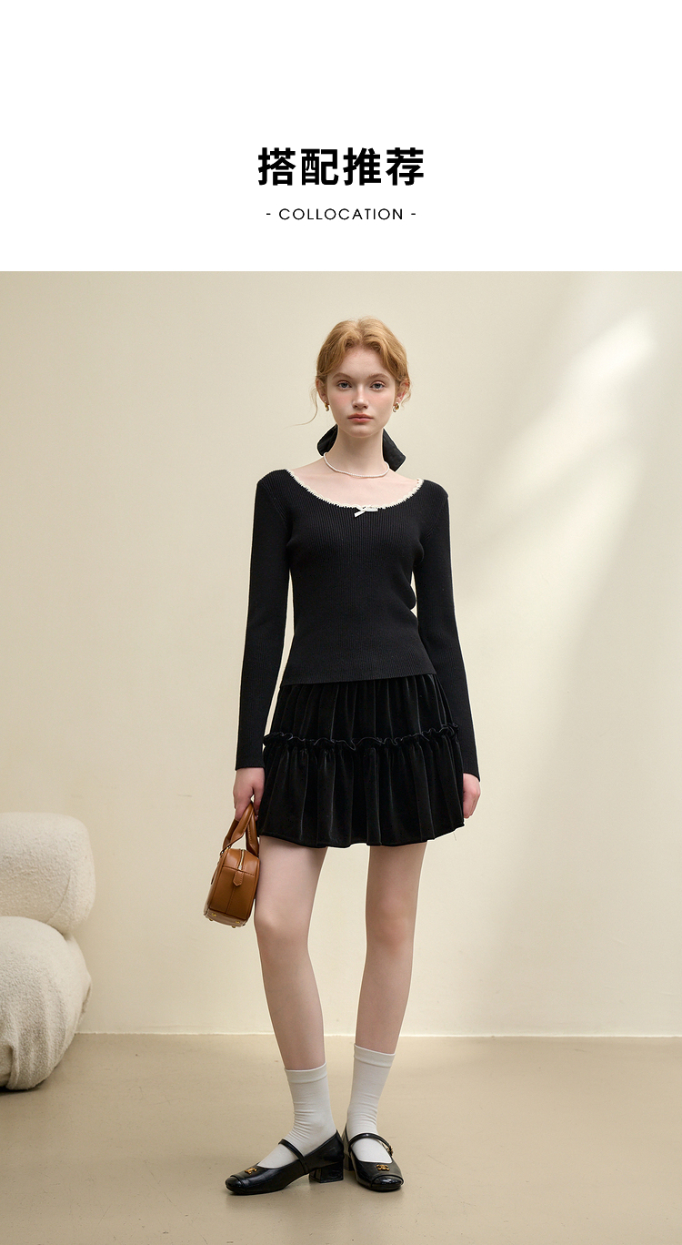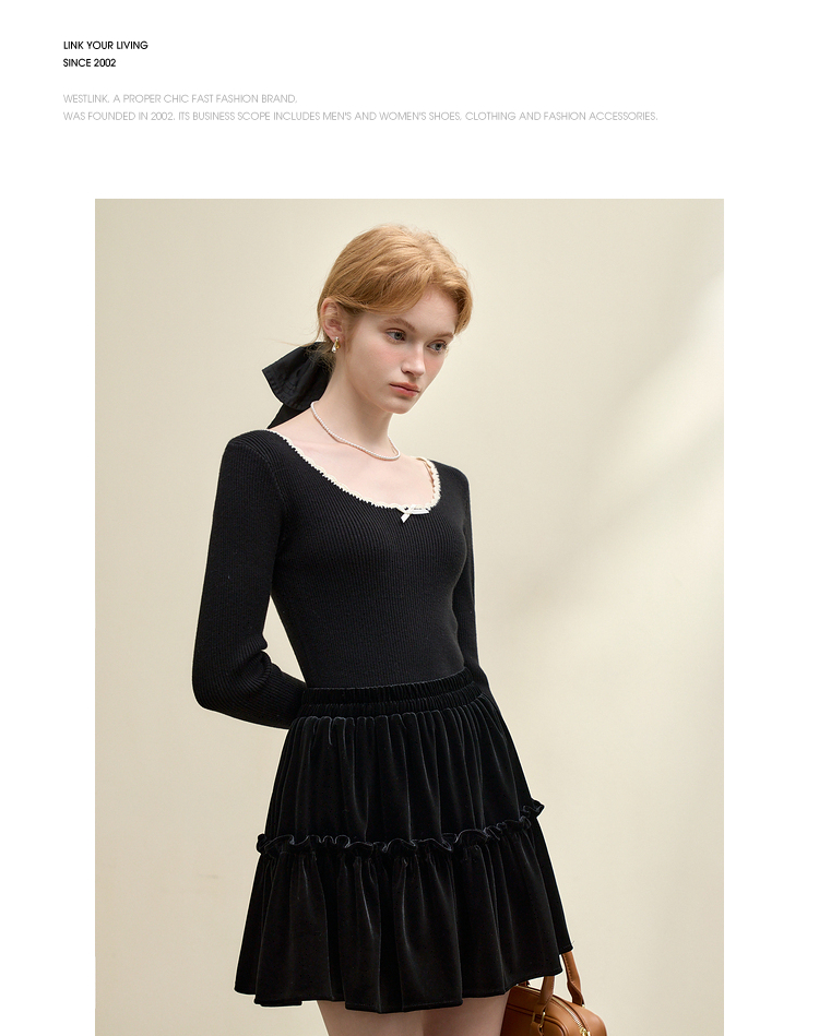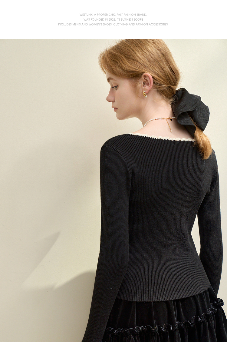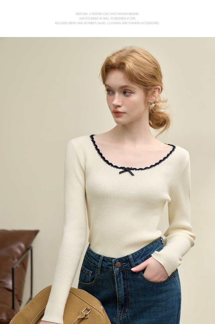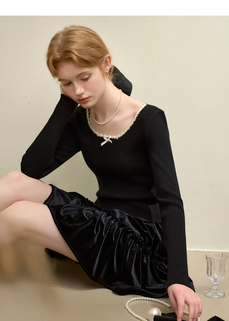法式浪漫撞色花边蝴蝶结长袖针织衫女早春修身短款上衣V4342657