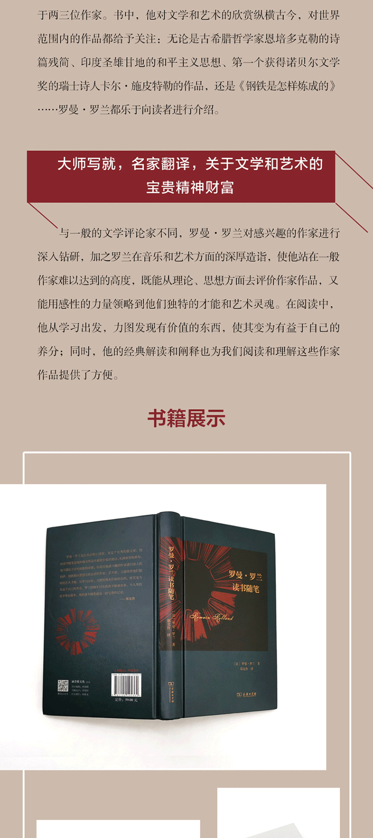 与一般的文学评论家不同,罗曼·罗兰不满足于浮光掠影的涉猎,而是对感兴趣的作家进行深入钻研,加之罗兰在音乐和艺术方面的深厚造诣,使他站在一般作家难以达到的高度,既能从理论、思想方面去评价作家作品,又能用感性的力量领略到他们独特的才能和艺术灵魂。在阅读中,他从学习出发,力图发现有价值的东西,使其变为有益于自己的养分;同时,他的经典解读和阐释也为我们阅读和理解这些作家作品提供了方便。罗曼·罗兰的读书随笔,是他留给现代读者的一份宝贵的精神财富。
