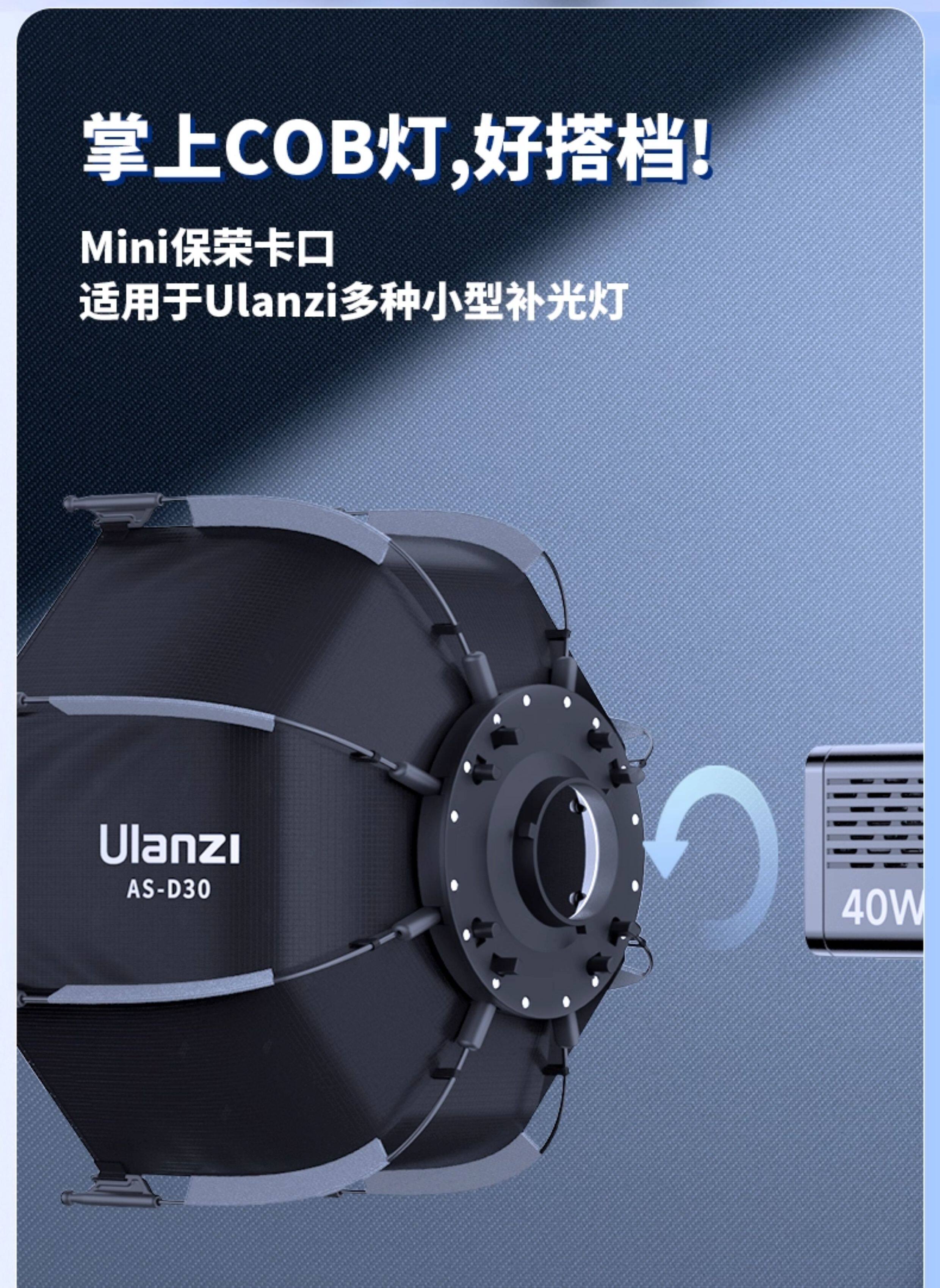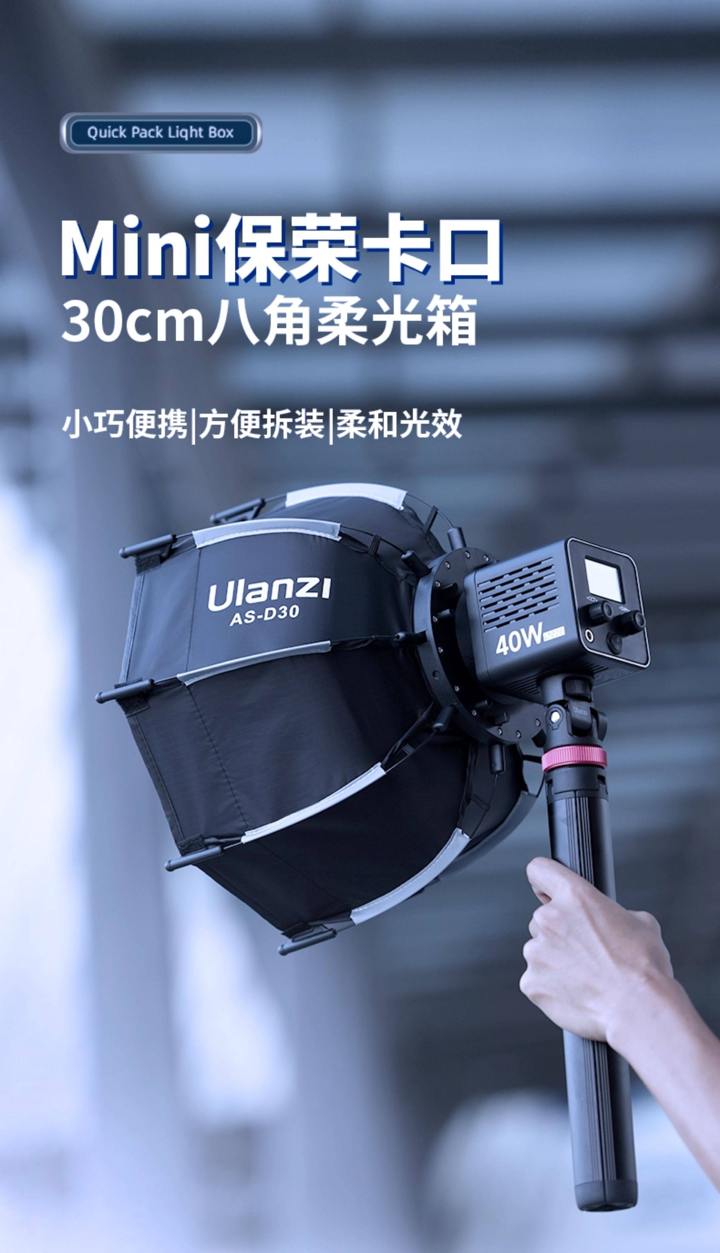 Ulanzi优篮子Mini保荣卡口快拆八角30cm柔光箱40W掌上COB灯直播间补光灯柔光罩摄影棚灯光设备配件