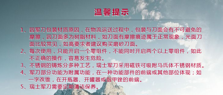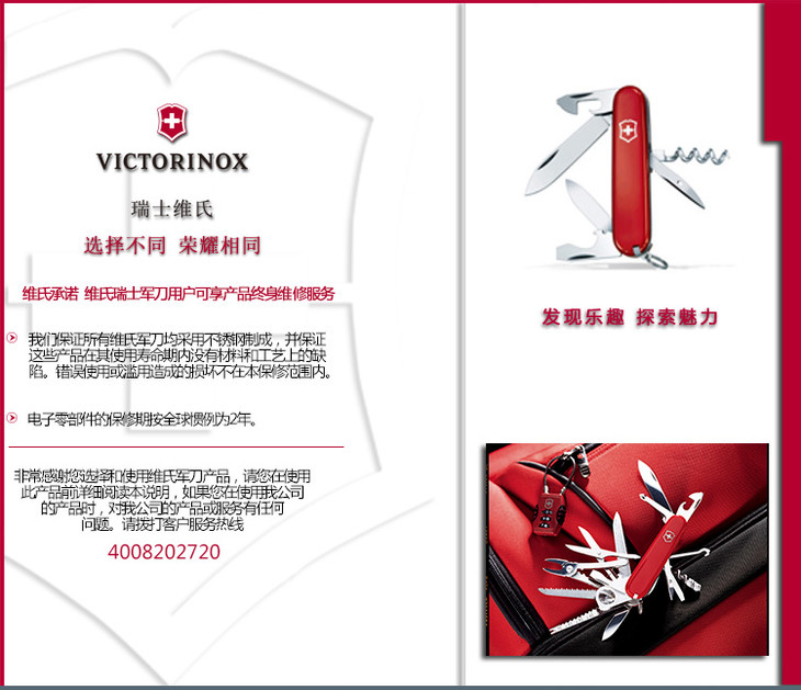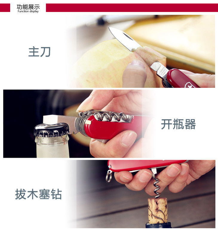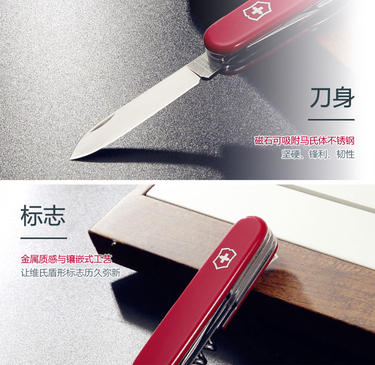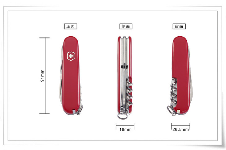 >维氏VICTORINOX瑞士军刀 攀登者(14种功能)红色光面1.3703 此款配备主刀、小刀、拔木塞钻(红酒钻)、开罐器(兼附)、小一字改锥(3mm)、开瓶器(兼附)、一字改锥(6mm)、剥线槽、钻孔锥、钥匙环、镊子、牙签、剪刀、多用钩等14种功能。这种多功能、方便及耐用的小刀适用于:旅行、登山、潜水及航模运动、修理自行车、汽车和其它业余爱好,瑞士军刀在紧急时刻、 危险关头也常是个好帮手。追求品质是瑞士军刀的传统,多年的发展使其每个组成部分都达到了造型与功能的合理结合,并受到众多瑞士维氏军刀拥簇者的喜爱。 (刃长:70mm) |