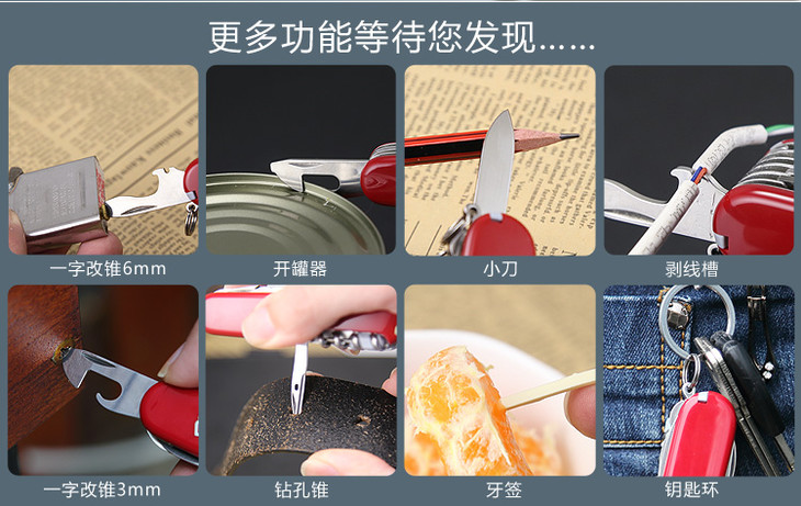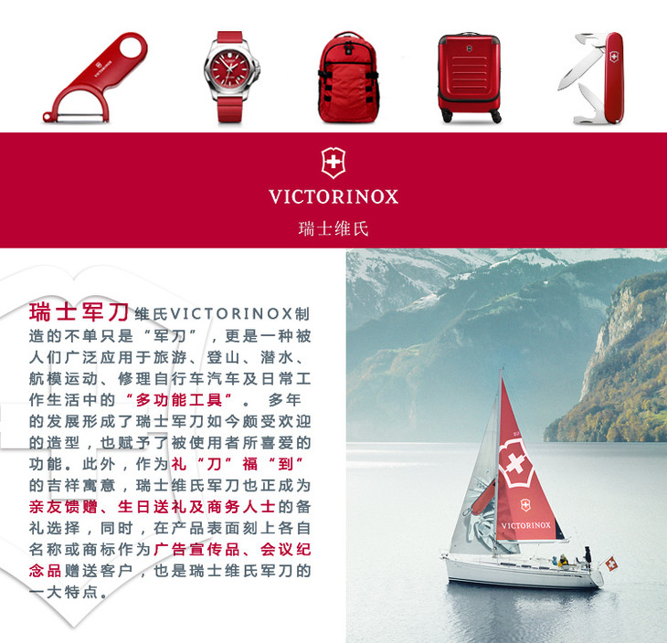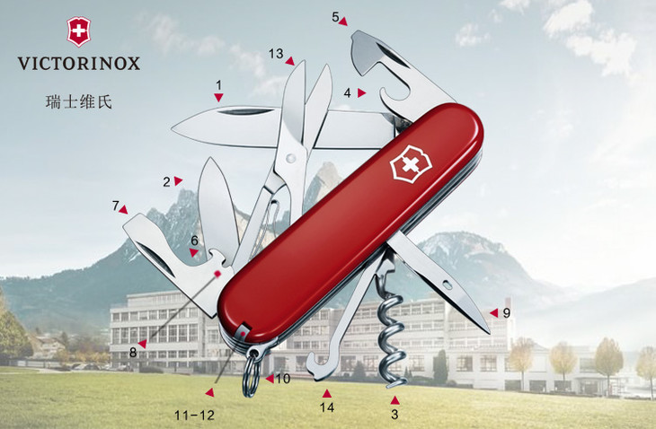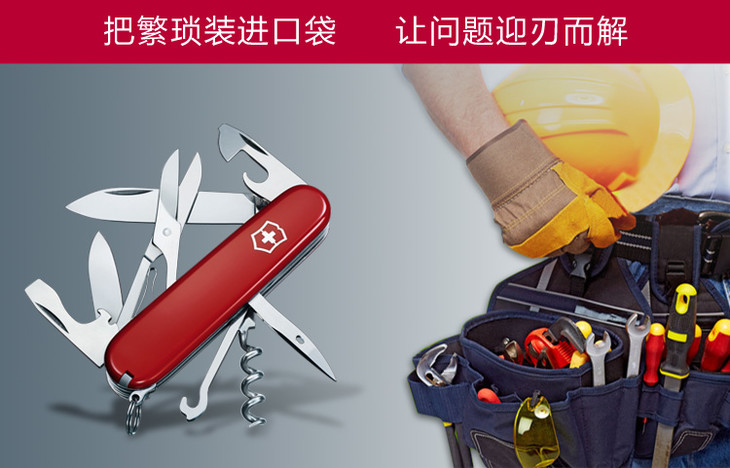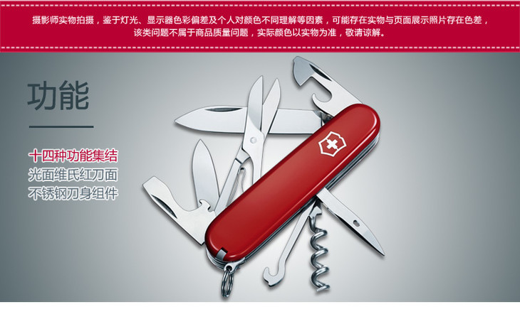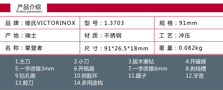 维氏军刀VI-攀登者红14<1.3703>军士刀多功能刀水果刀折叠指甲锉小剪